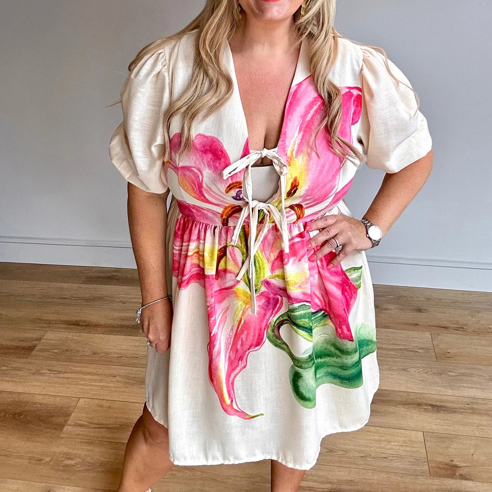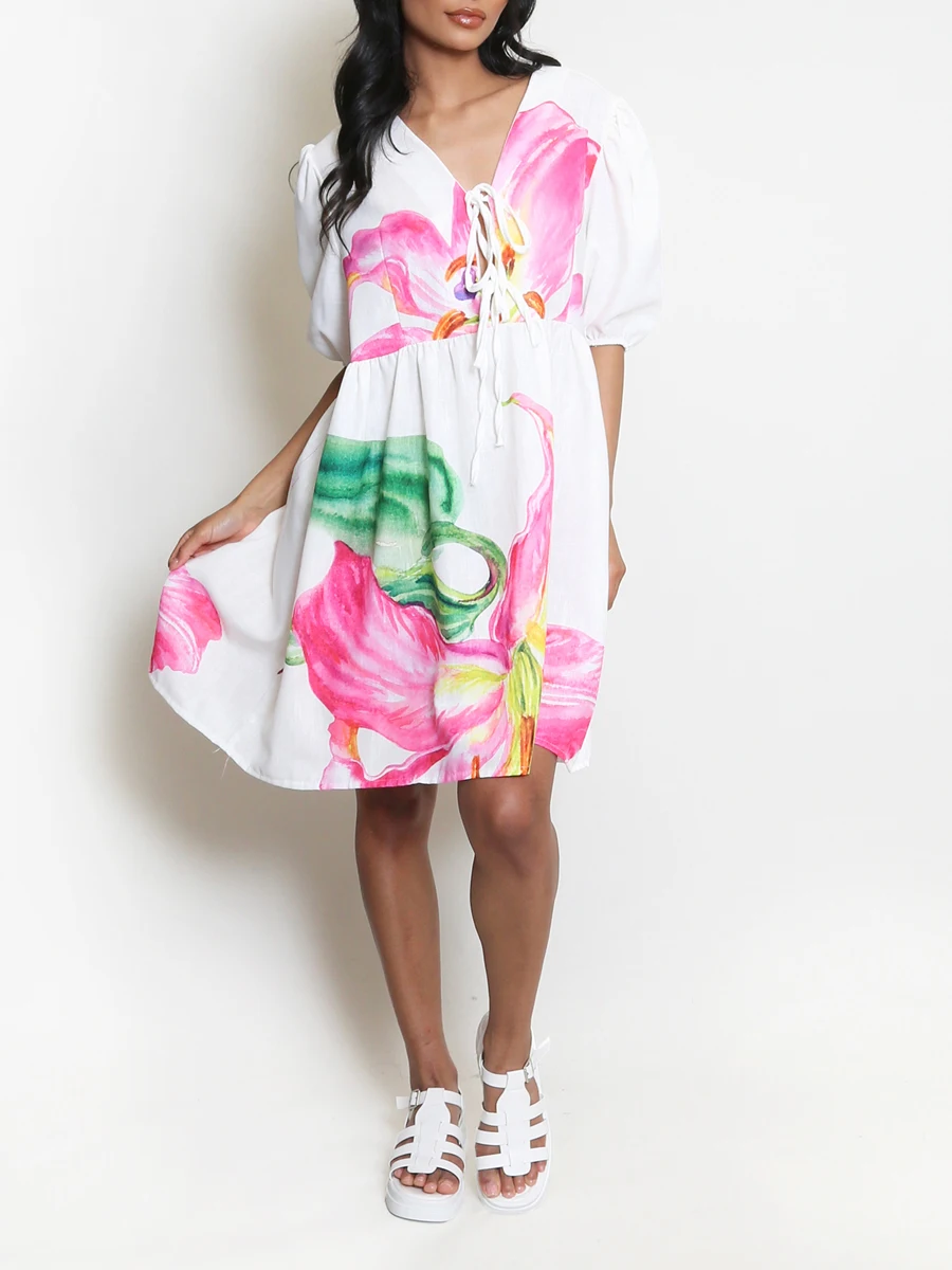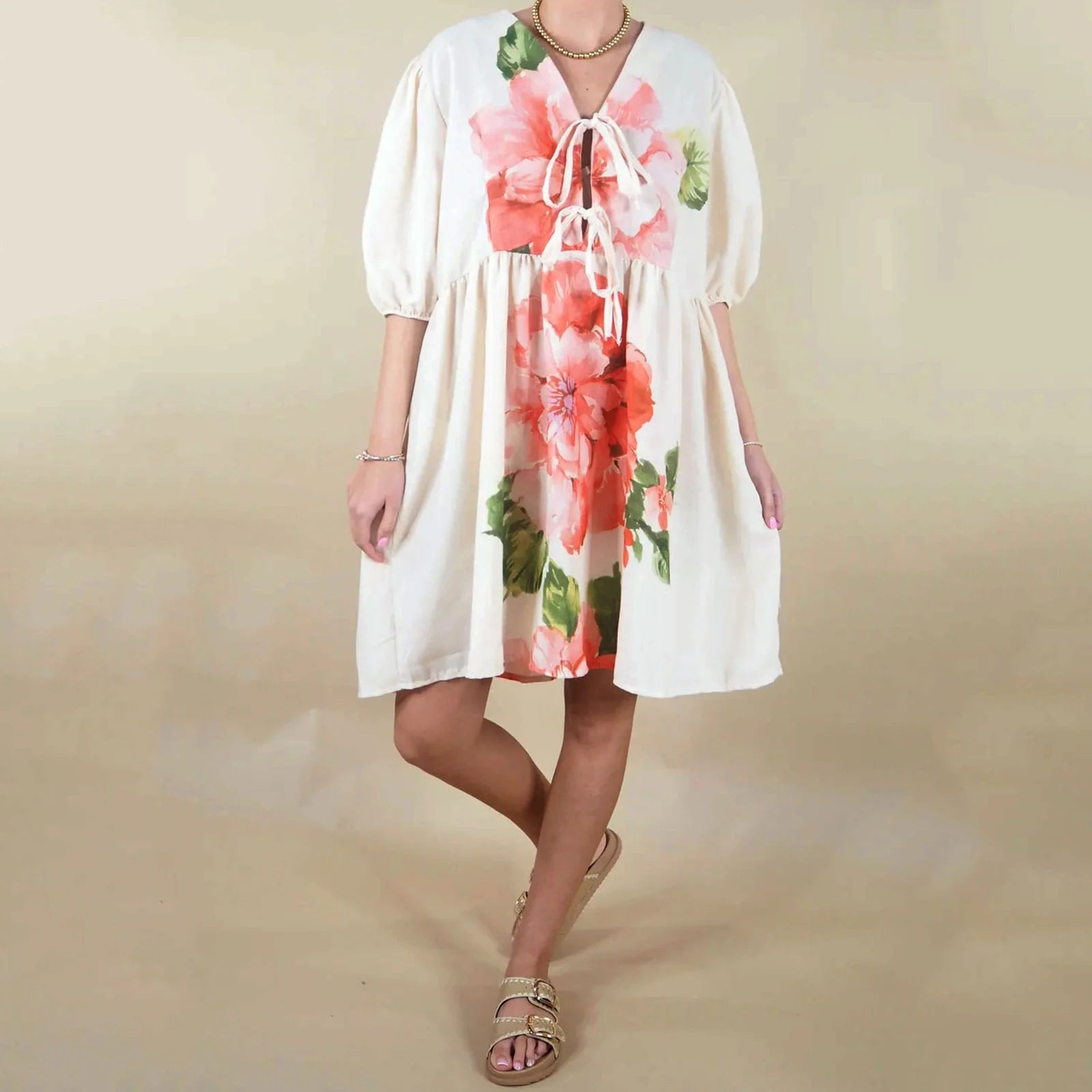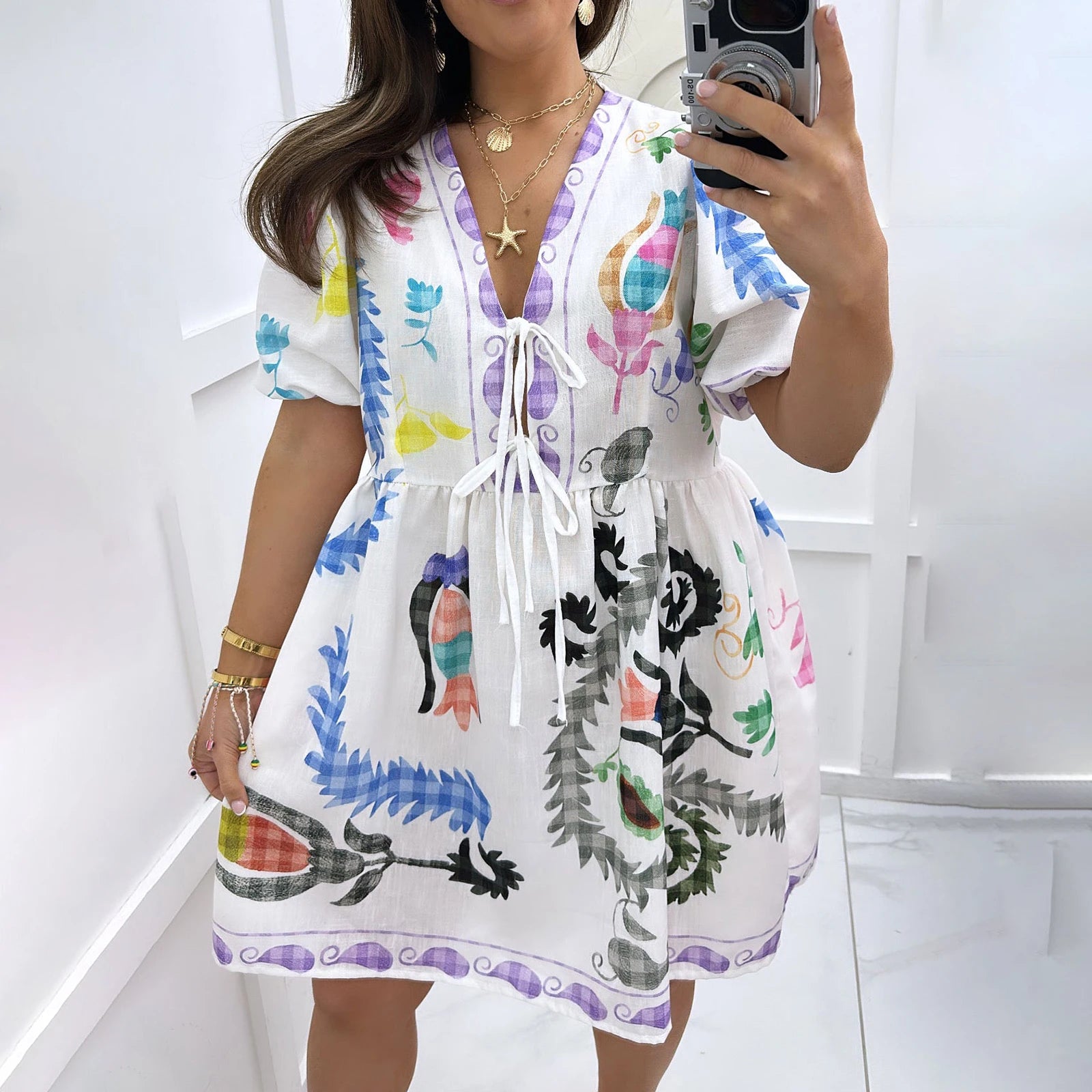Cyflymder Women's Summer A-Line Dress Floral Print Short Puff Sleeve Tie Front V-Neck Loose Fit Shirt Babydoll Dress Holiday Beach