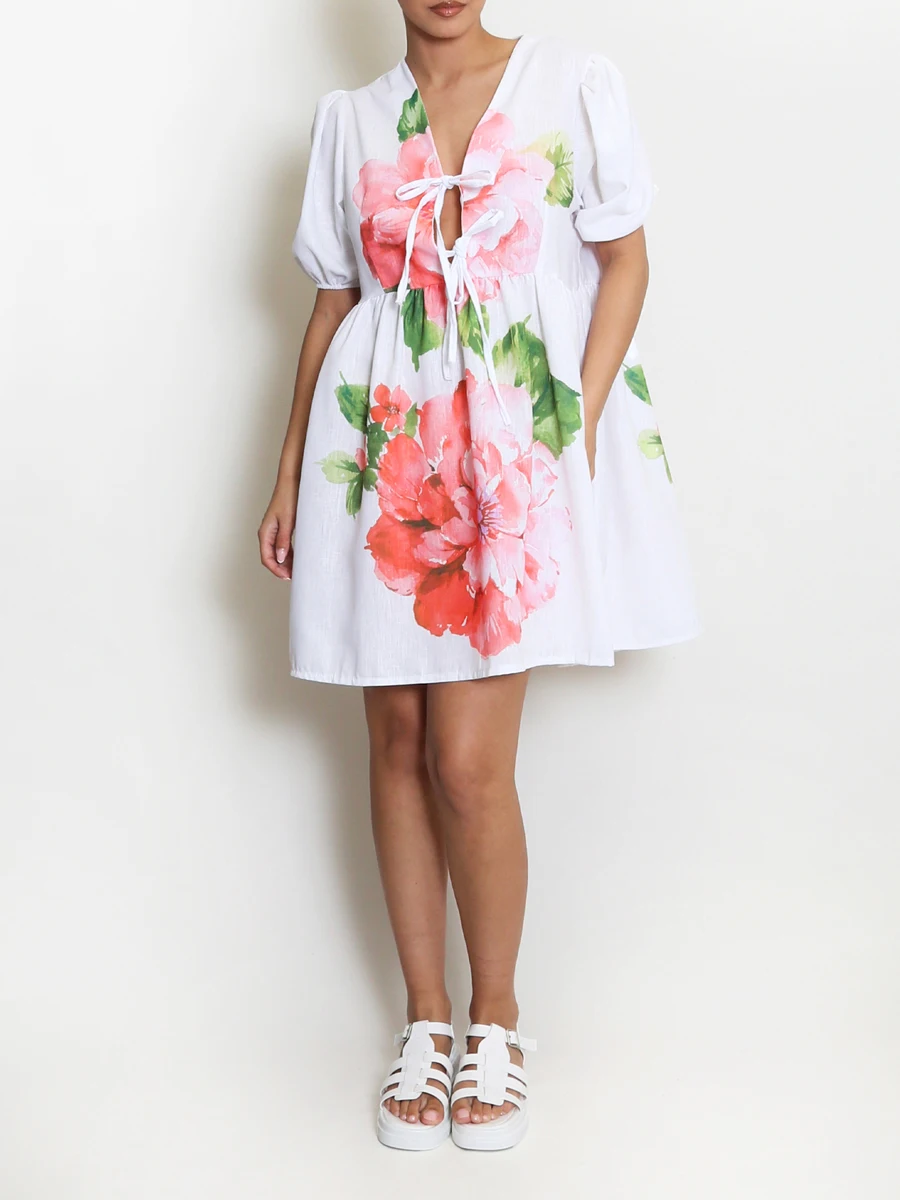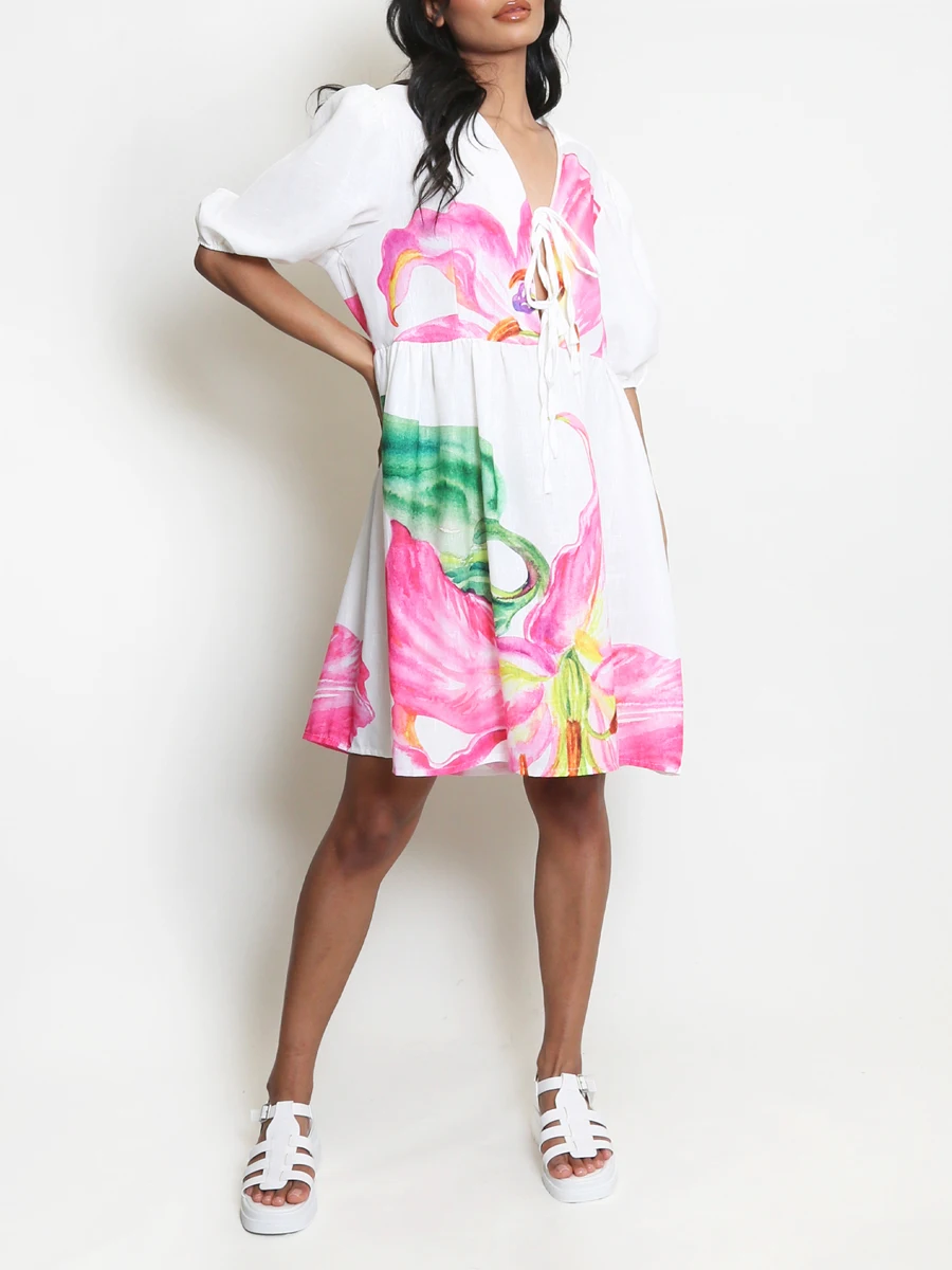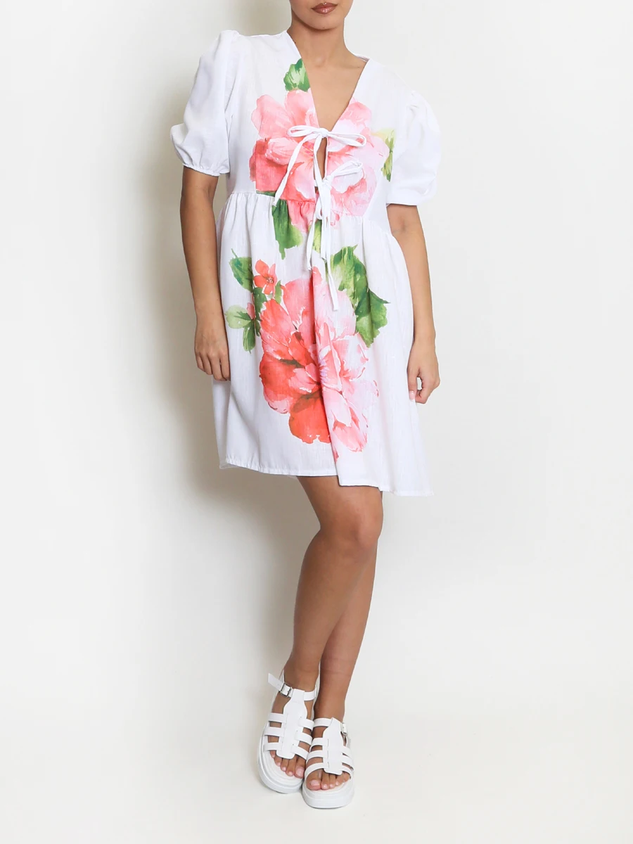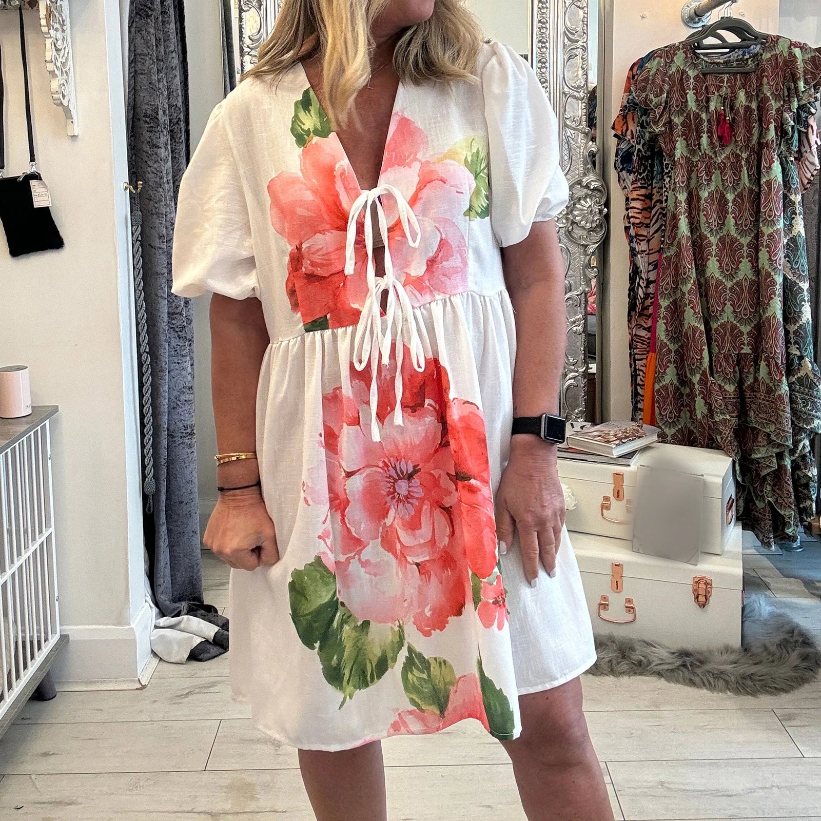 Cyflymder Women's Summer A-Line Dress Floral Print Short Puff Sleeve Tie Front V-Neck Loose Fit Shirt Babydoll Dress Holiday Beach
