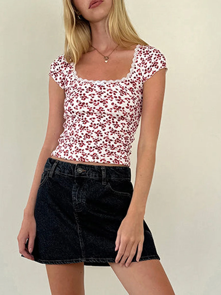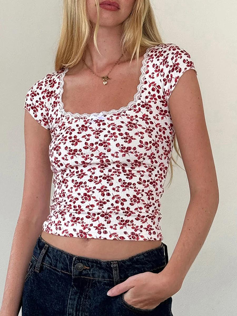 Cyflymder Womens Summer Casual Short Tops Short Sleeve Square Neck Lace Trim Flower Print T-shirt Y2k Floral Print Crop Tops