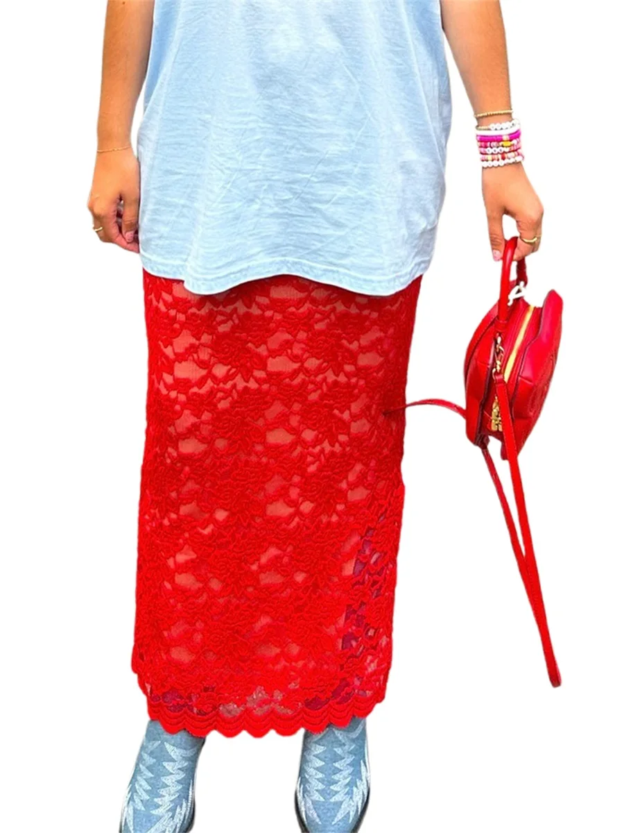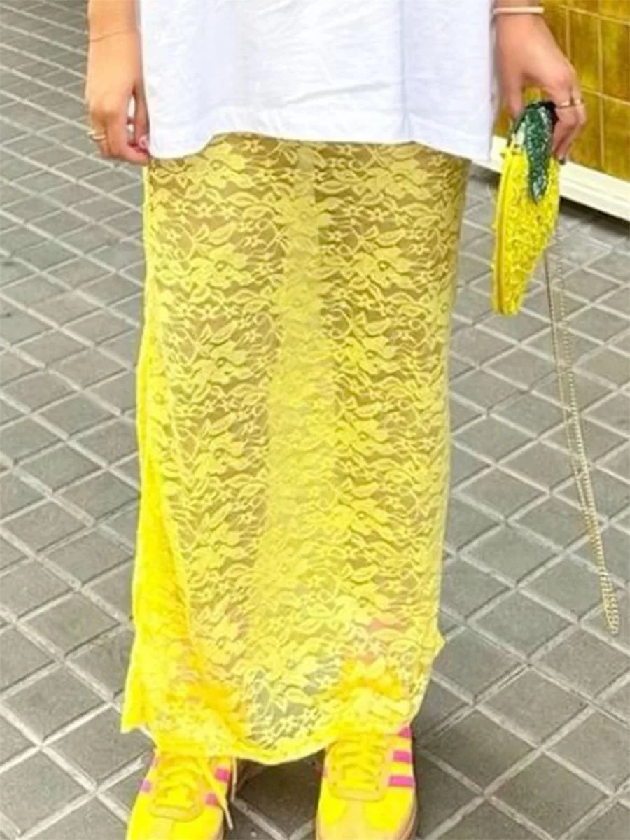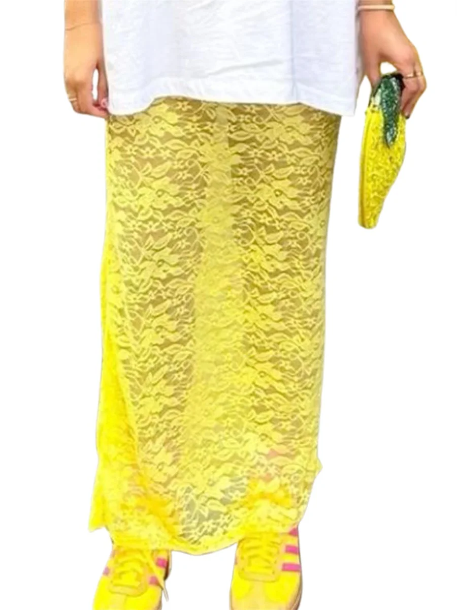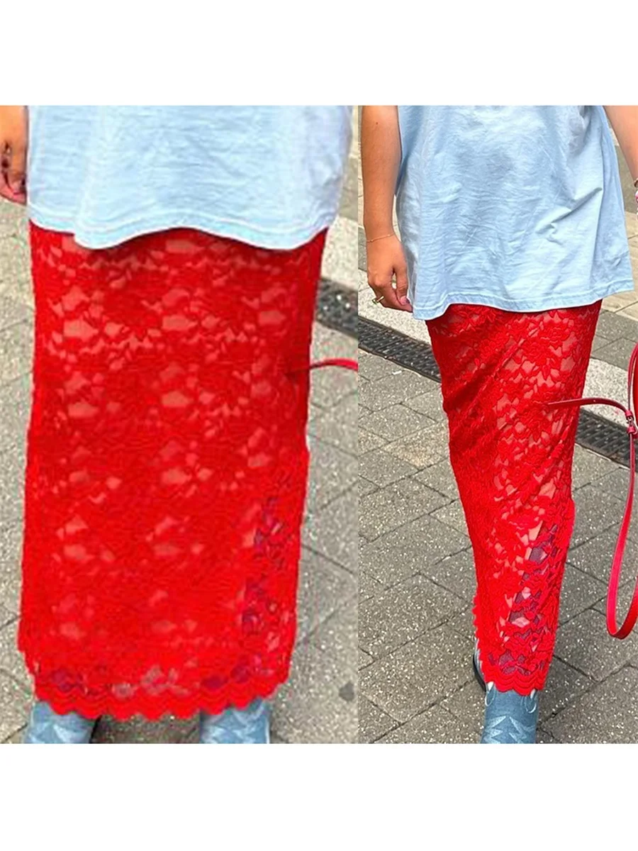 Cyflymder Women's Summer Lace Long Skirts Elegant Low Waist Solid Color See-Through Midi Skirts Slim Fit Skirts