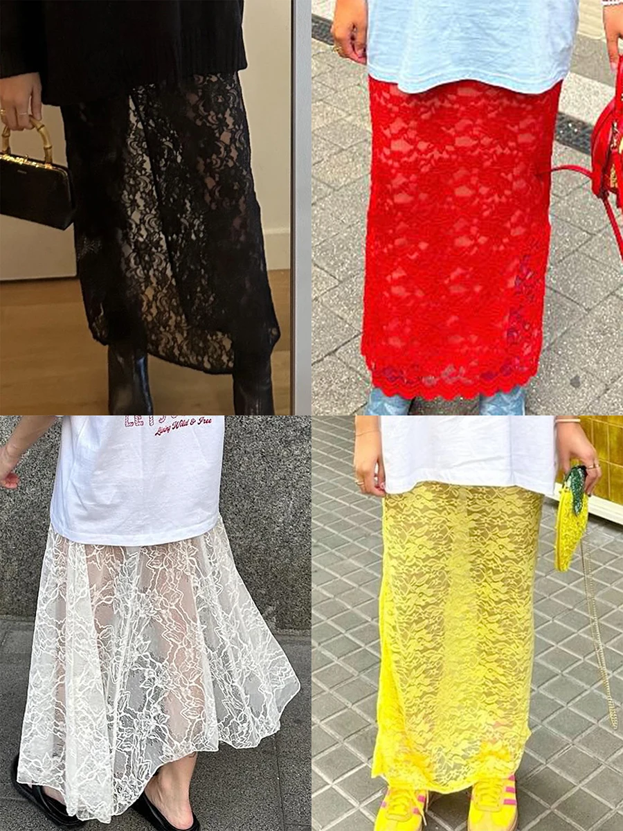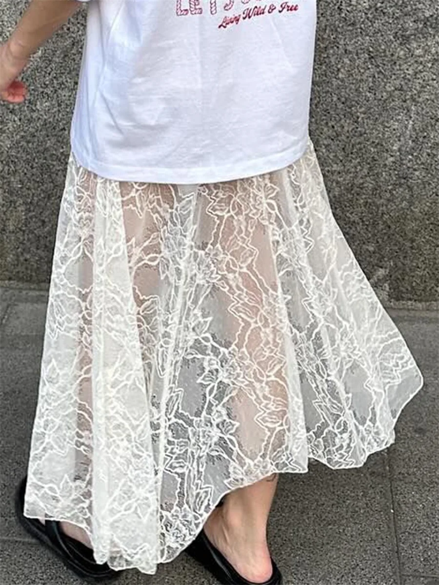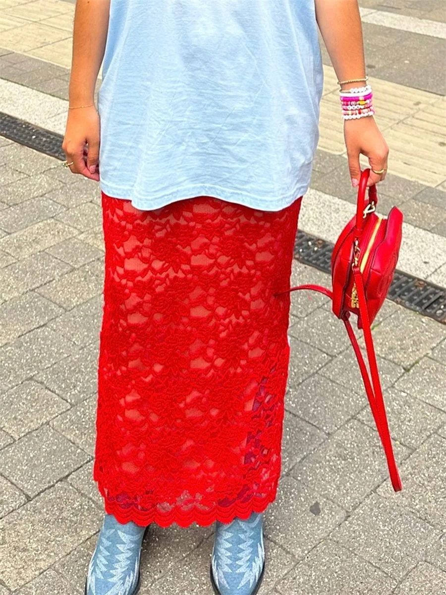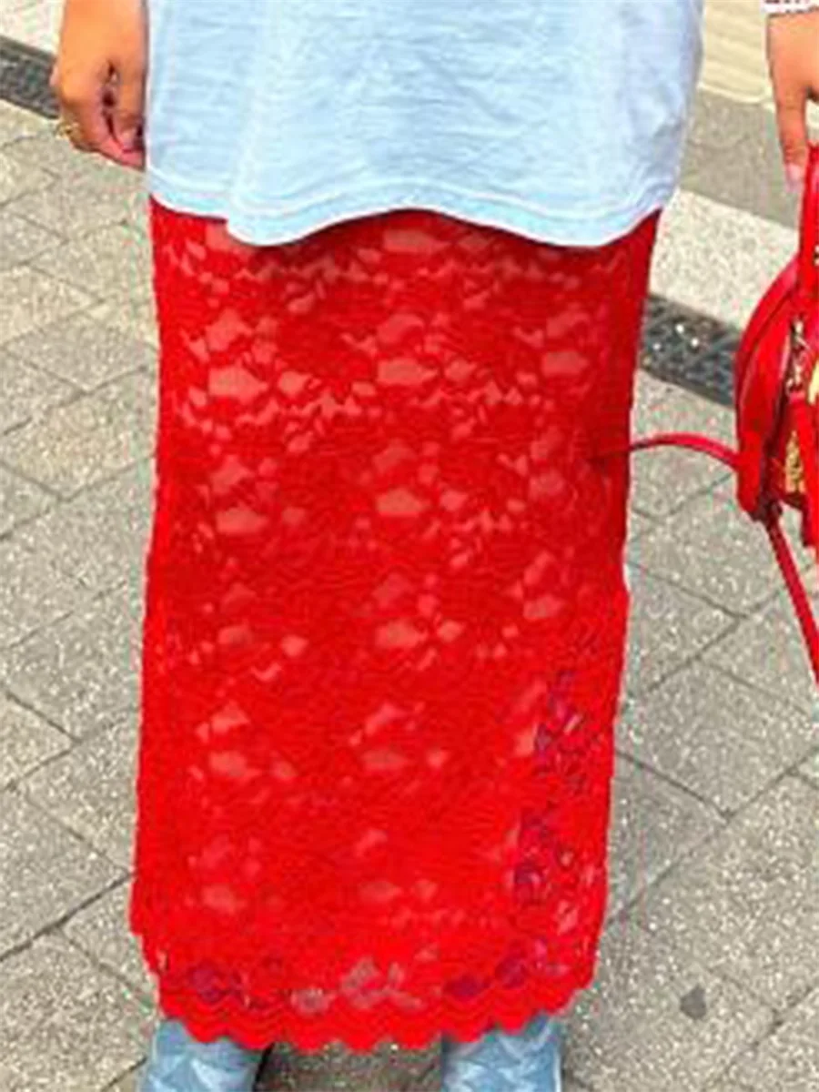 Cyflymder Women's Summer Lace Long Skirts Elegant Low Waist Solid Color See-Through Midi Skirts Slim Fit Skirts