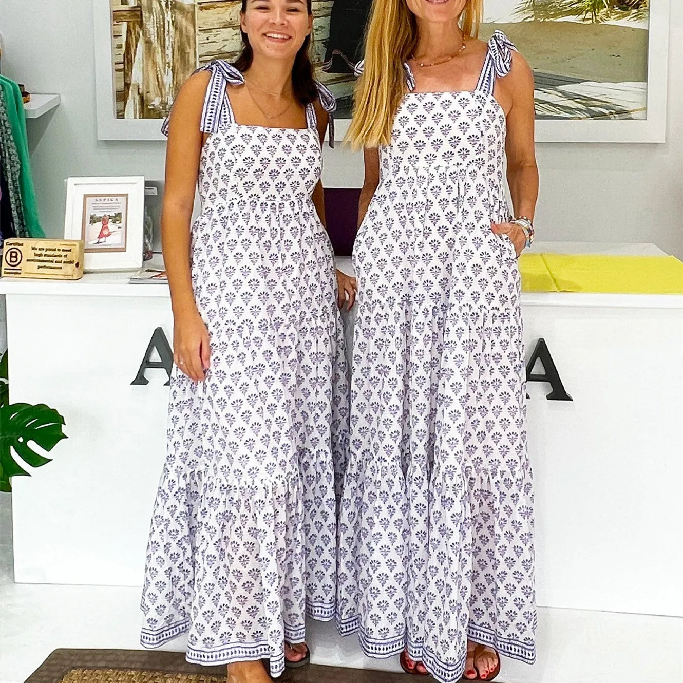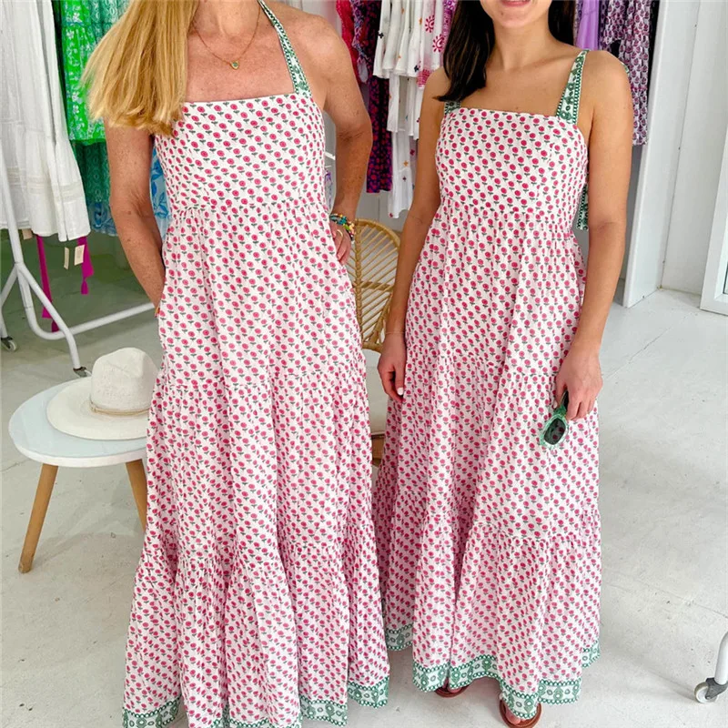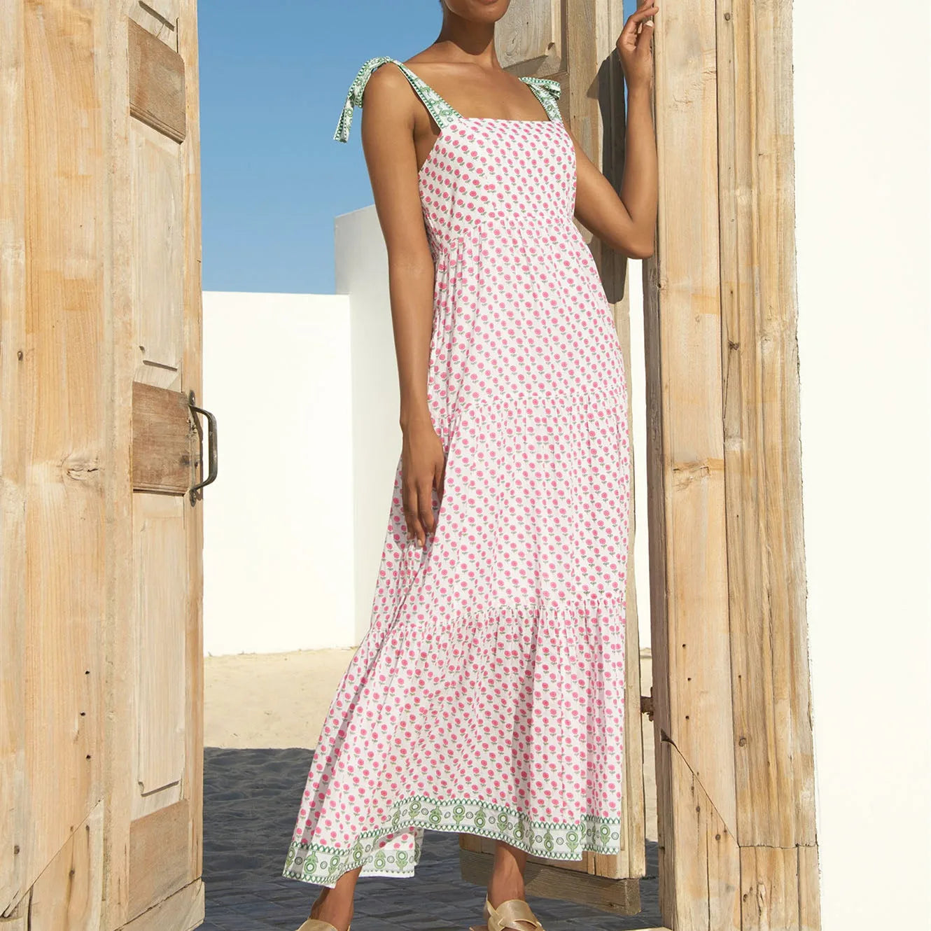 Cyflymder Women's Tie Shoulder Strap Dress Fashion Print Sleeveless Backless Long Flowy Dress for Summer Holiday Beach Sundress