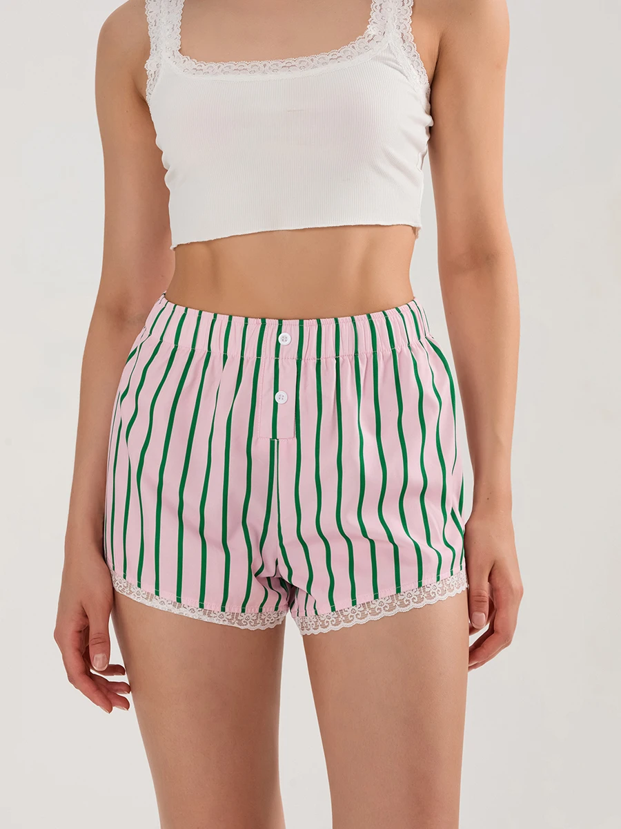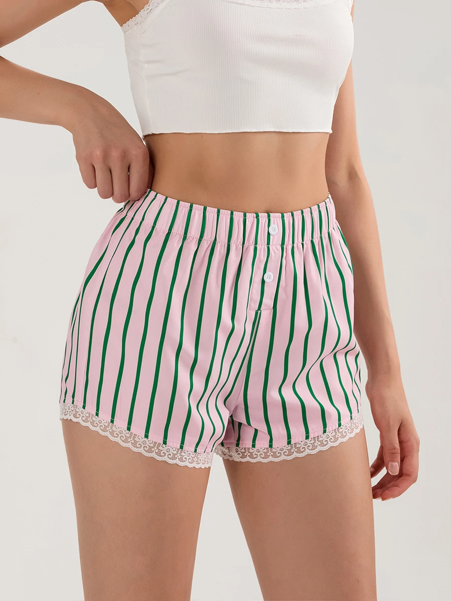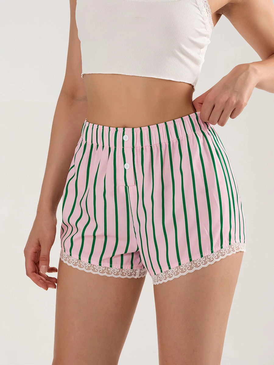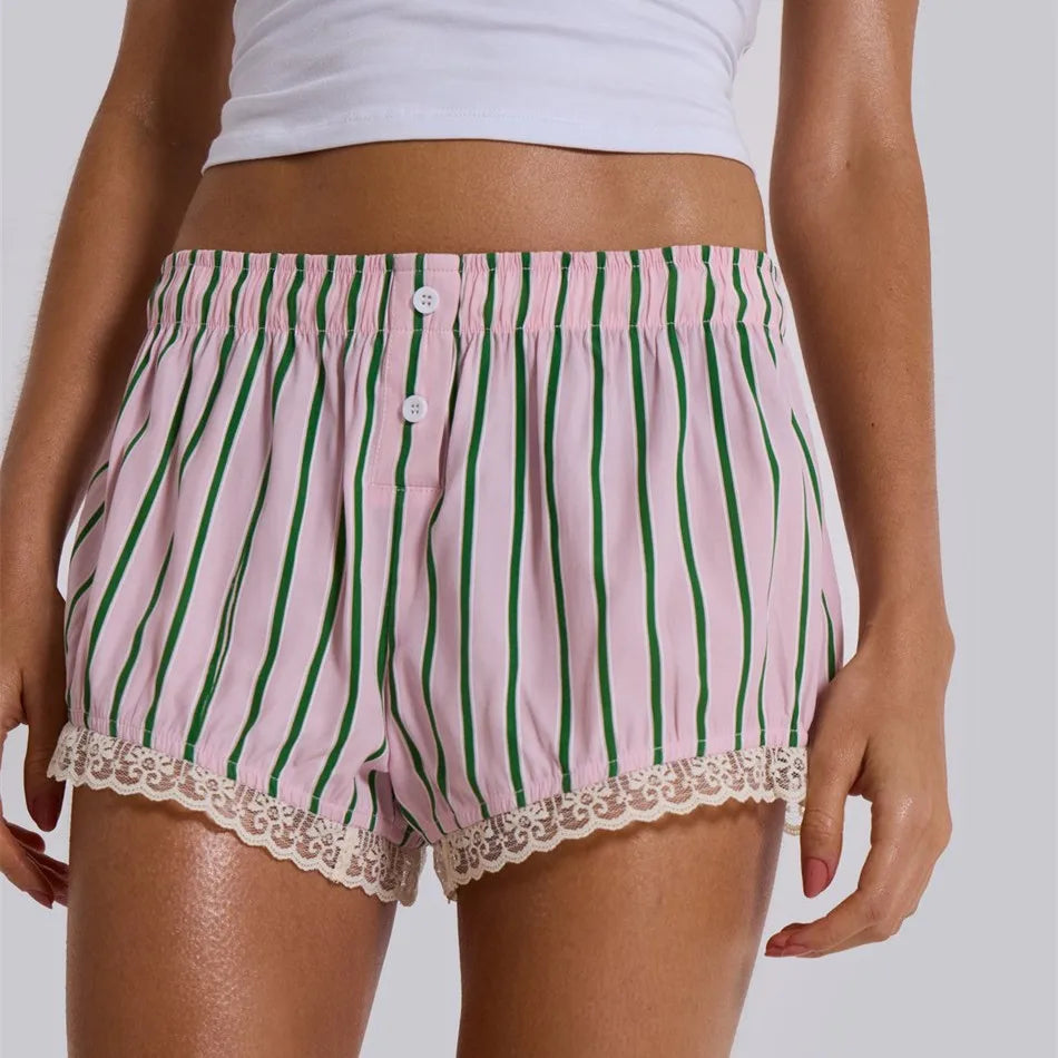 Cyflymder Y2K Boxer Shorts Women Striped Gingham Lounge Pajama Low Elastic Waist Sleep Lace Trim Micro Short Pj Mini Pants