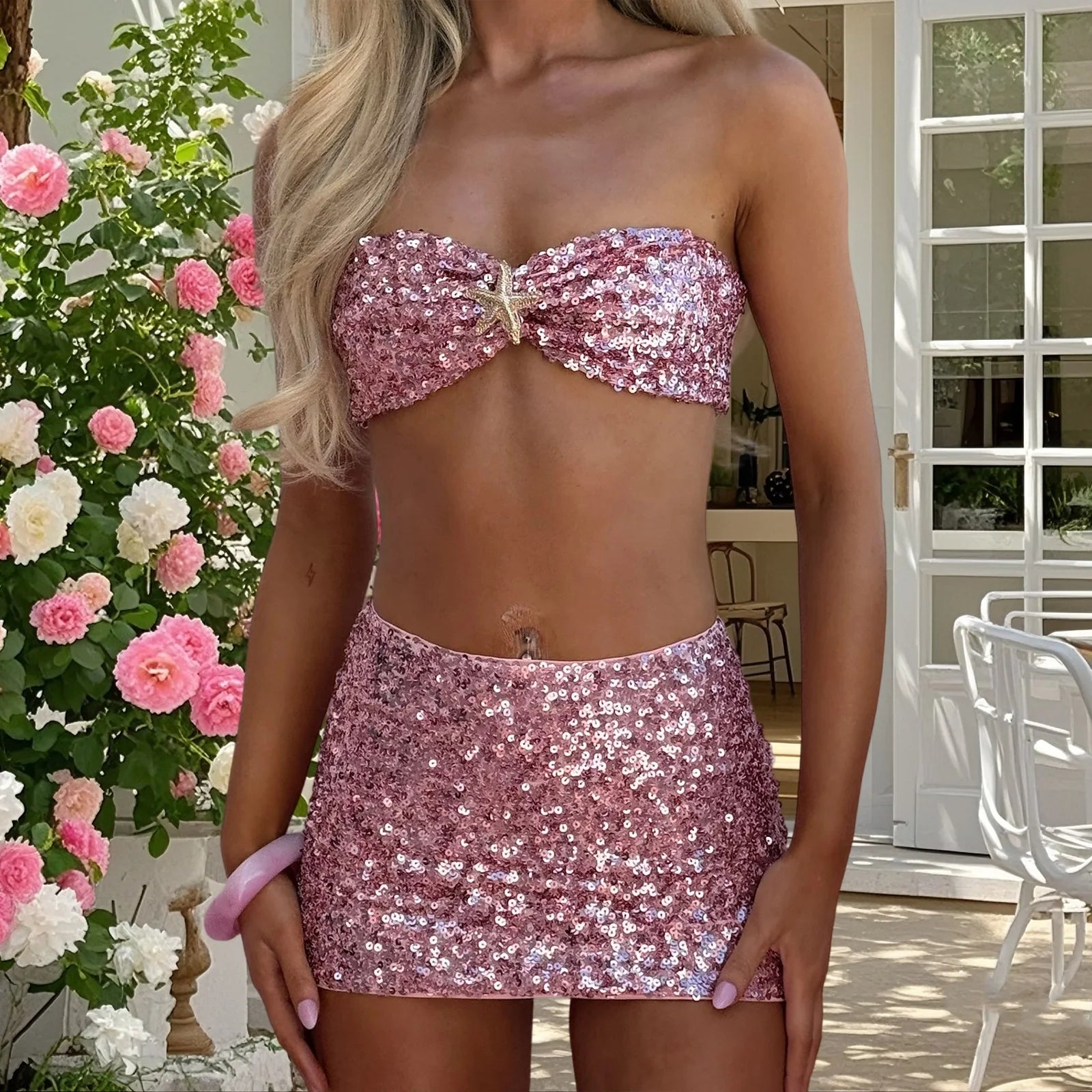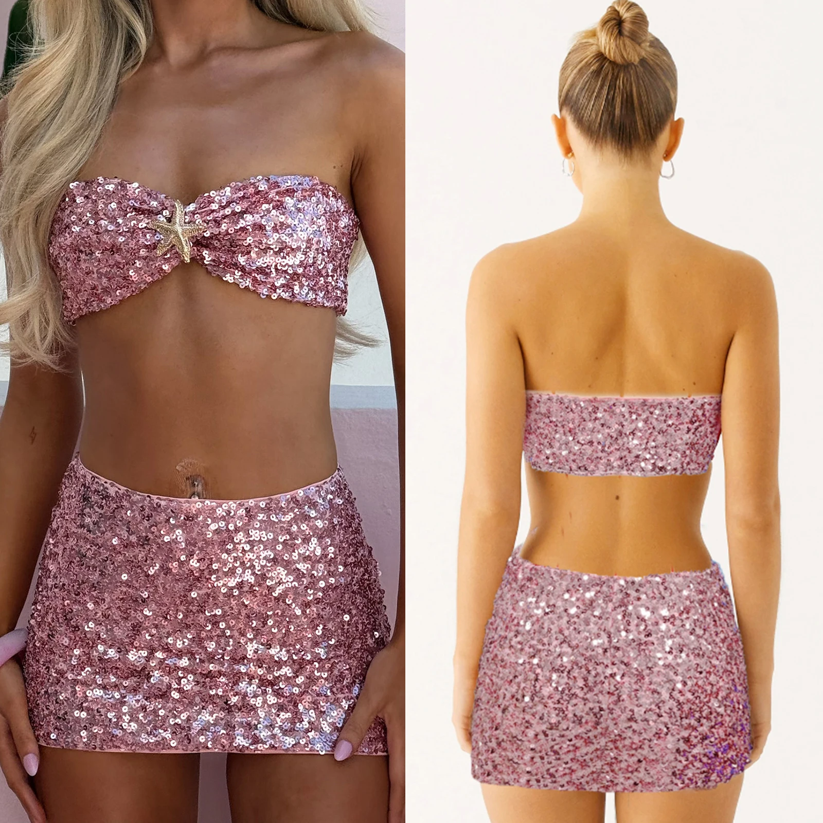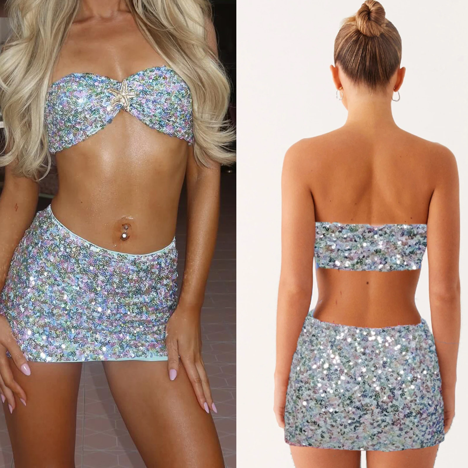 Cyflymder y2k Sequin Outfit Set Summer Women Sparkly Off Shoulder Strapless Bra Tops and Low Rise Mini Skirt Club Party Clothes