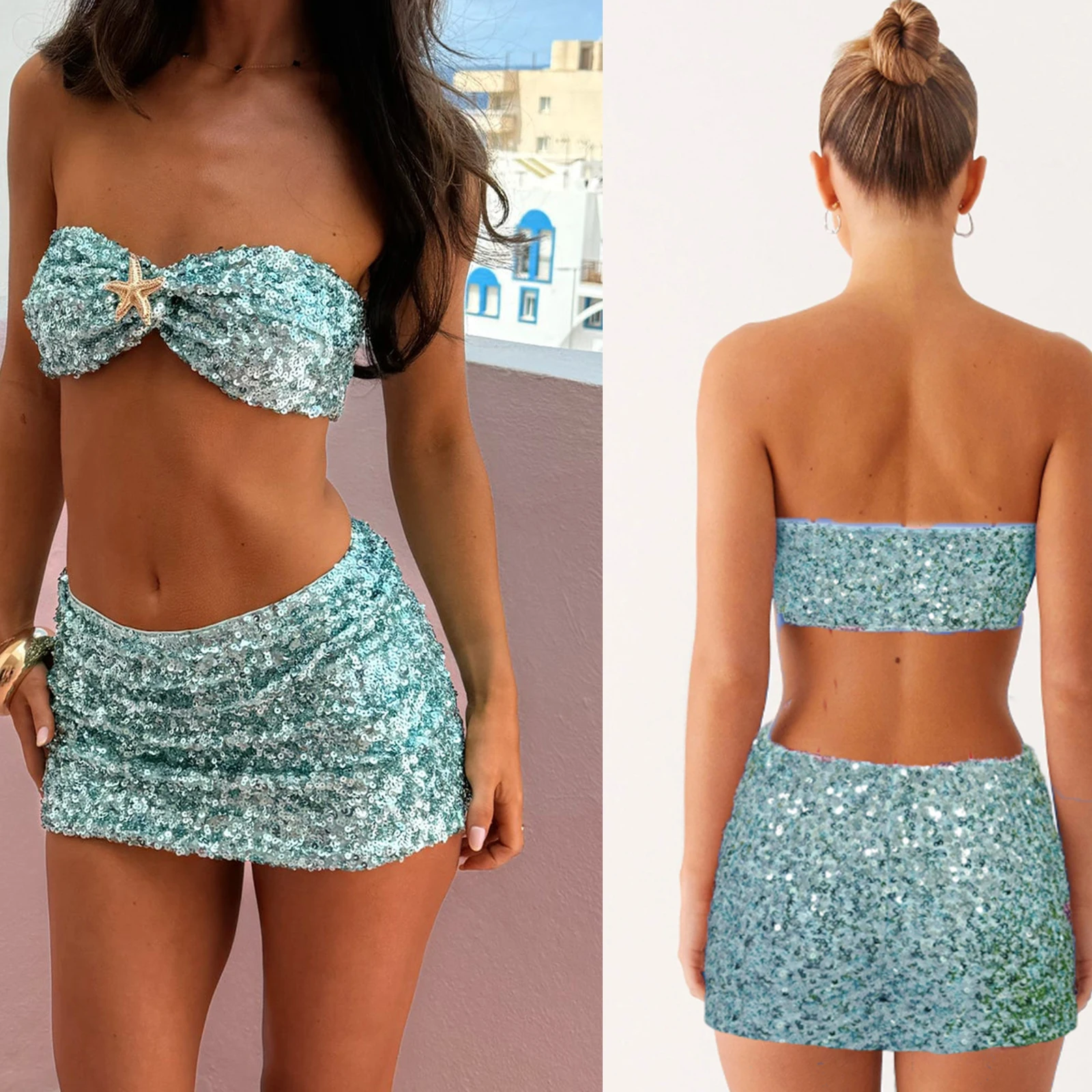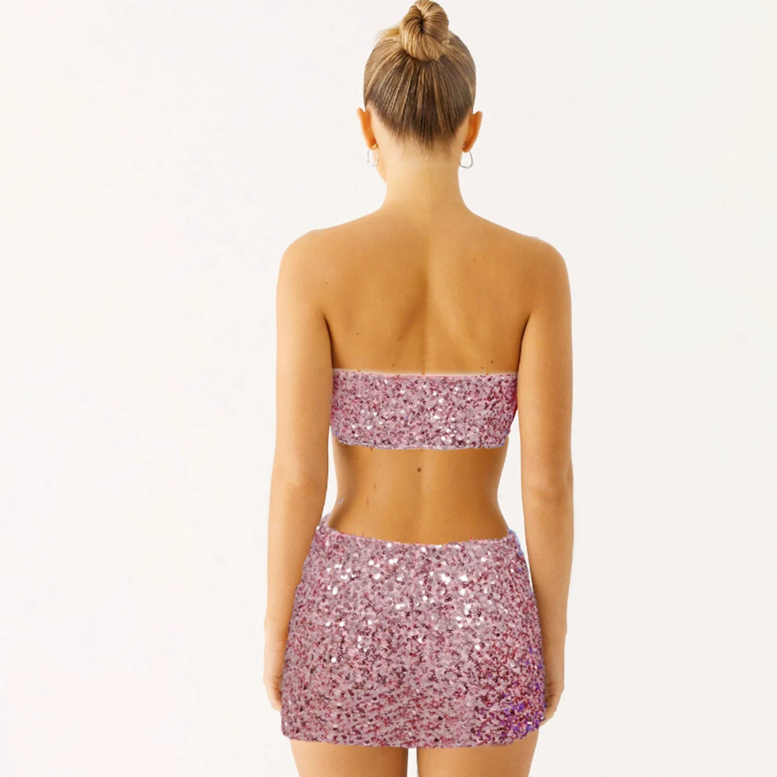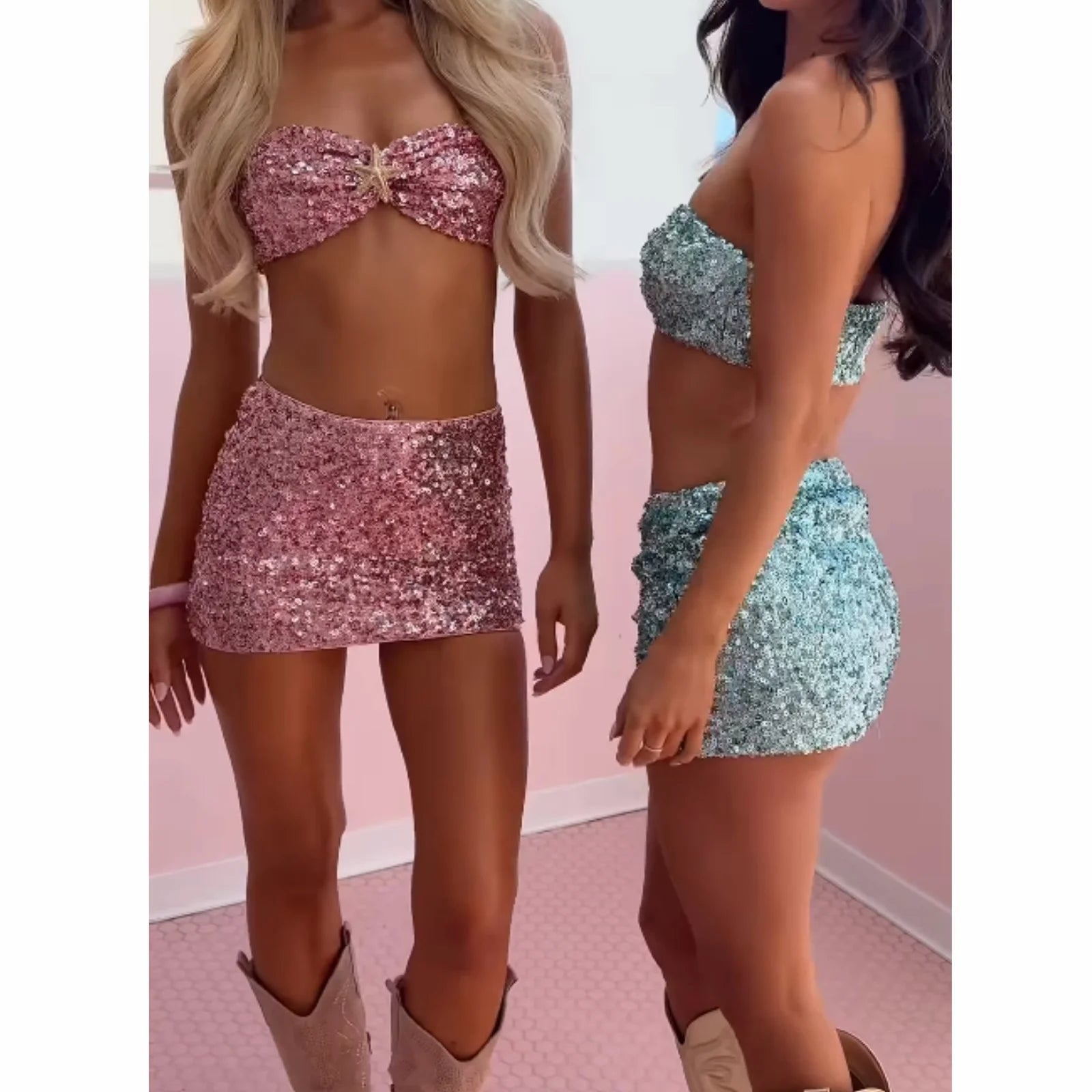 Cyflymder y2k Sequin Outfit Set Summer Women Sparkly Off Shoulder Strapless Bra Tops and Low Rise Mini Skirt Club Party Clothes
