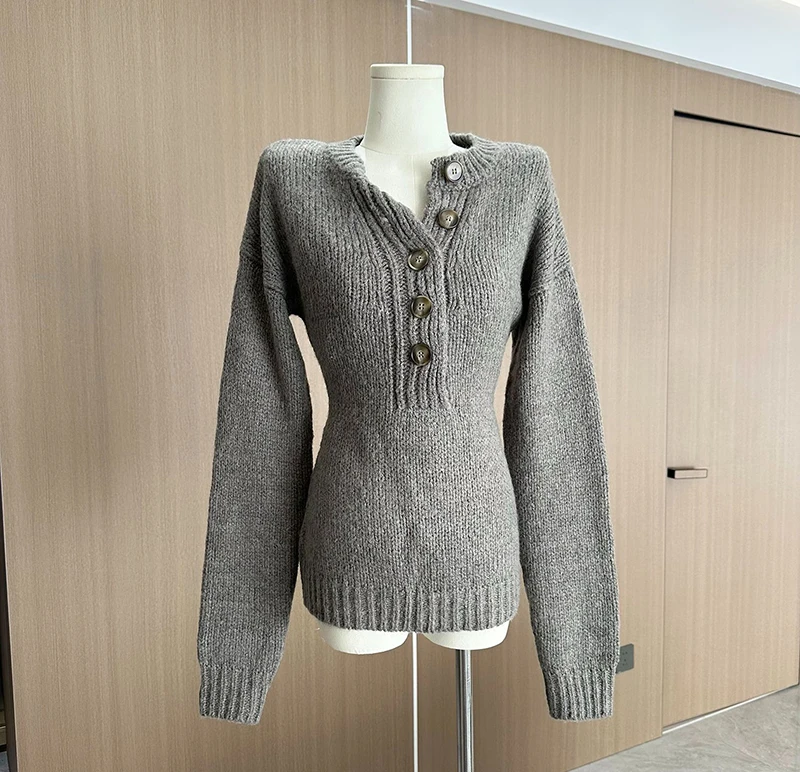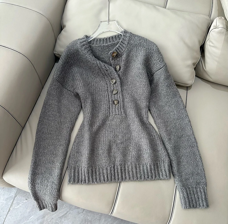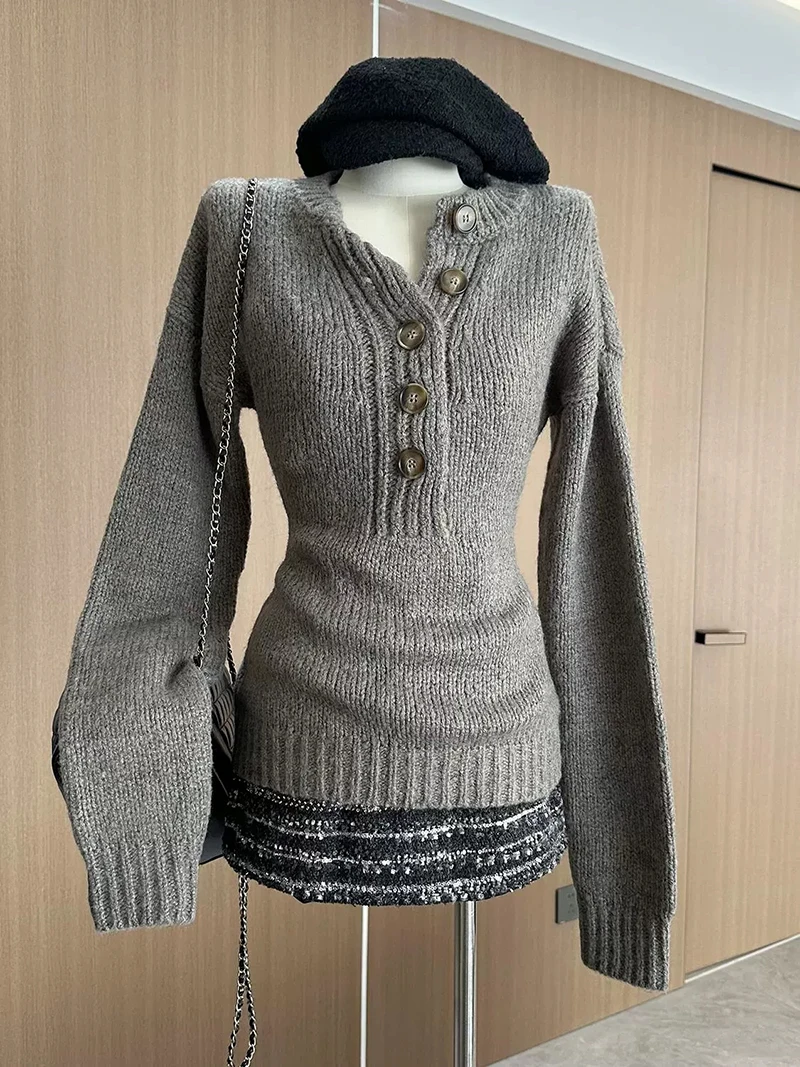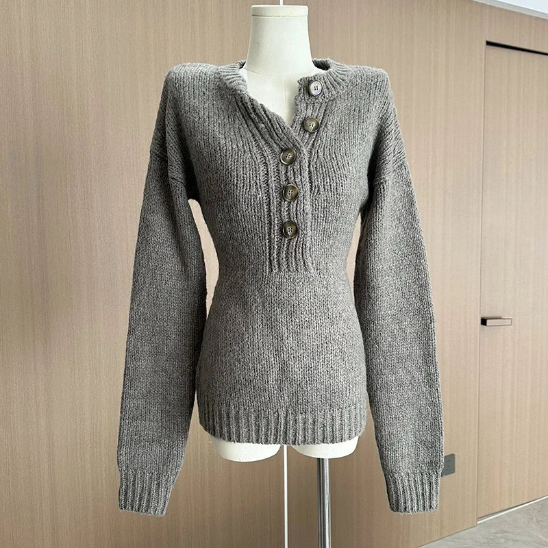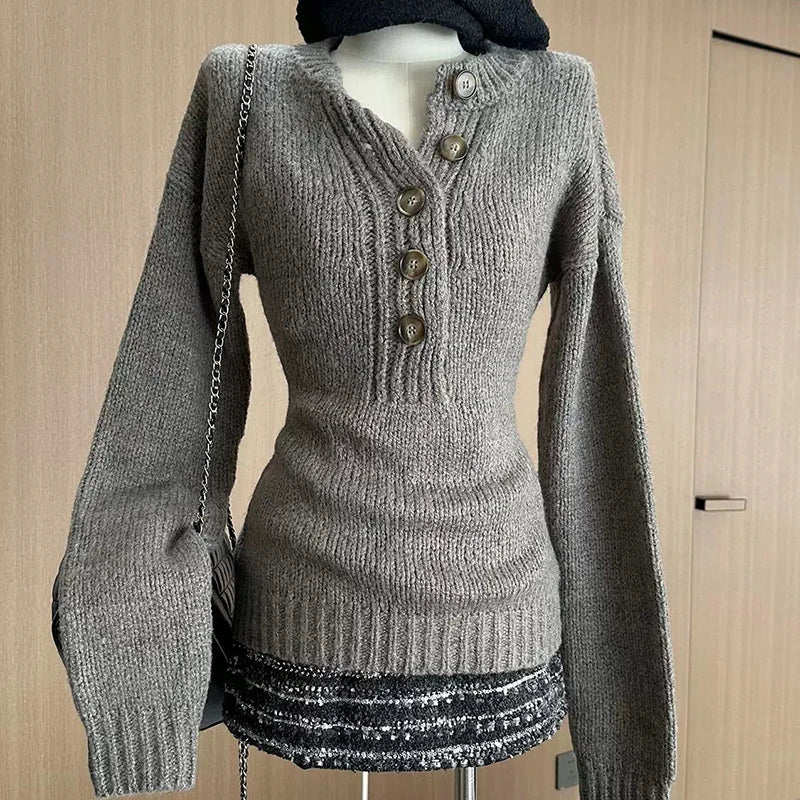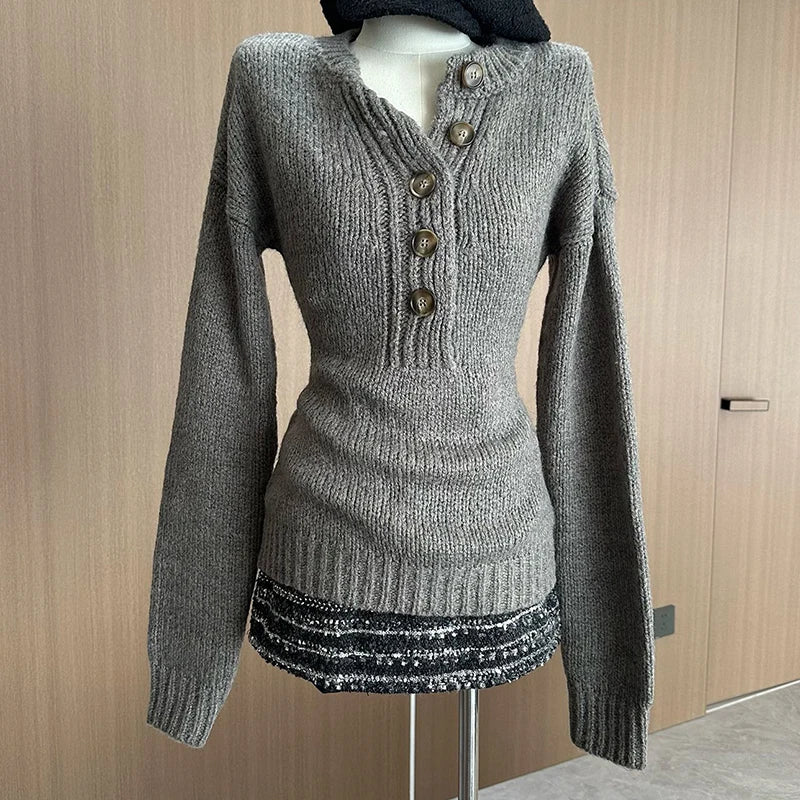 Cyflymder Y2K Slim Gray Sweaters Women Vintage O Neck Long Sleeve Knitted Jumper Casual Buttons Retro Fall Winter Simple Tops Pullover New