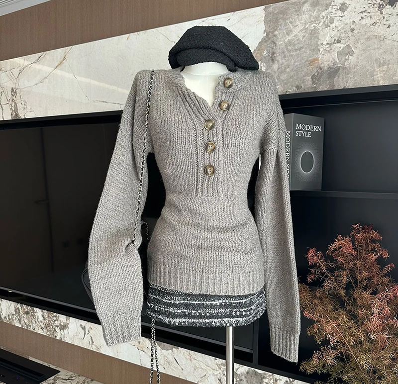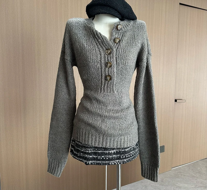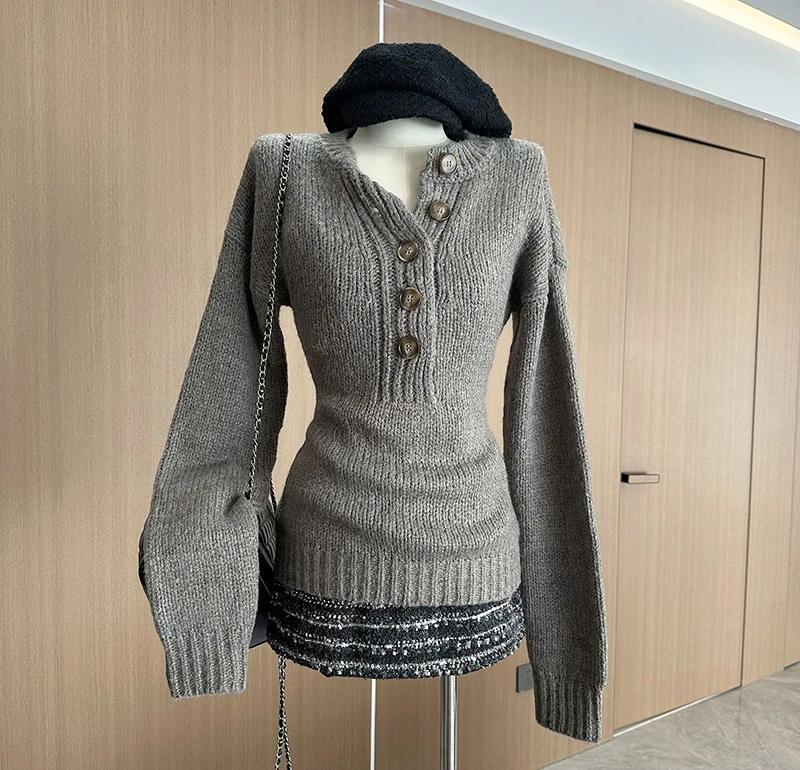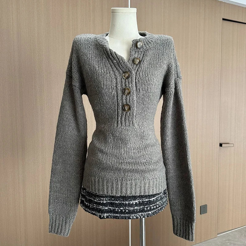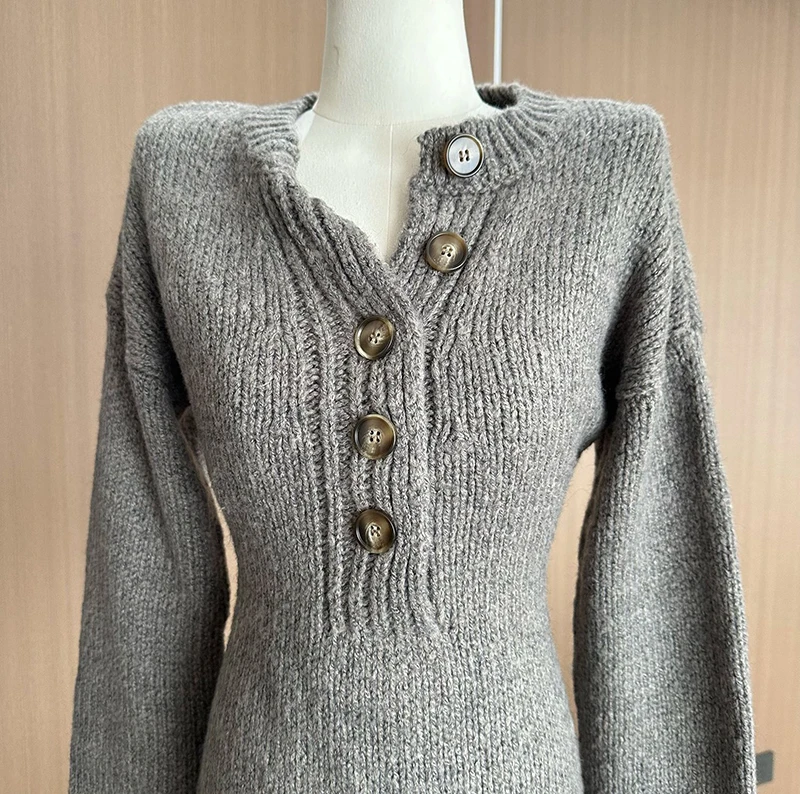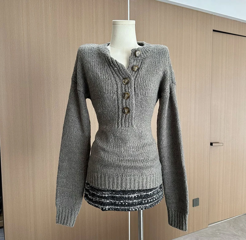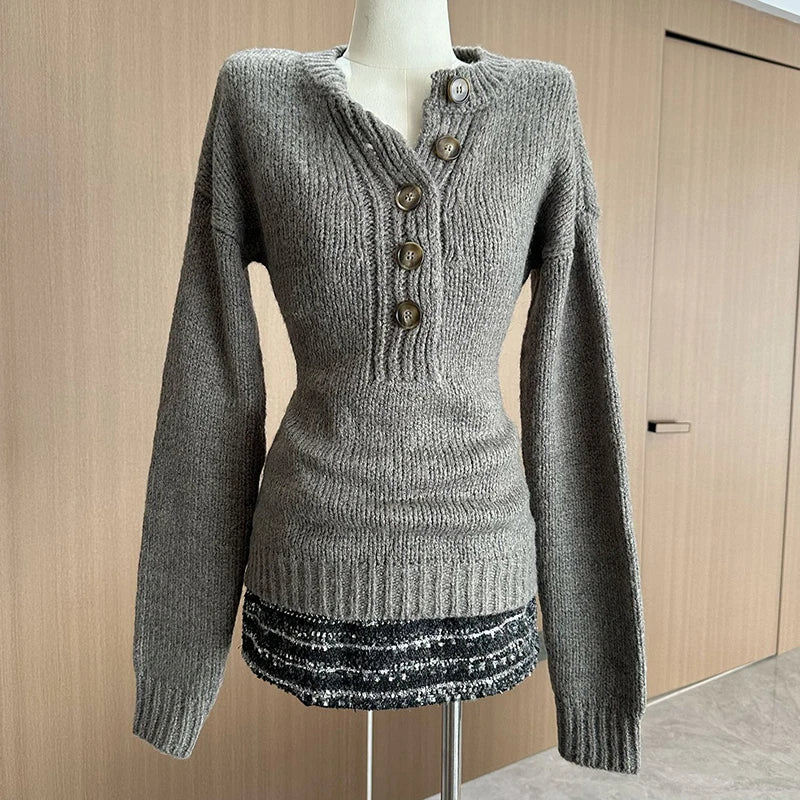 Cyflymder Y2K Slim Gray Sweaters Women Vintage O Neck Long Sleeve Knitted Jumper Casual Buttons Retro Fall Winter Simple Tops Pullover New