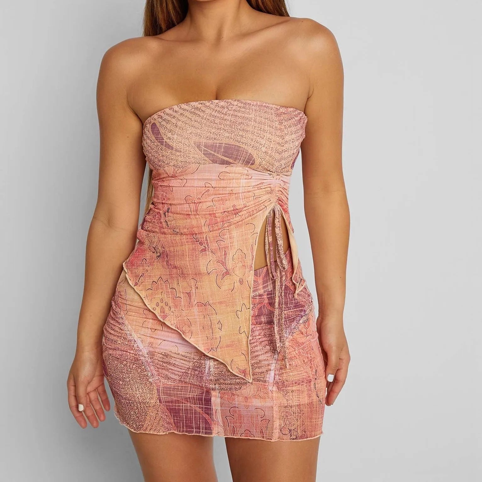 Cyflymder Y2K Two Piece Outfit Women Vintage Printed Strapless Tube Top Mesh Bodycon Mini Skirt Set Aesthetic Grunge Streetwear
