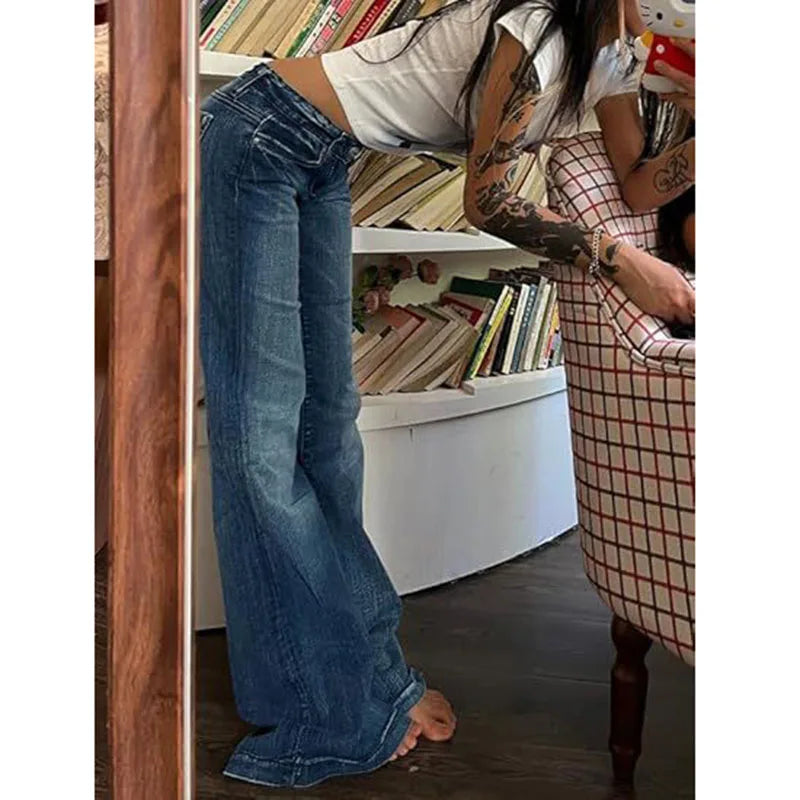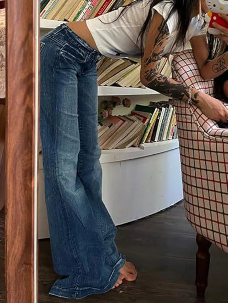 Cyflymder Y2K Vintage Flare Jeans for Women Sexy Low Rise Slim Fit Stretch Washed Denim Pants Harajuku Streetwear Wide Leg Jean Trousers