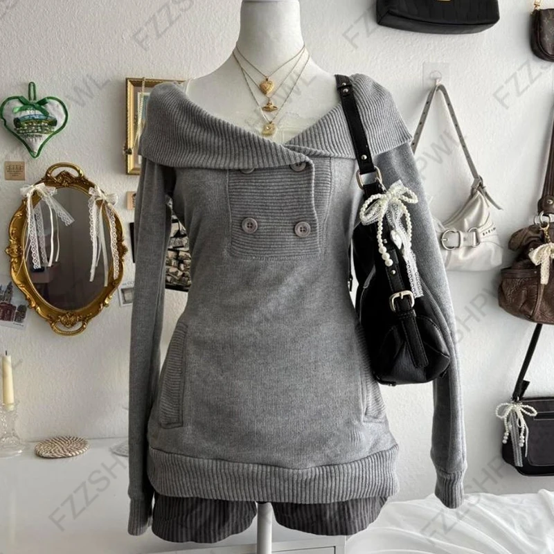 Cyflymder Y2K Women's Autumn and Winter Knitted Pullover Casual Loose Chic Solid Color Button Open Lapel Sweater Office Lady Commuter Wear