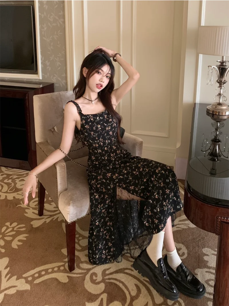 Y2k Vintage Black Floral Dresses Women Korean Irregular Split Sexy Sleeveless Mesh Camis Dress Thin Slim Summer Female