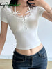 Halter Neck Lace Trim Bow Cute Black Y2K T-Shirt Women Button Up Slim Short Sleeve White Tees Sweet Balletcore Clothing