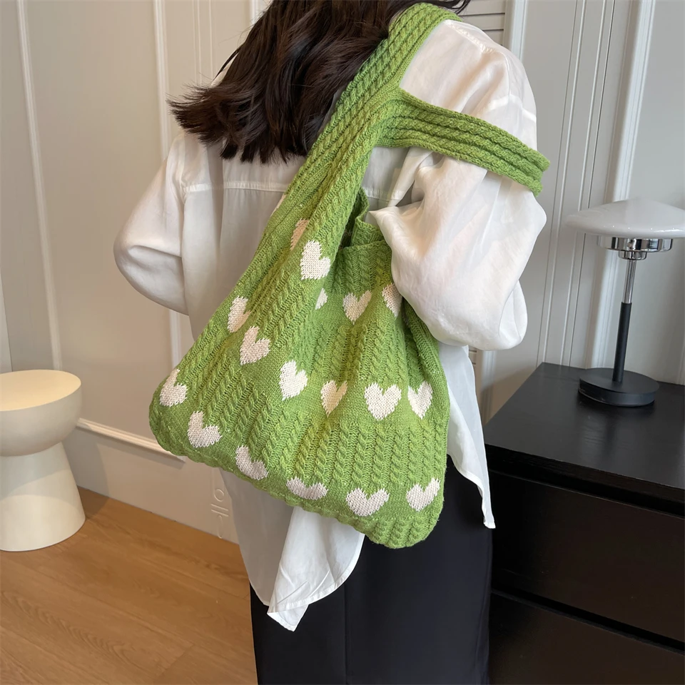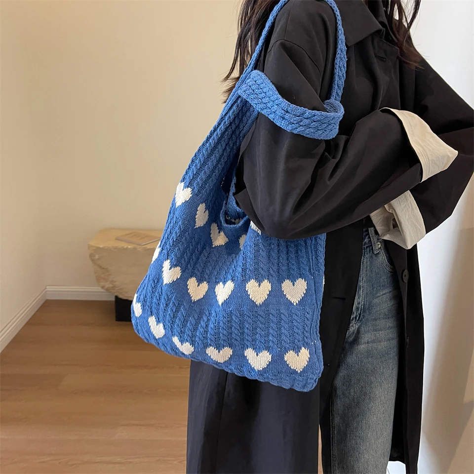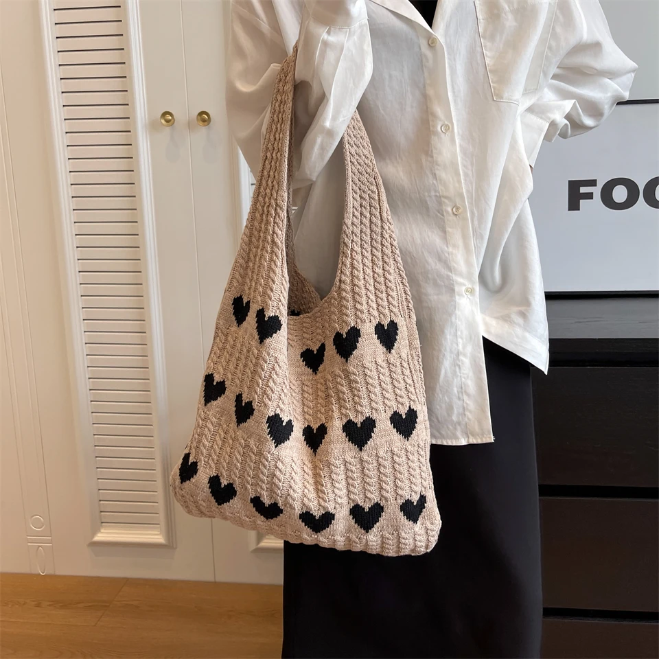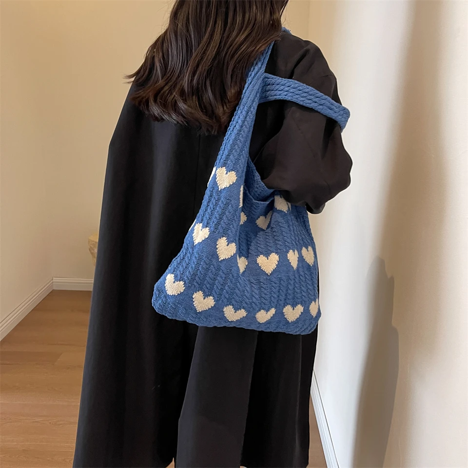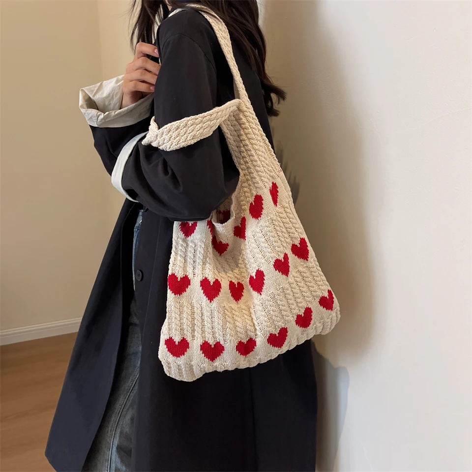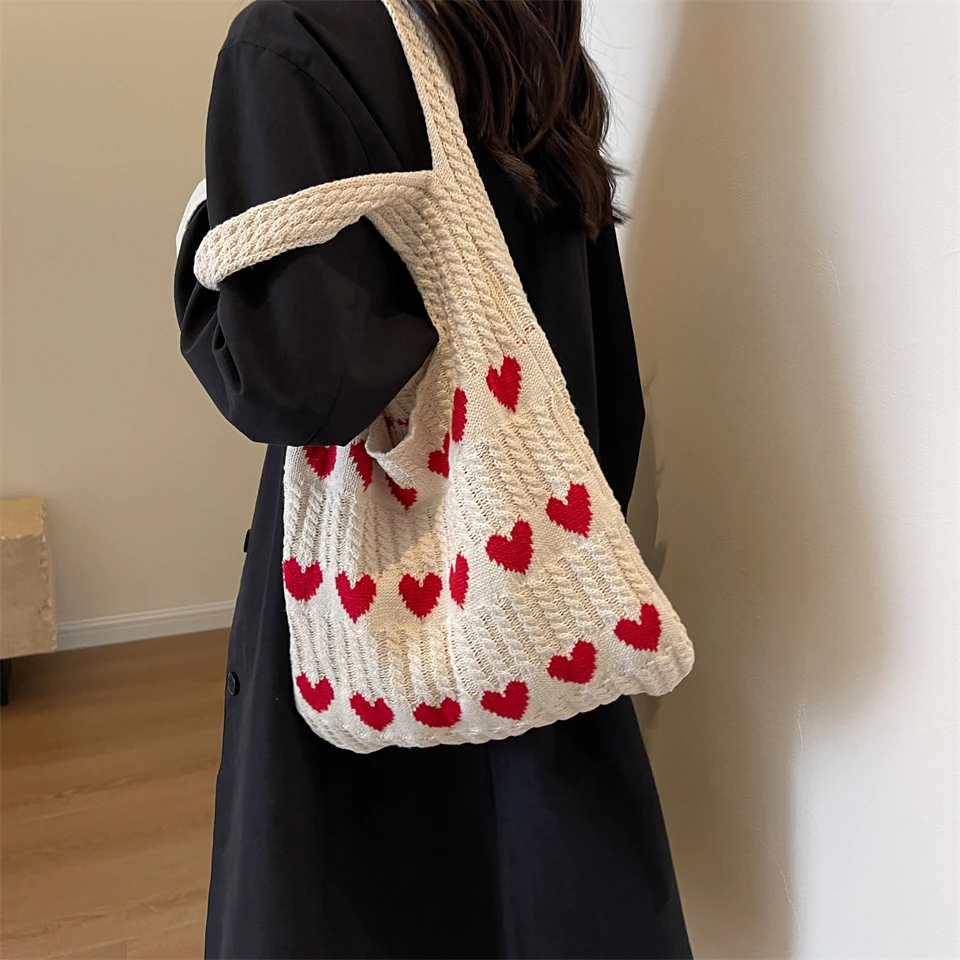 Heart Knit Women's Bag Knitted Eco Bag Korean Fashion Shopping Y2K Crochet Rope Shoulder Bag Female Knitting Handbag Tote Bags