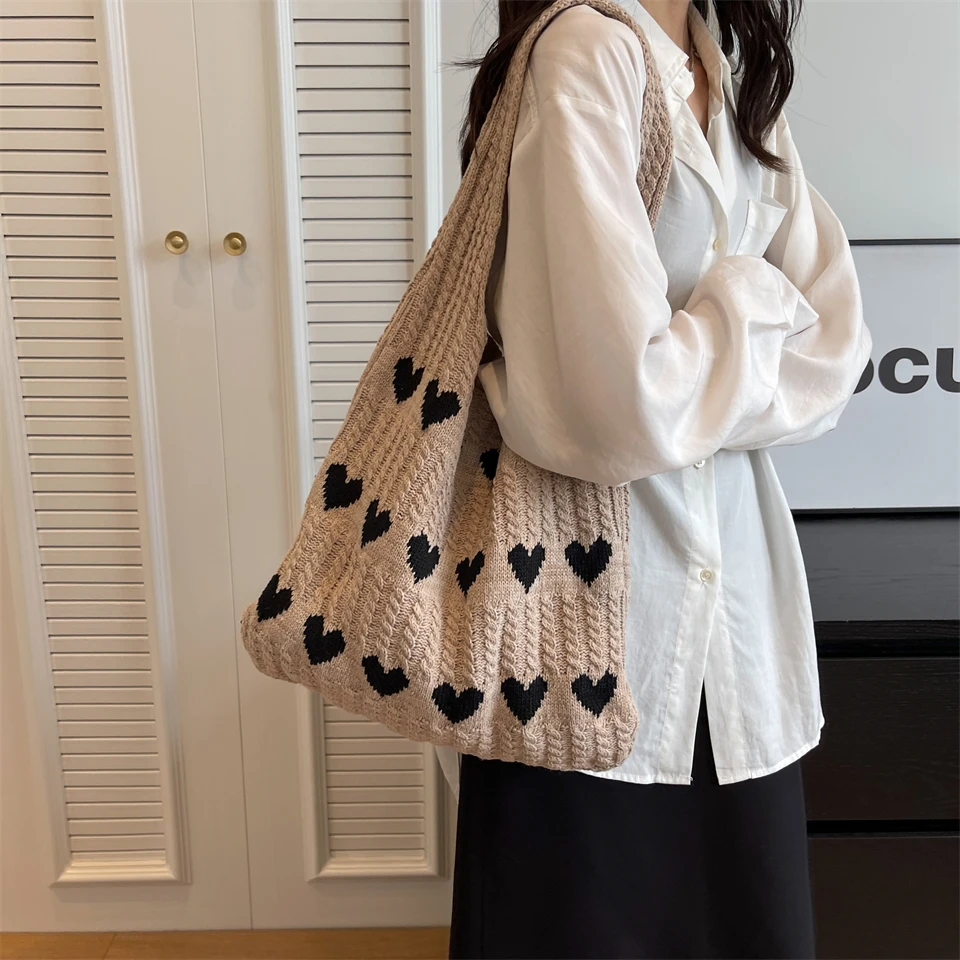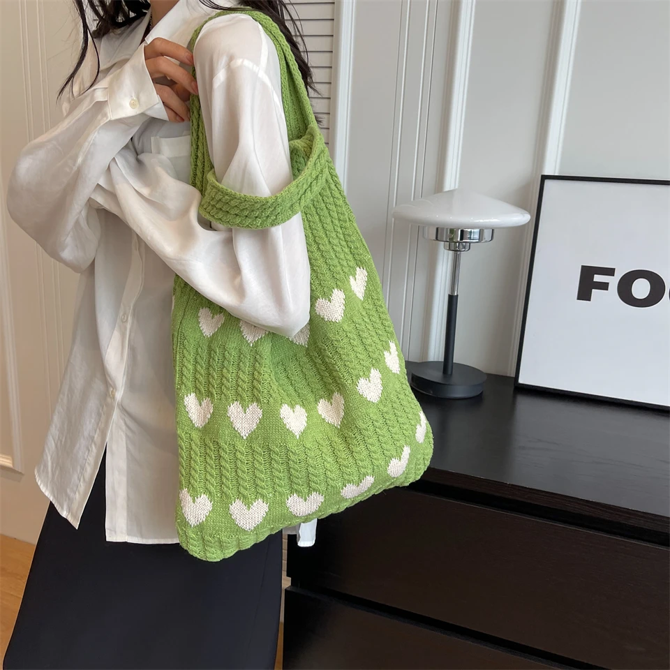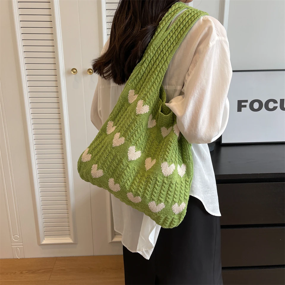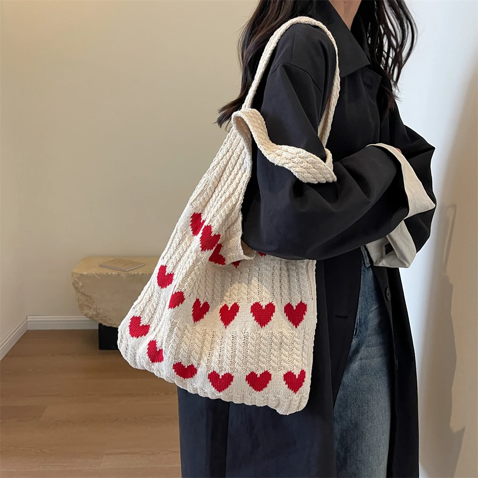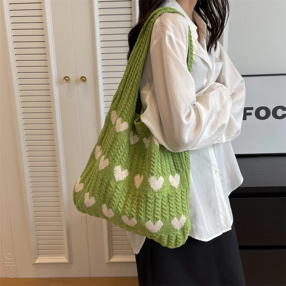 Heart Knit Women's Bag Knitted Eco Bag Korean Fashion Shopping Y2K Crochet Rope Shoulder Bag Female Knitting Handbag Tote Bags