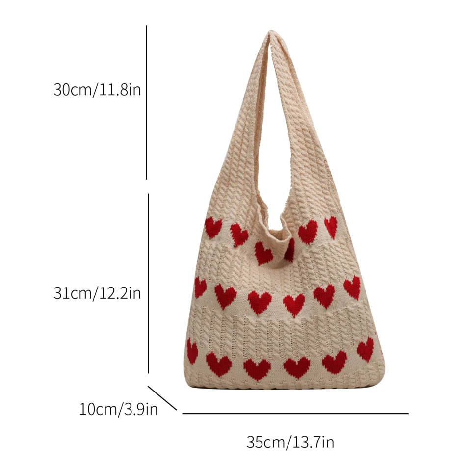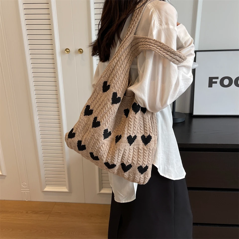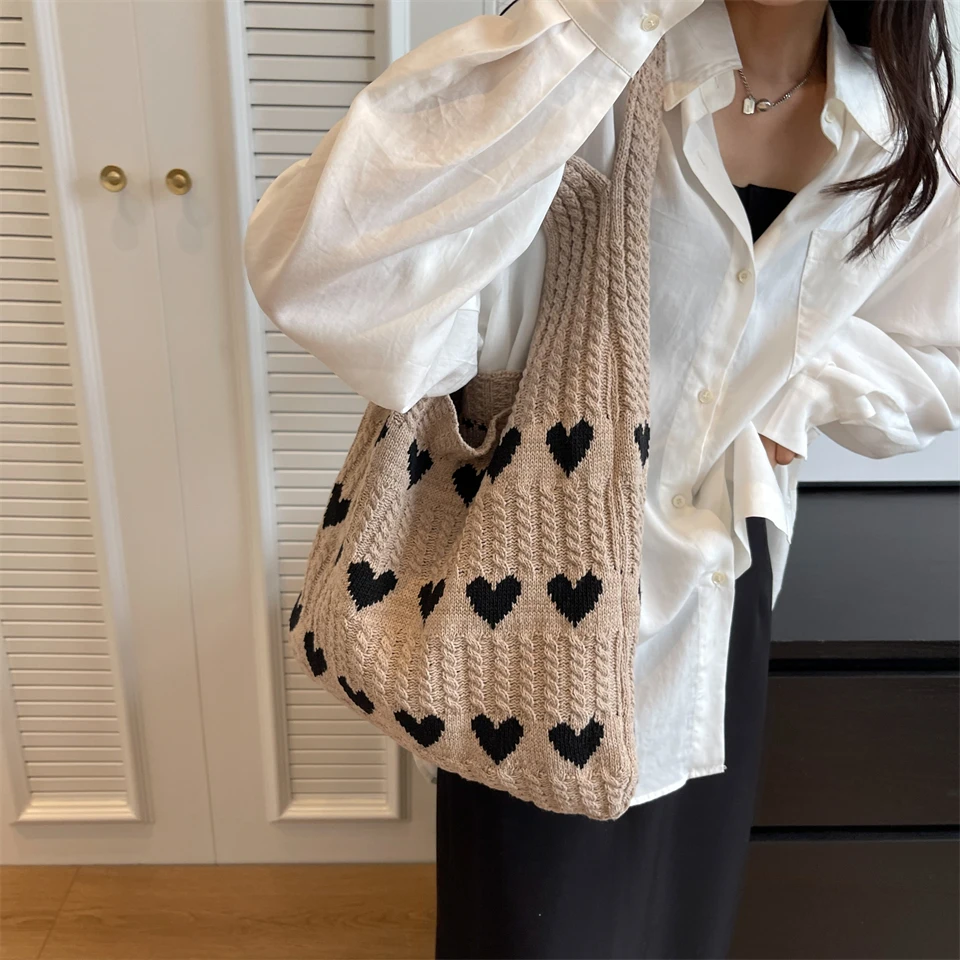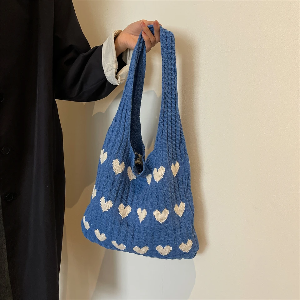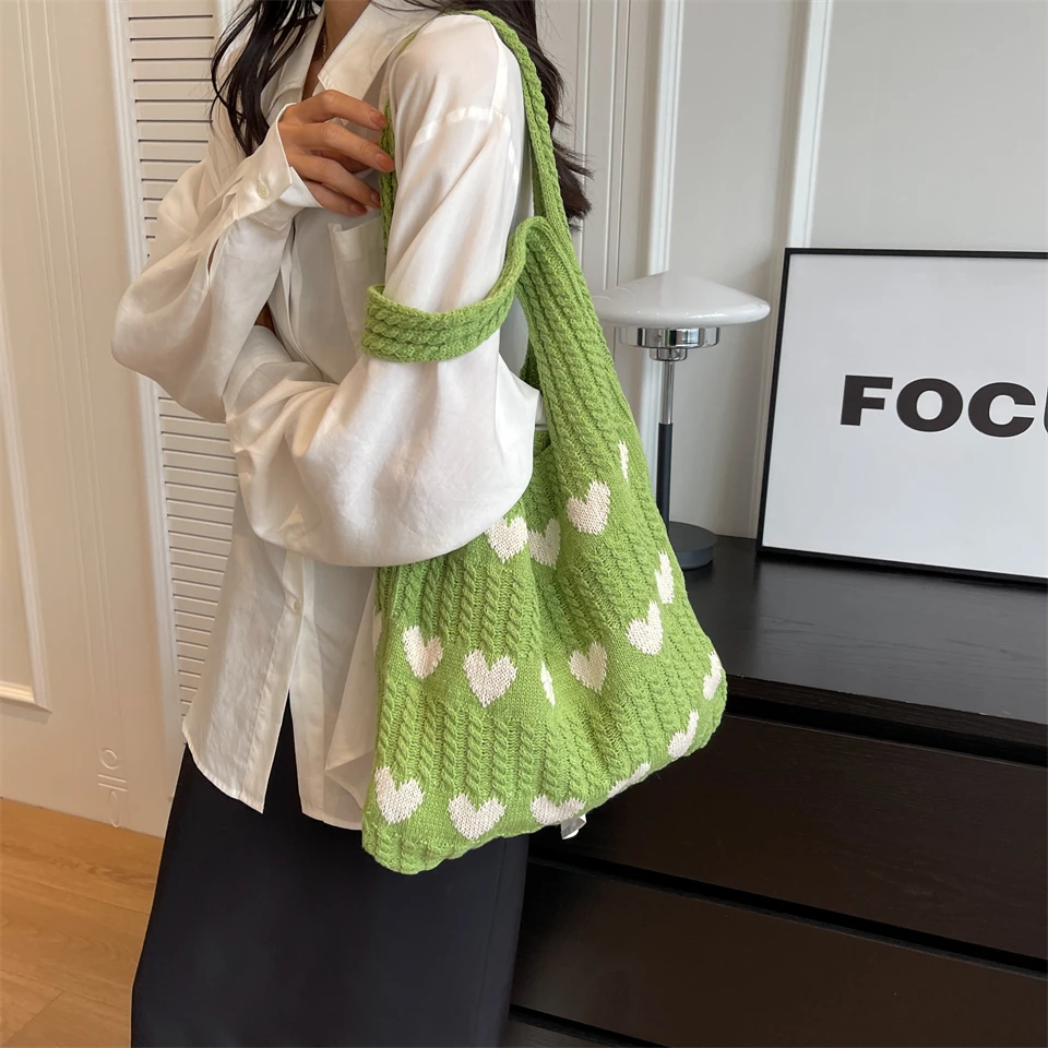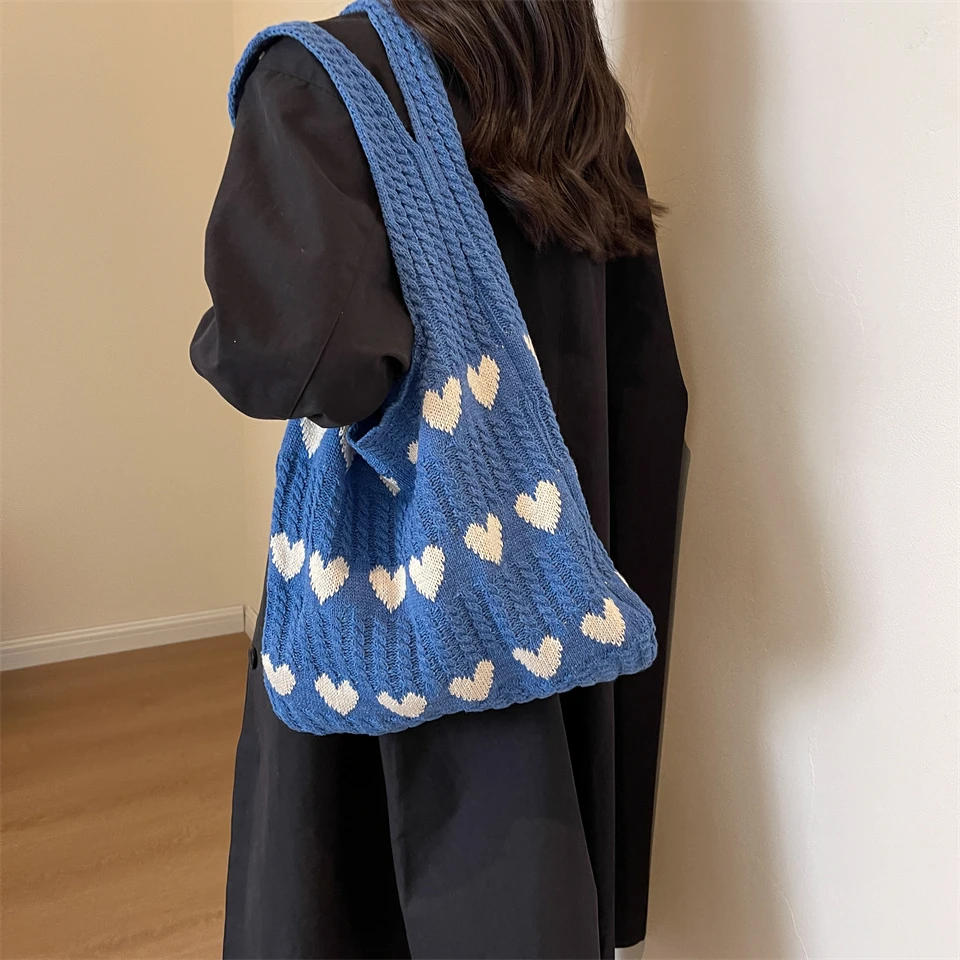 Heart Knit Women's Bag Knitted Eco Bag Korean Fashion Shopping Y2K Crochet Rope Shoulder Bag Female Knitting Handbag Tote Bags