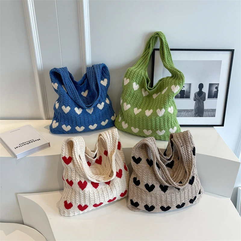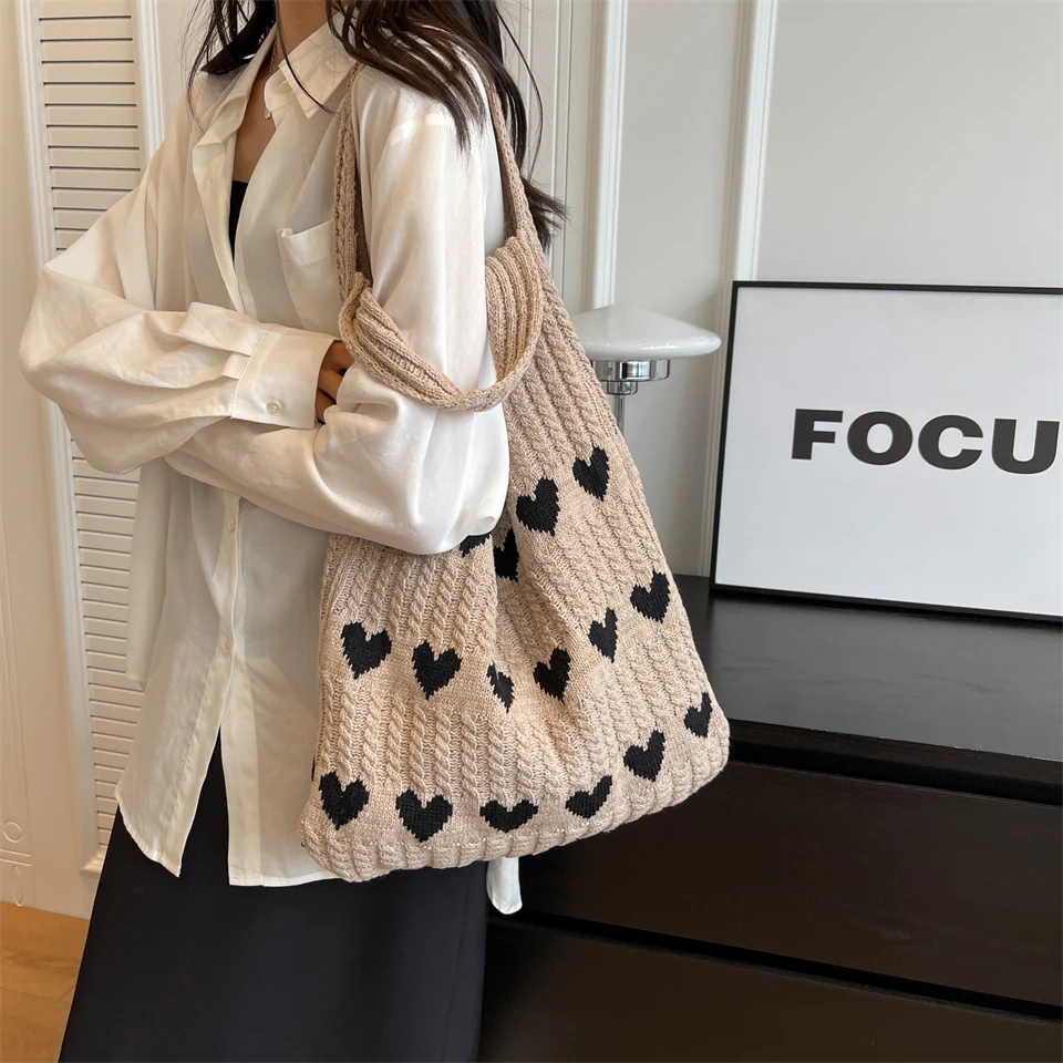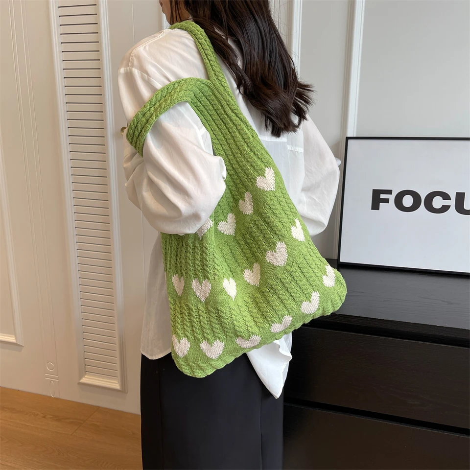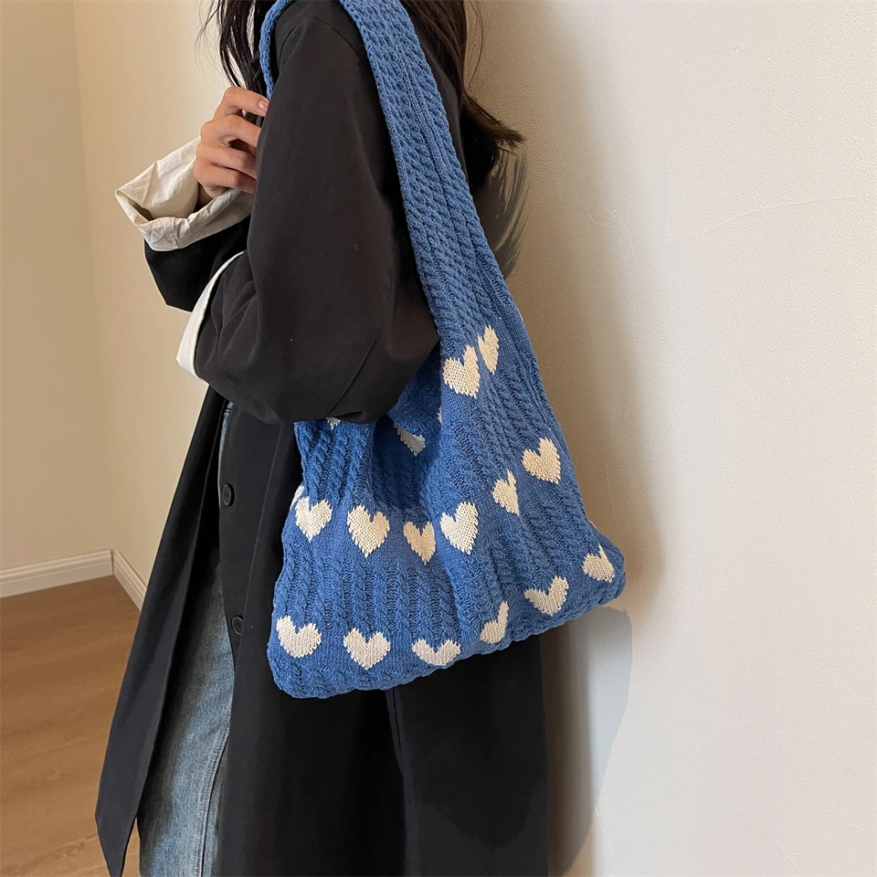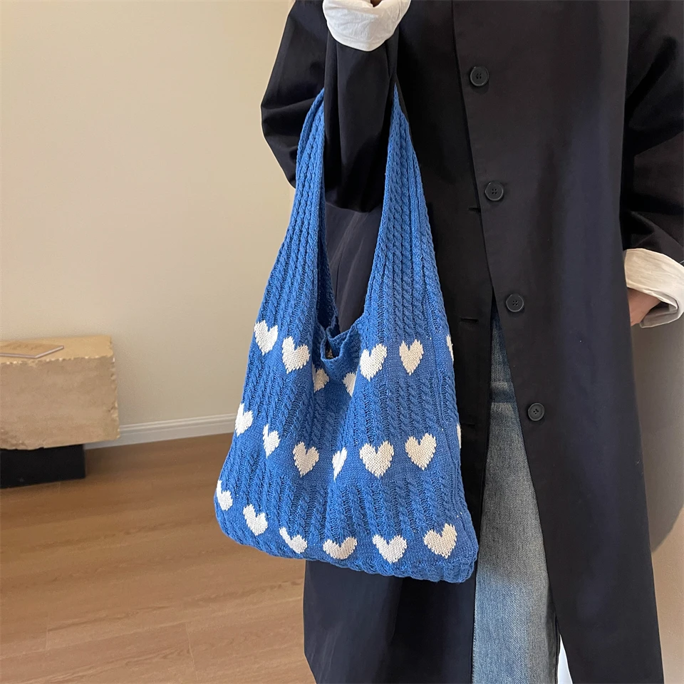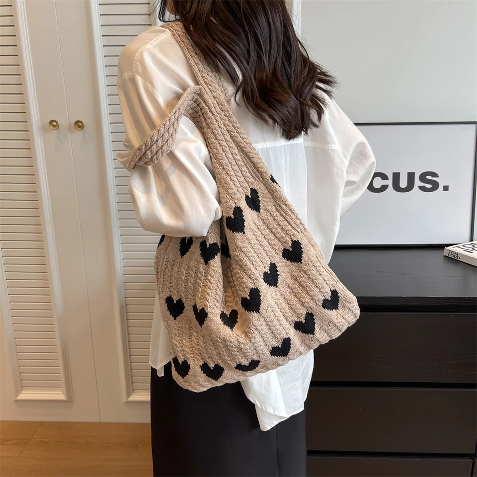 Heart Knit Women's Bag Knitted Eco Bag Korean Fashion Shopping Y2K Crochet Rope Shoulder Bag Female Knitting Handbag Tote Bags