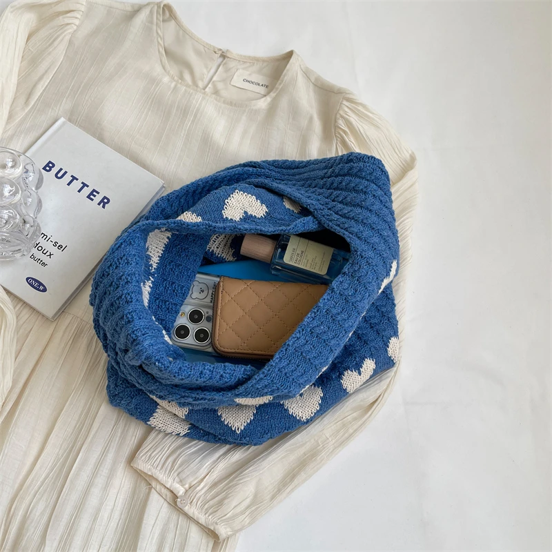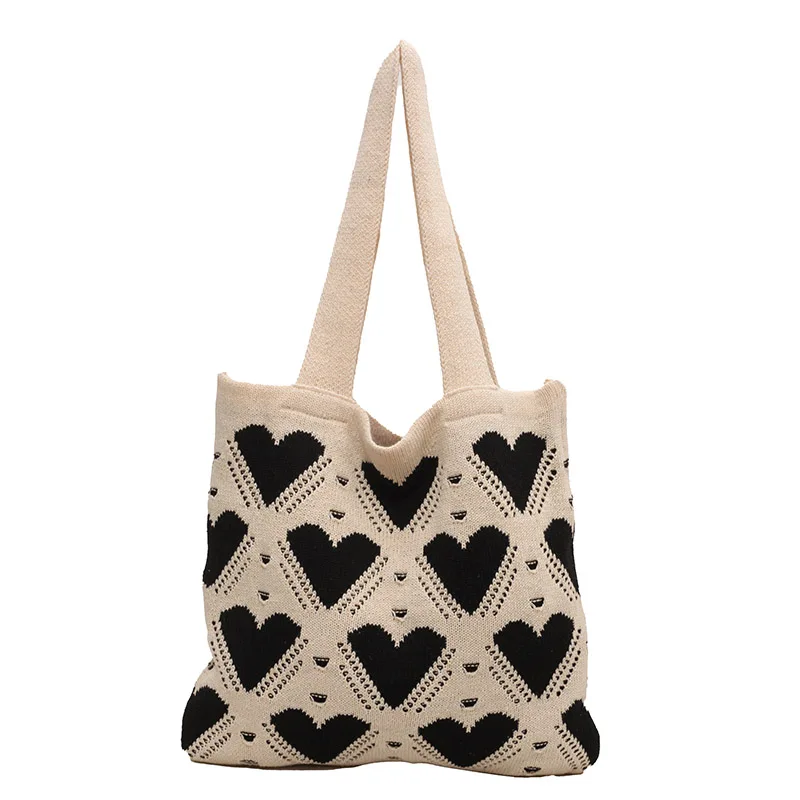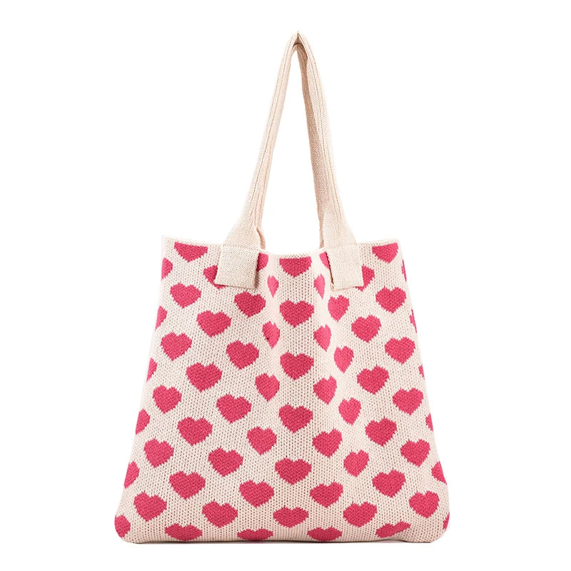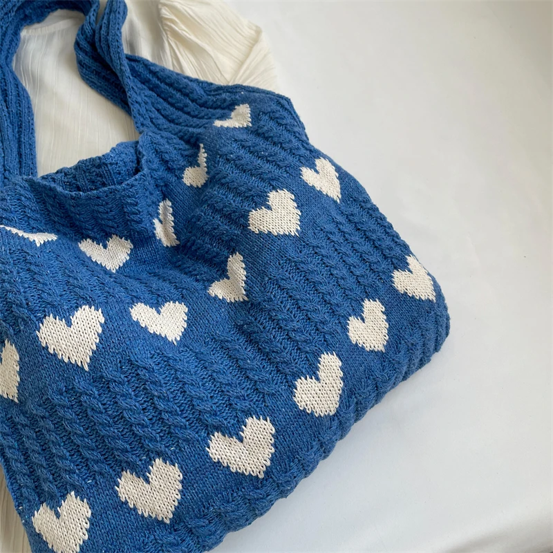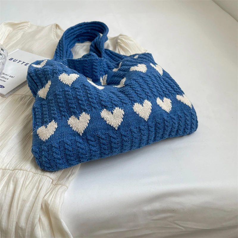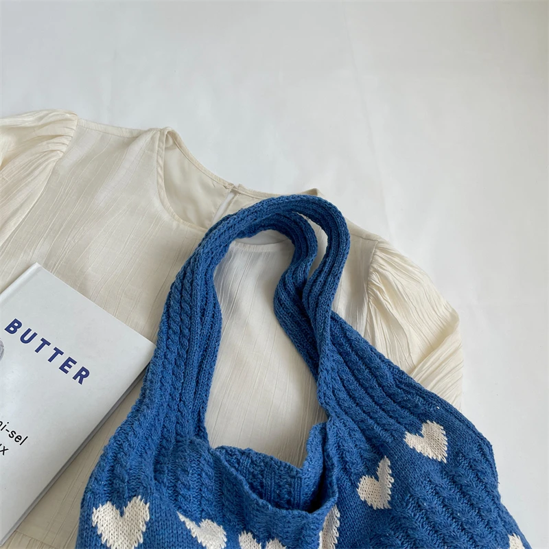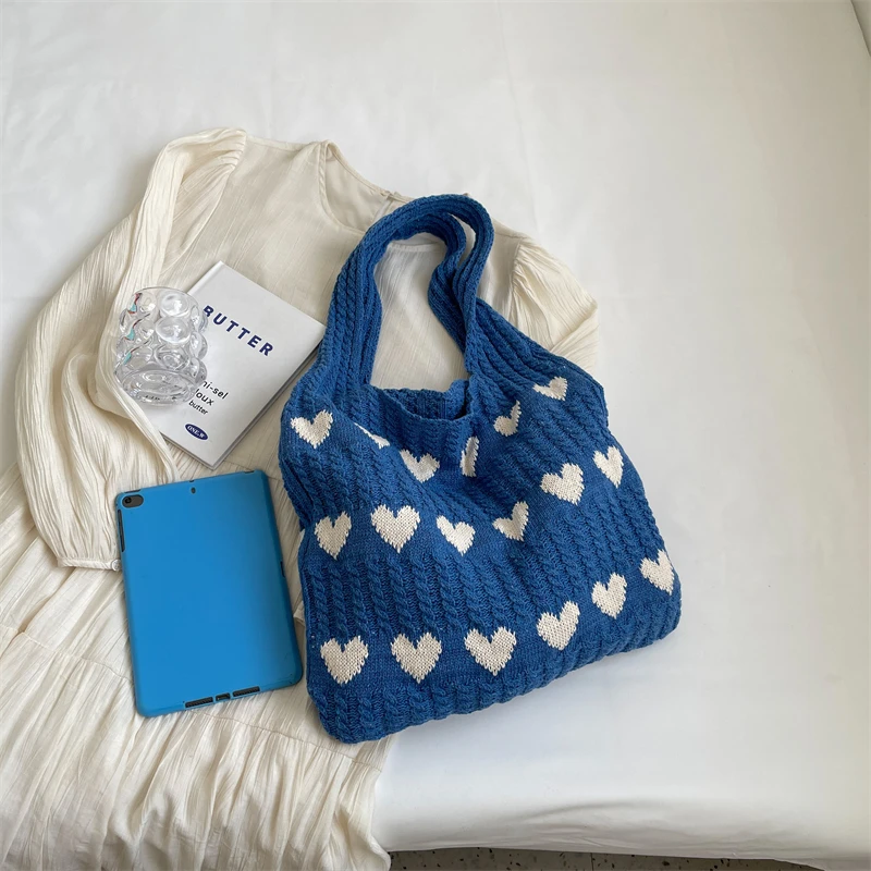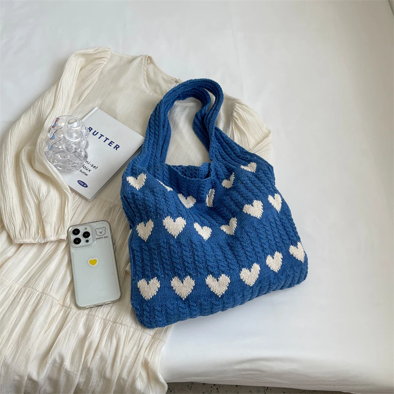 Heart Knit Women's Bag Knitted Eco Bag Korean Fashion Shopping Y2K Crochet Rope Shoulder Bag Female Knitting Handbag Tote Bags