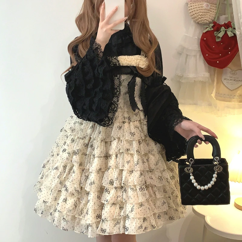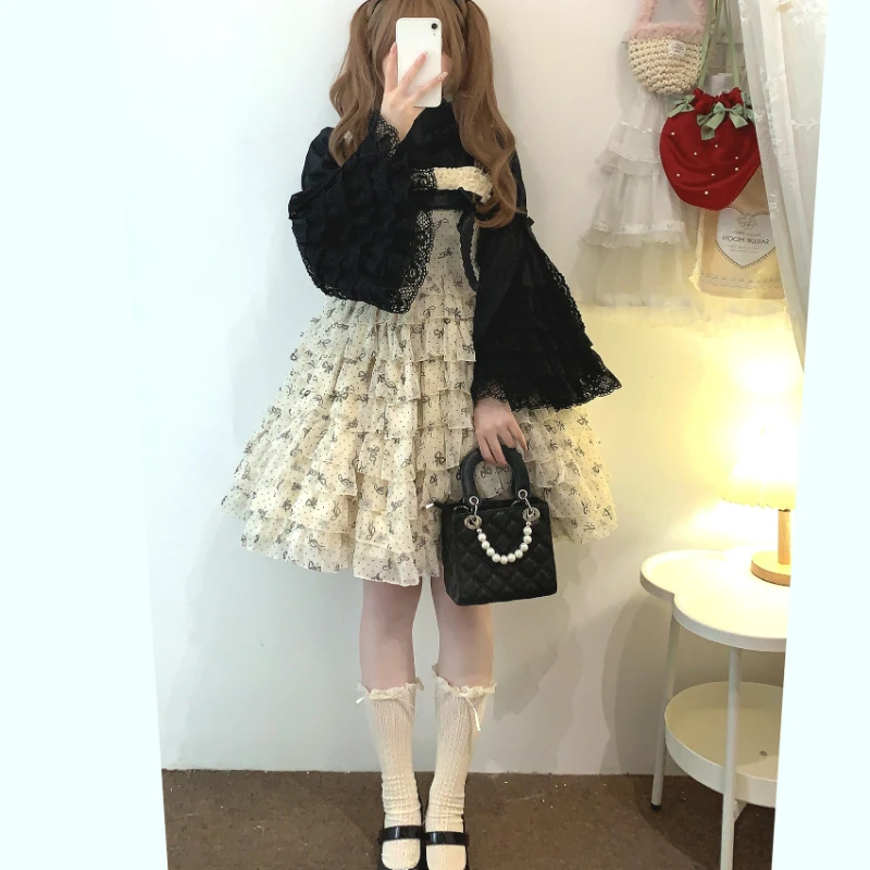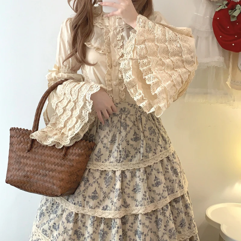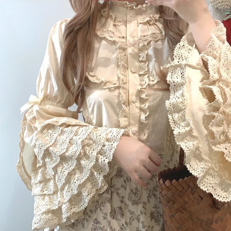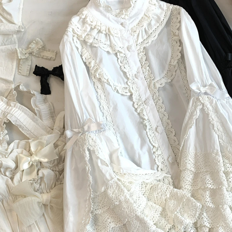 Japanese Gothic Lolita Style Shirts Women Victorian Vintage Lace Bow Long Sleeves Blouse Female Elegant Ruffles Collar Slim Tops