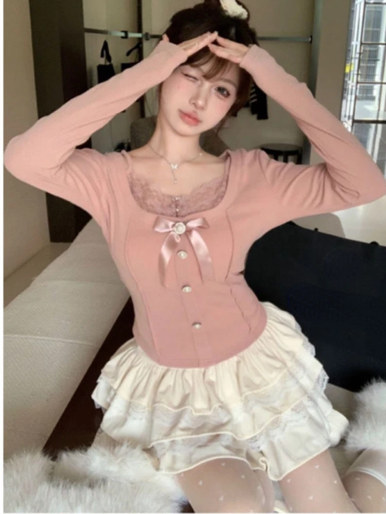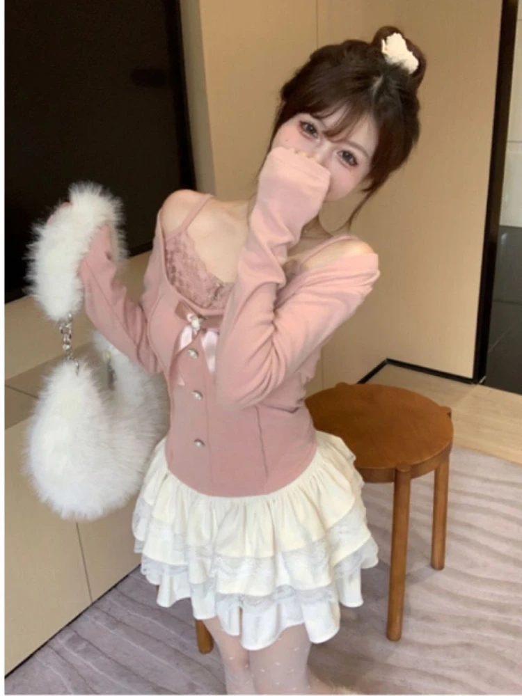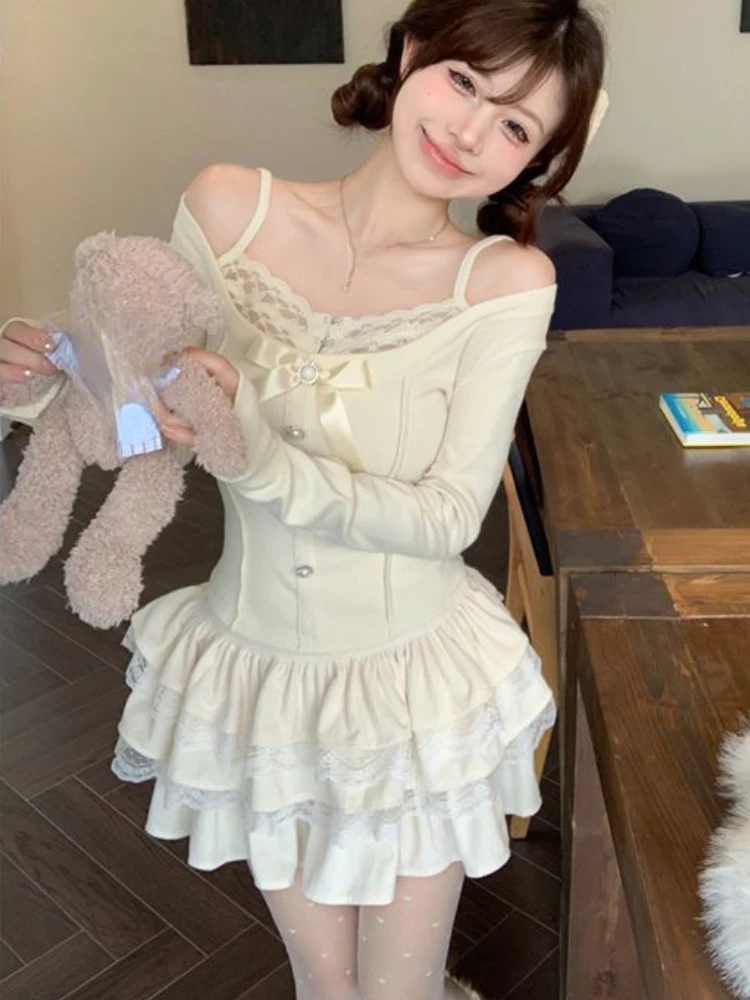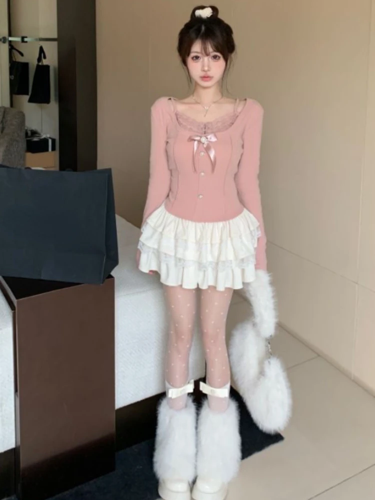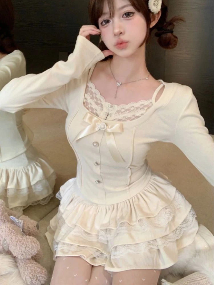 Japanese Kawaii Y2k 2 Piece Set Women Lace Sexy Elegant Retro Skirt Suit Female Autumn Winter Chic Tops + Cake Mini Skirt 2024