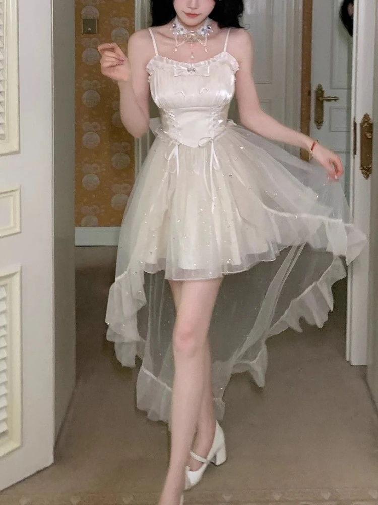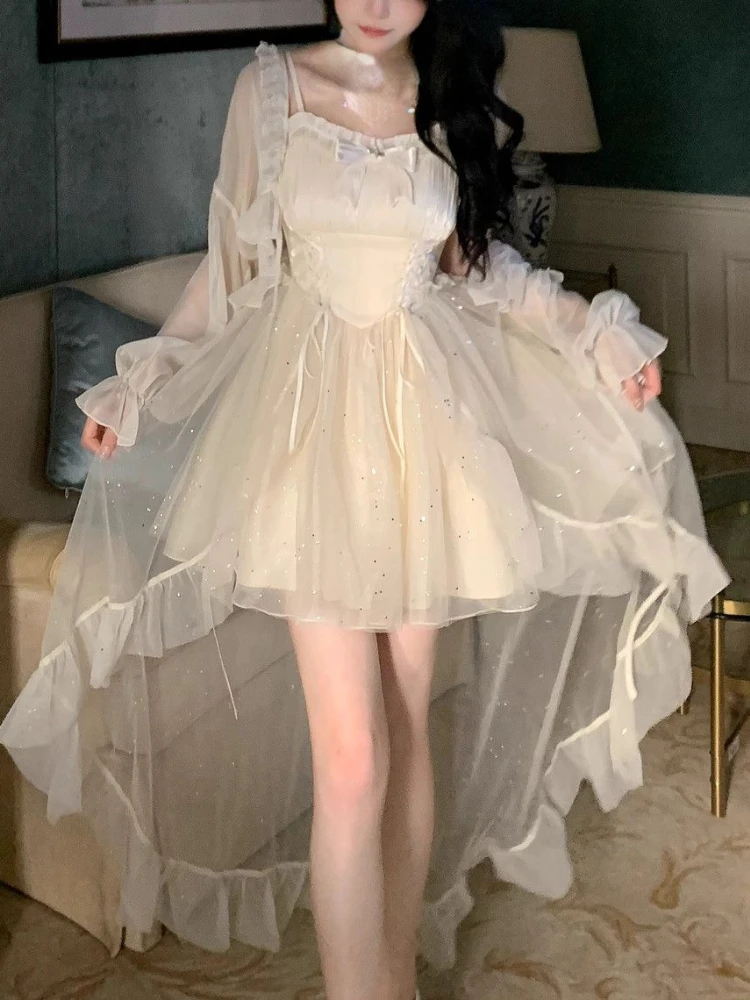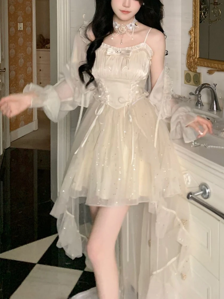 Japanese Lolita Kawaii 2 Piece Set Women Korean Sweet Lace Chiffon Dress Suit Female Gauze Cardigan + Suspender Party Mini Dress