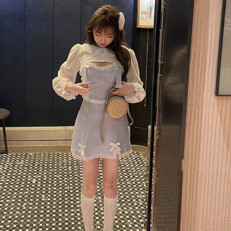 Japanese Sweet Lolita Dress Lace Women Bow Pink Kawaii Party Mini Dresses Female Blue Princess Korean Fashion Dresse Winter