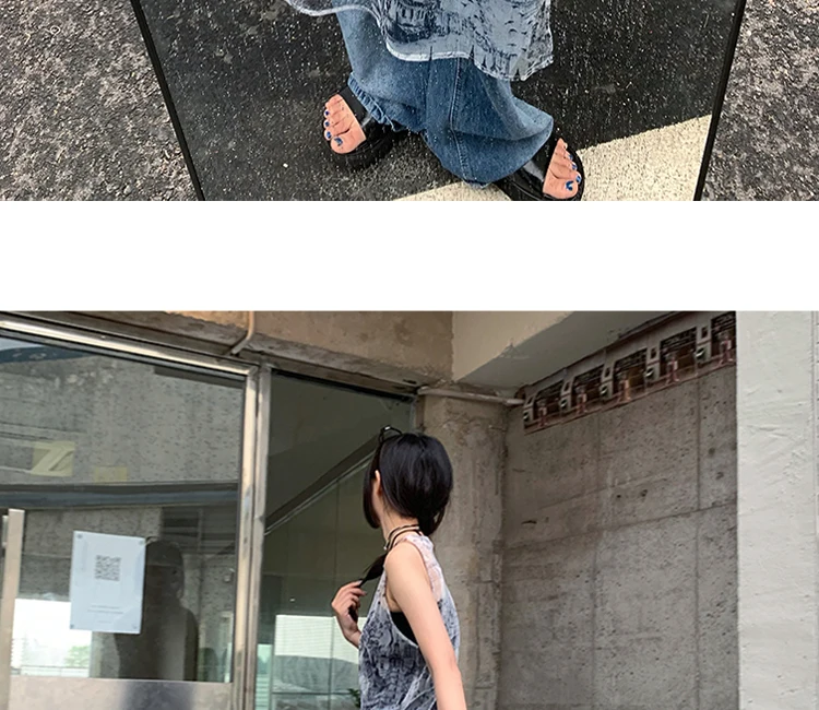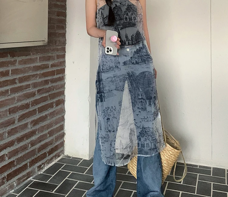 Korean Style Vintage Dress Women Sleeveless Y2k Rero Print Dresses Streetwear Mesh See Through Die Try Dress Female
