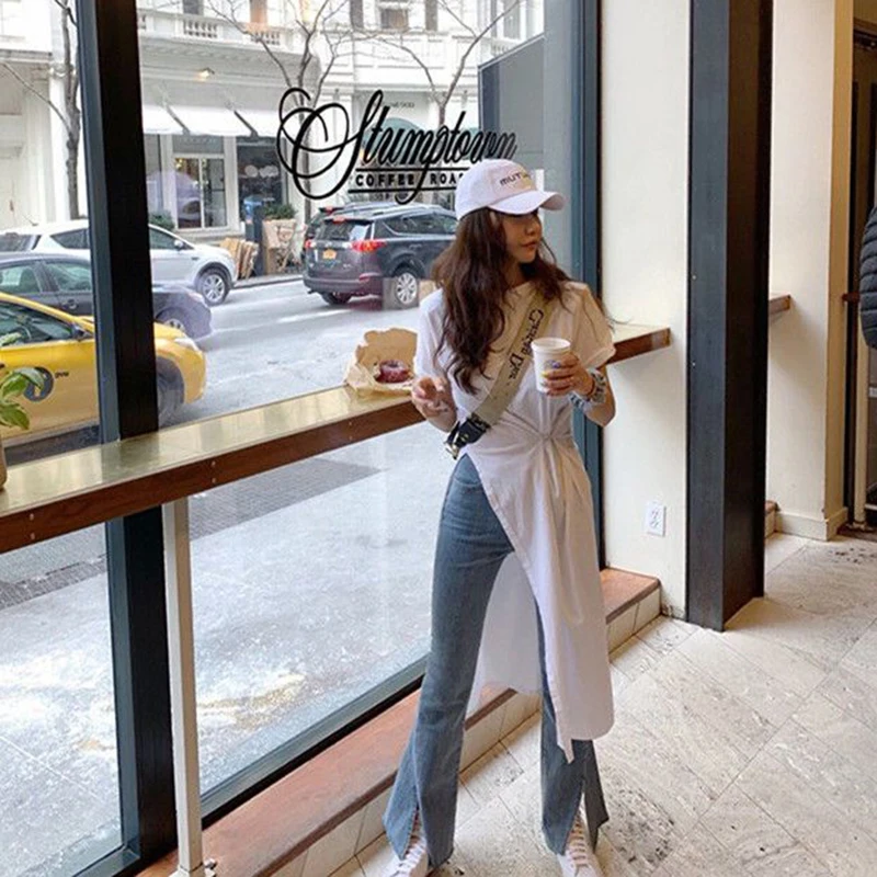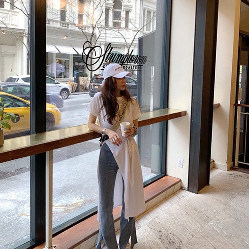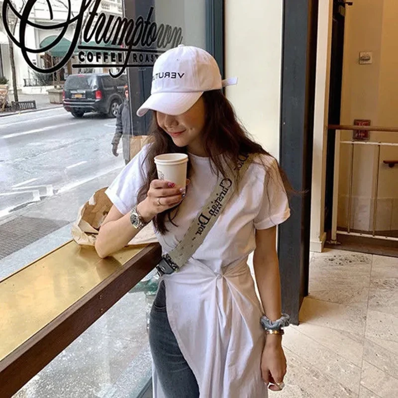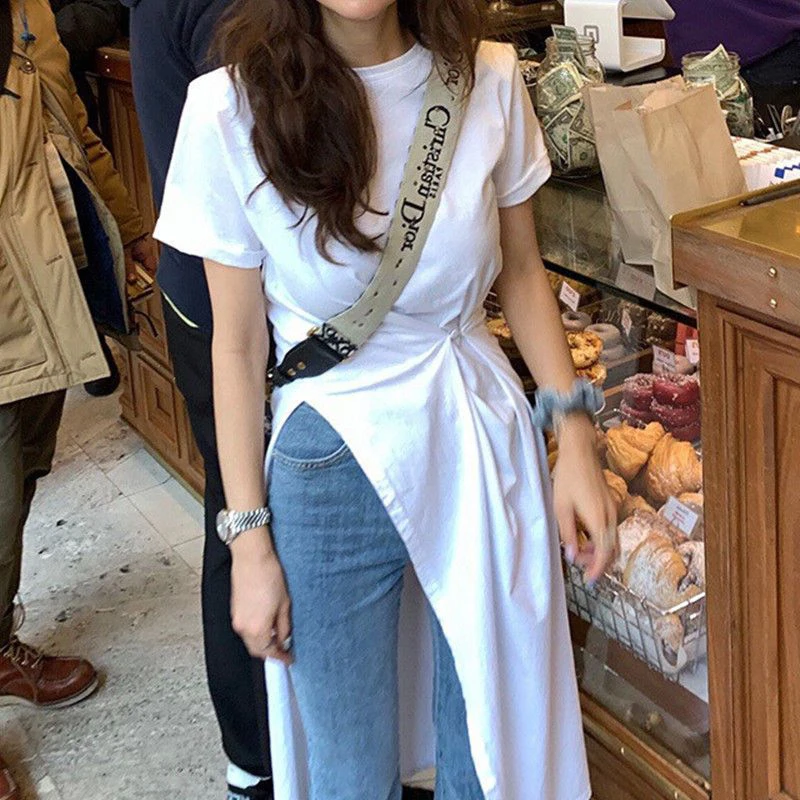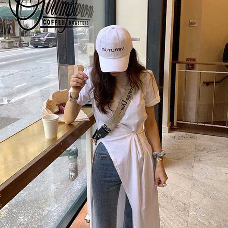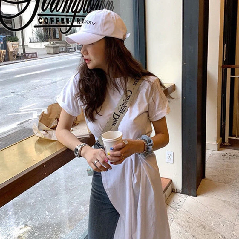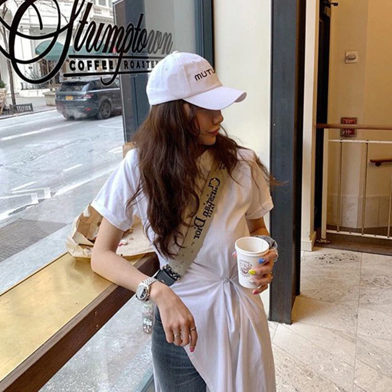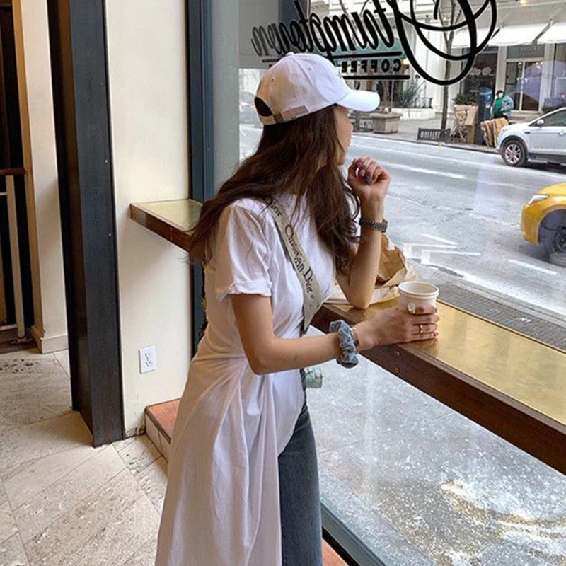 T Shirt Dress Women Oversized Slit Irregular White Dresses Summer Korean Streetwear Split Button Pleated Casual Robe