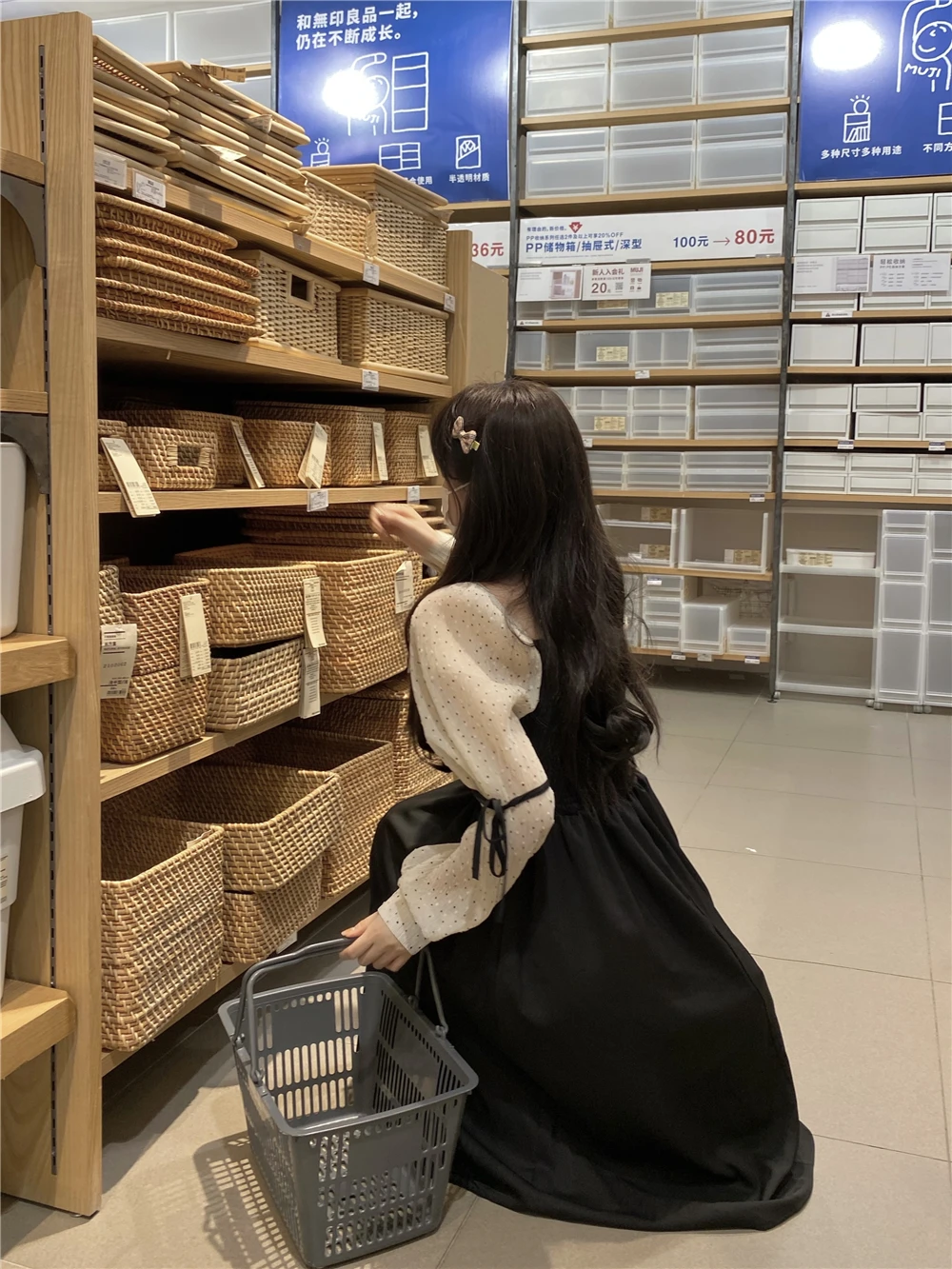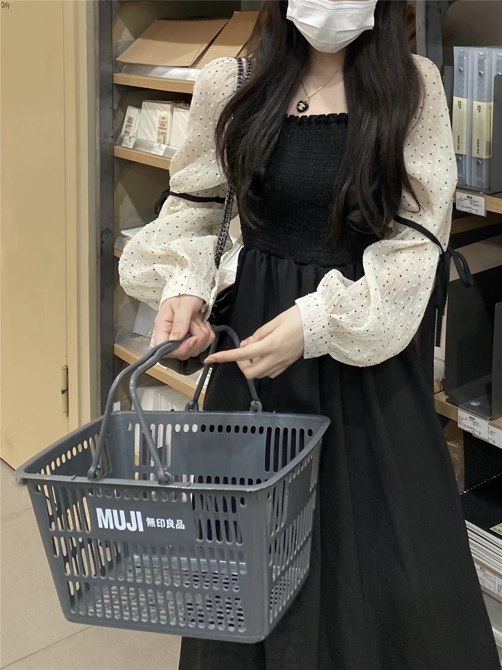 Long Sleeve Dress Women Square Collar Dot Patchwork Elegant Mid-calf Casual Fashion Autumn Popular Female Ulzzang Streetwear Ins