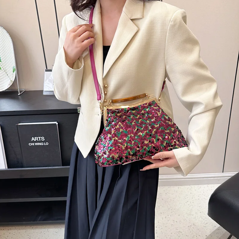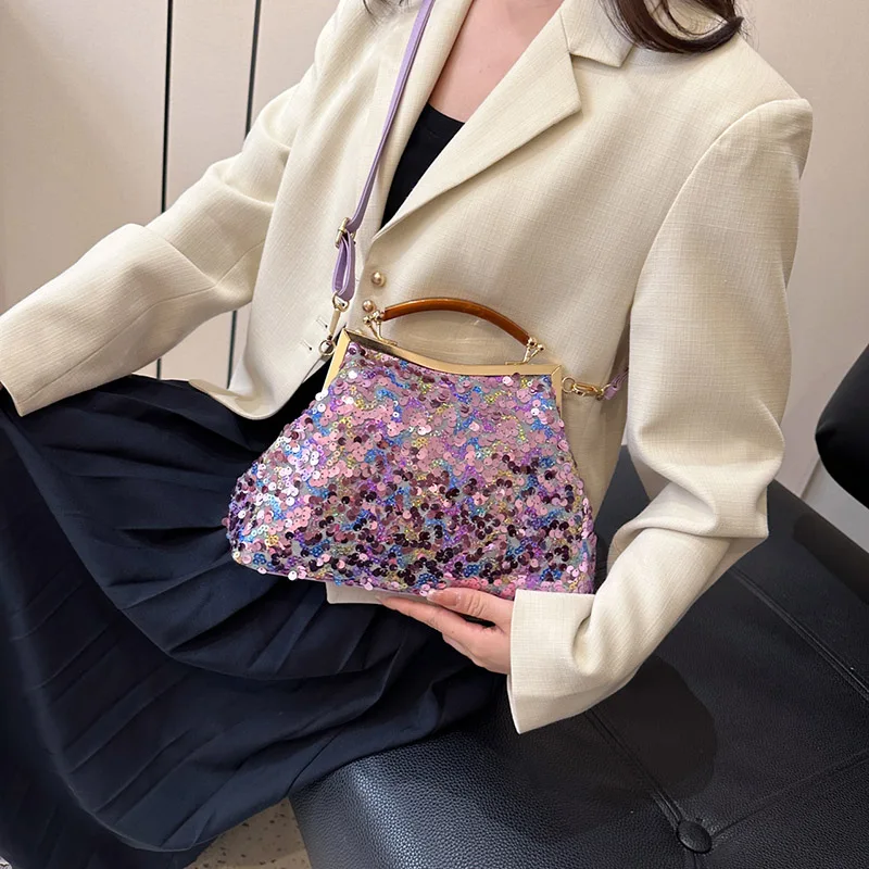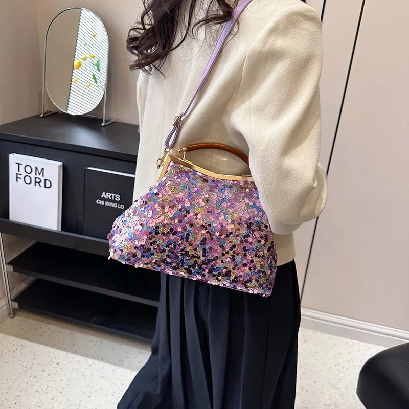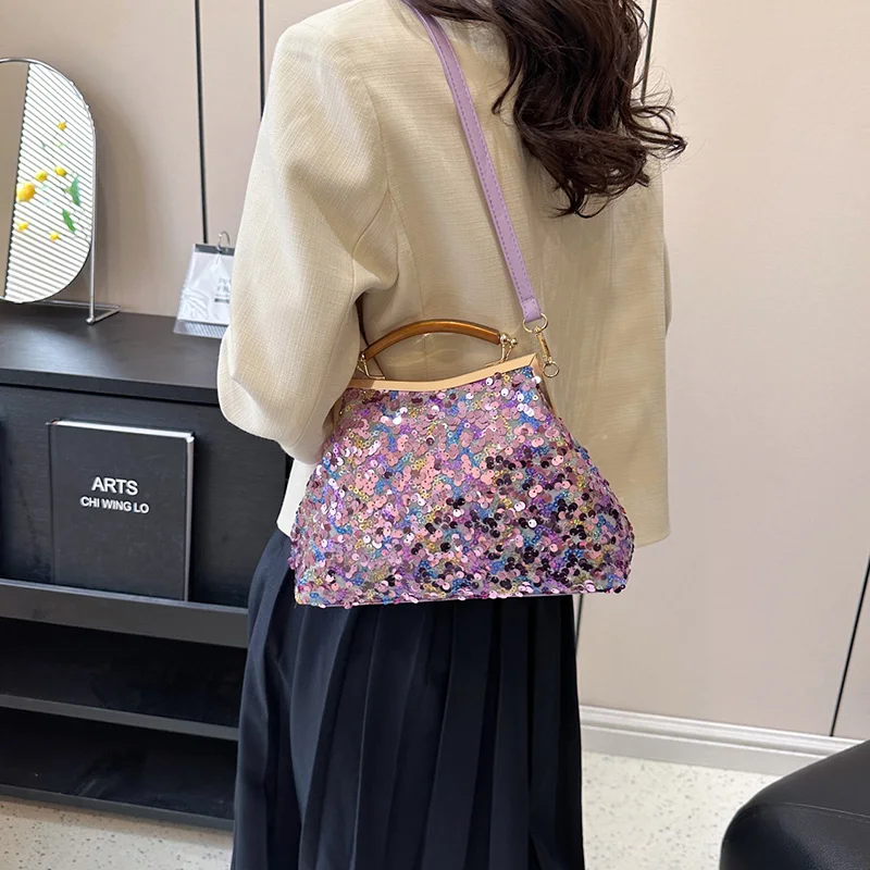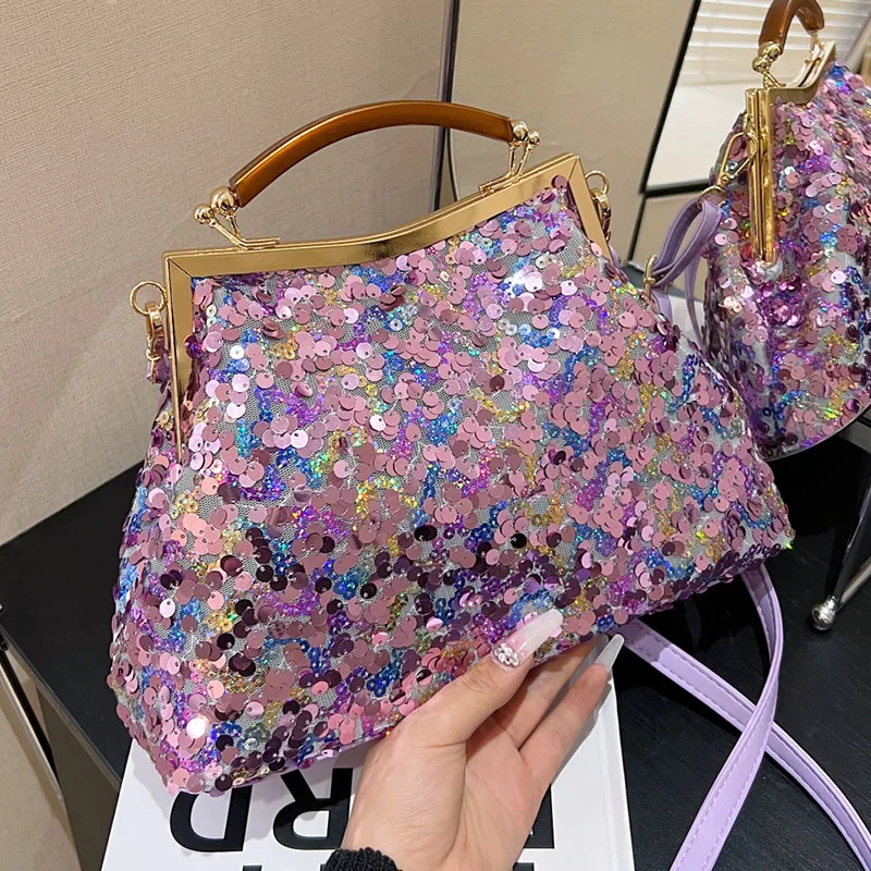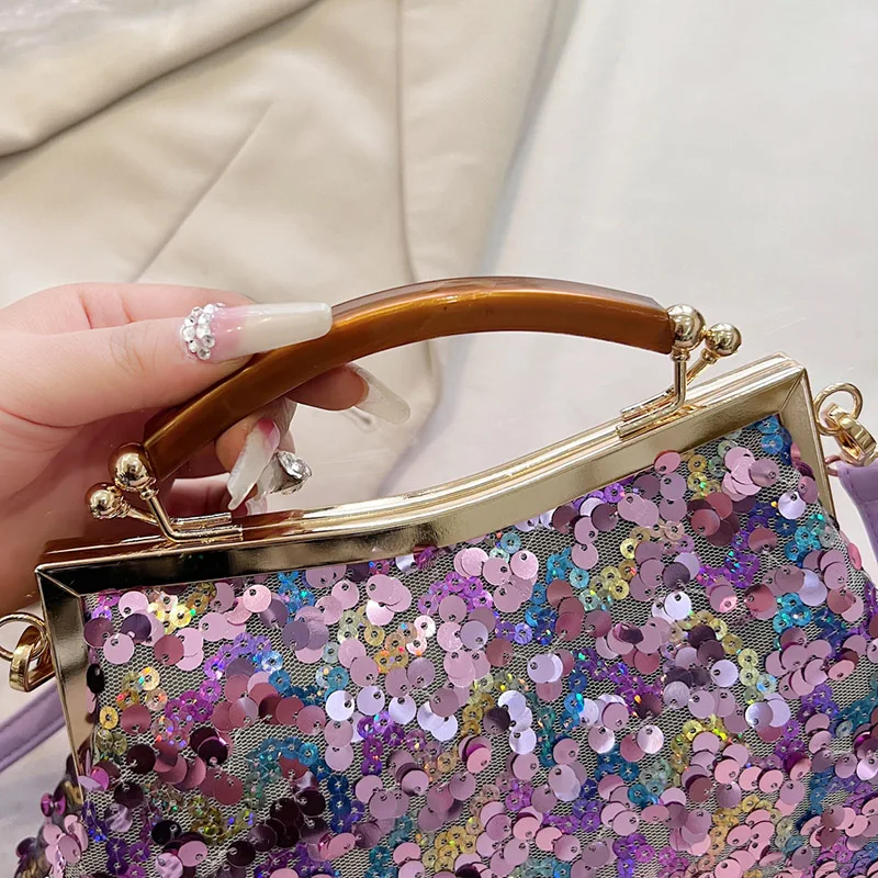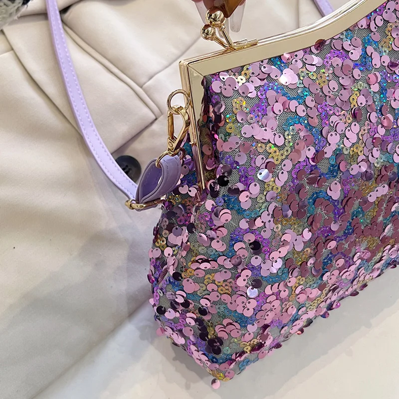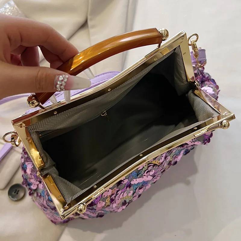 New Fashion Women Evening Clutch Metal Glitter Sequin Purple Gold Chain Shoulder Bags Luxury Designer Wedding Prom Handbags