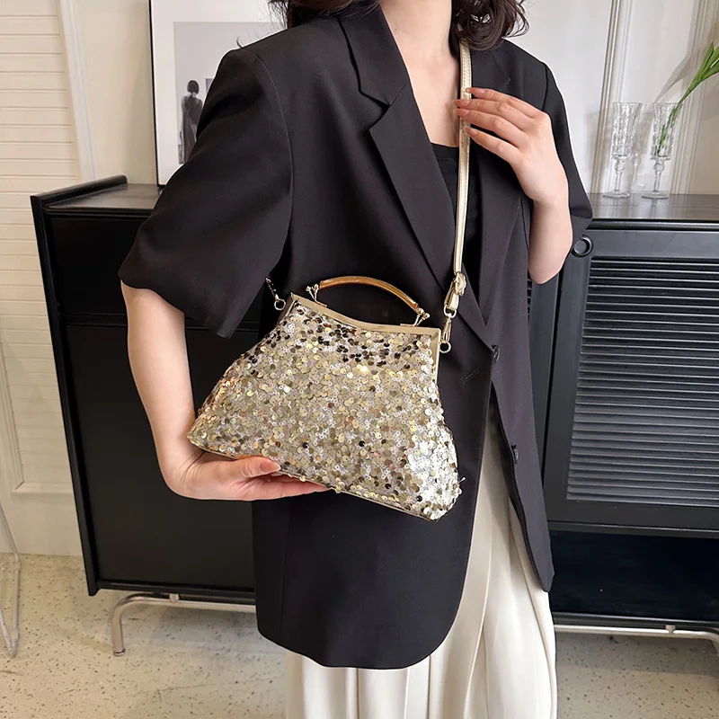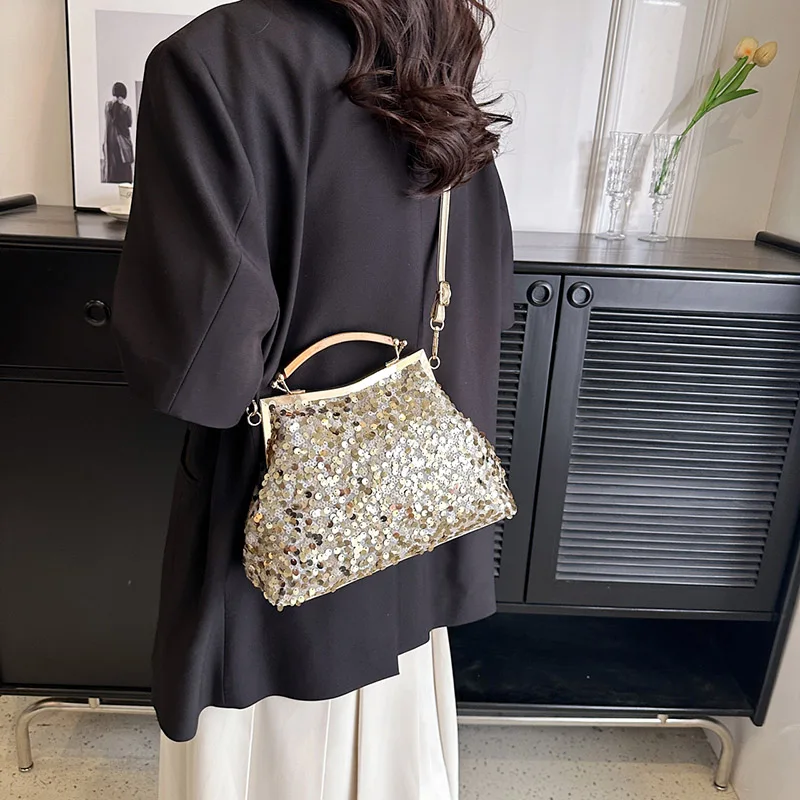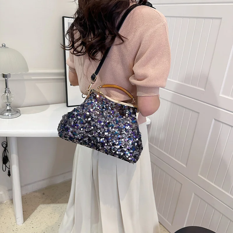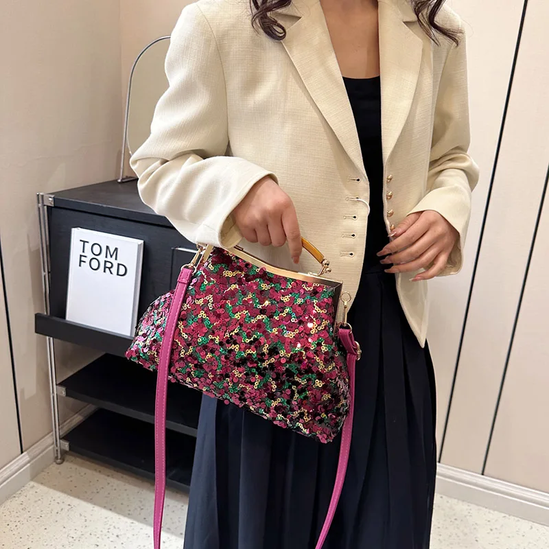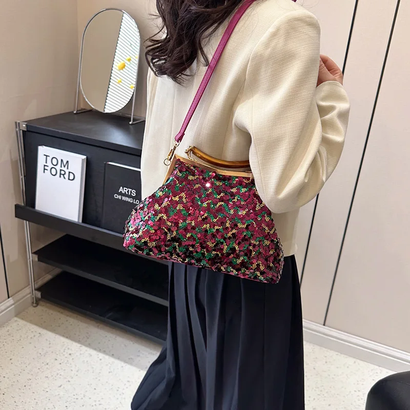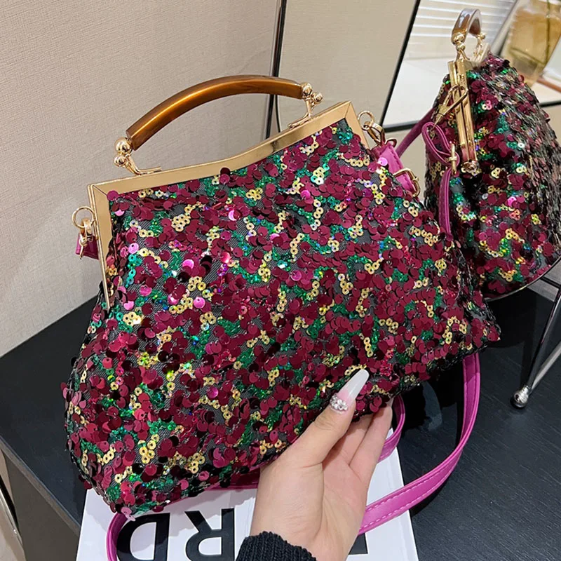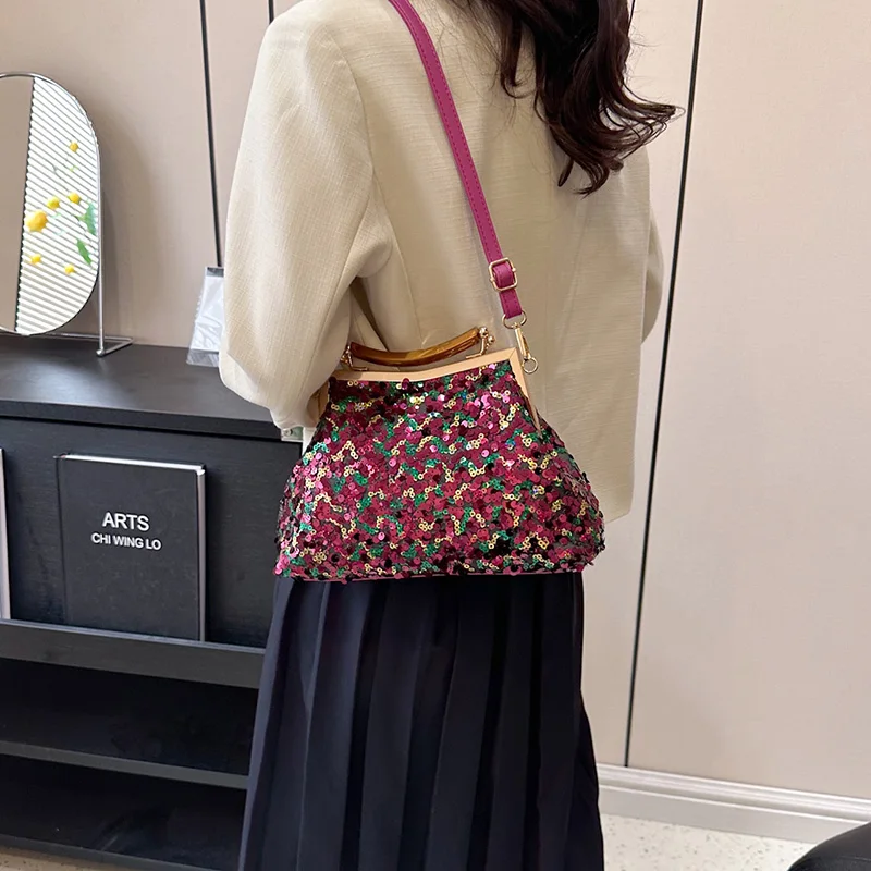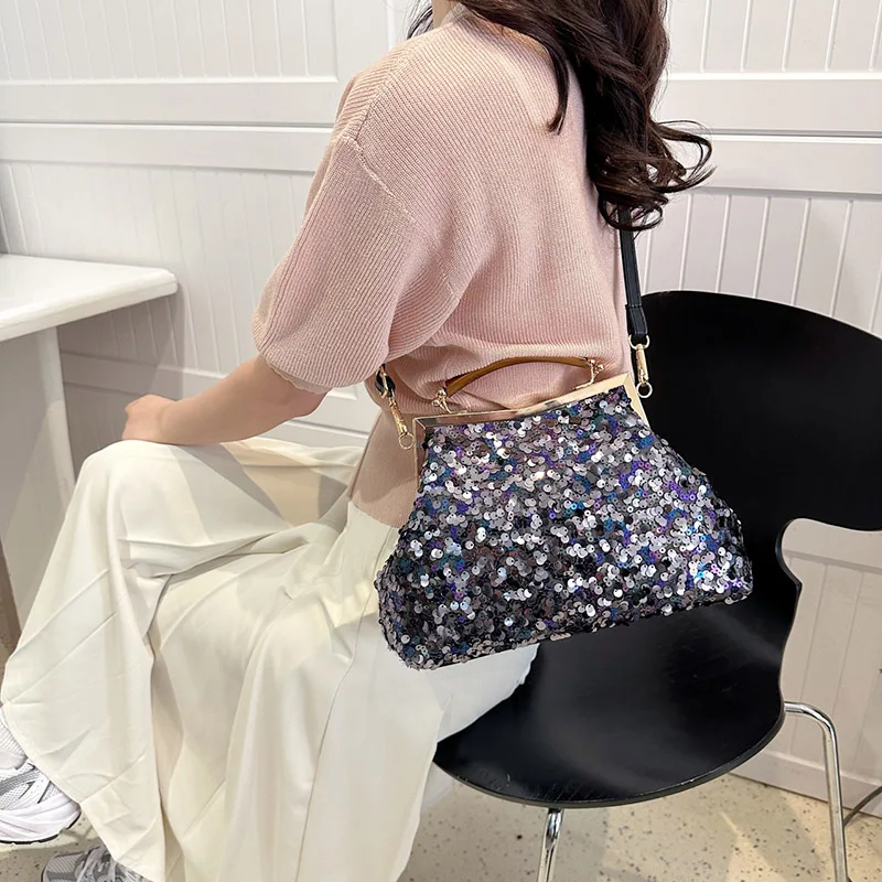 New Fashion Women Evening Clutch Metal Glitter Sequin Purple Gold Chain Shoulder Bags Luxury Designer Wedding Prom Handbags
