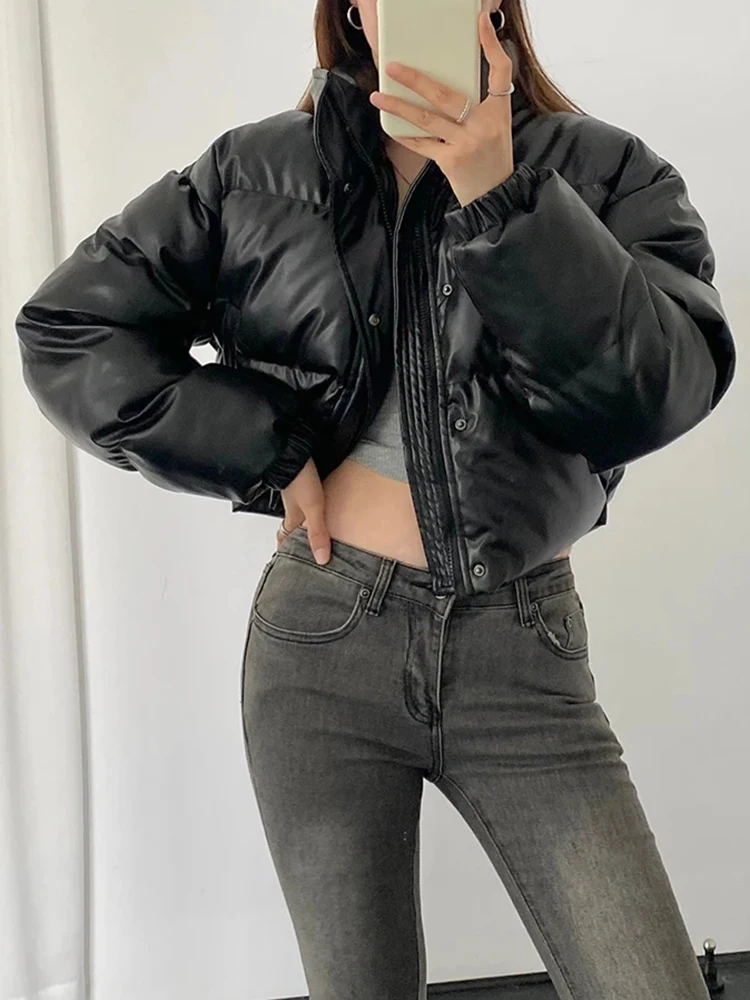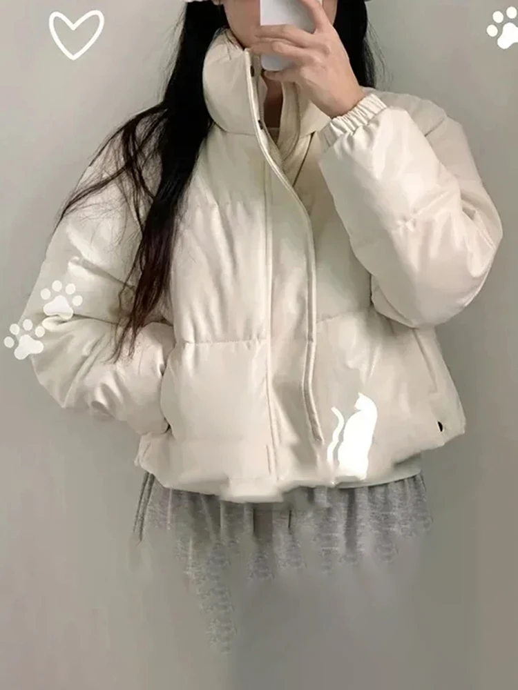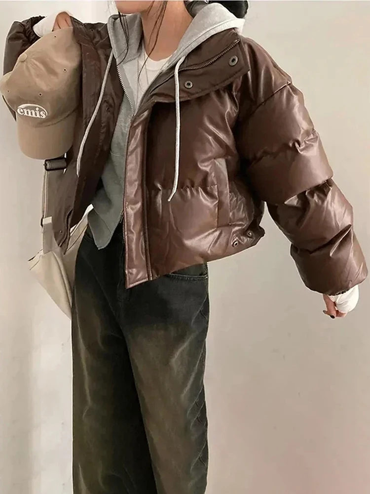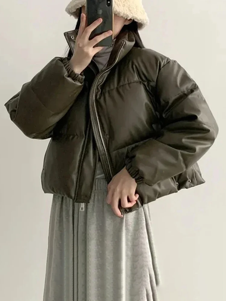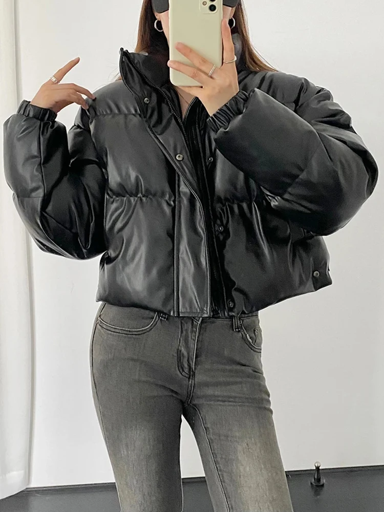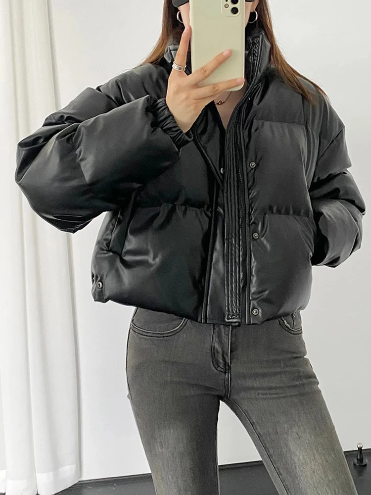 Parkas for Women Faux Leather Zippers Turtleneck Casual Coat Winter Fashion Thermal Button Pocket Female Jackets
