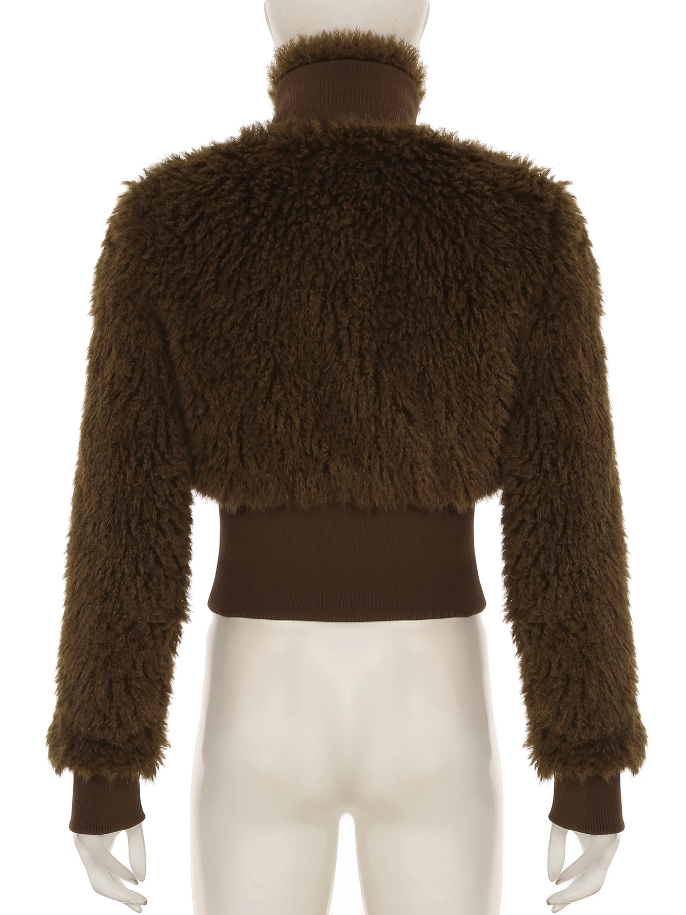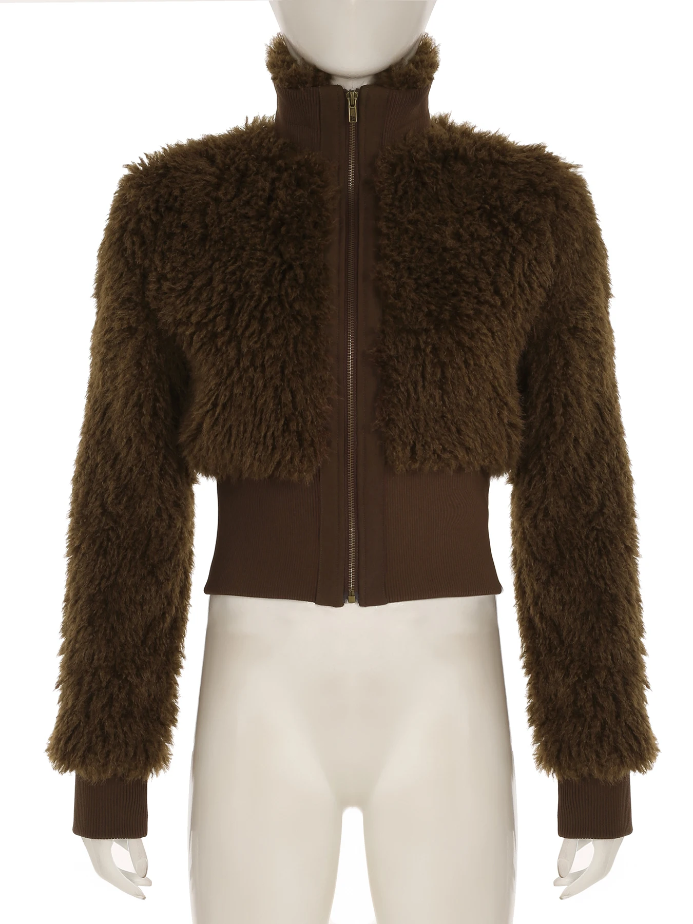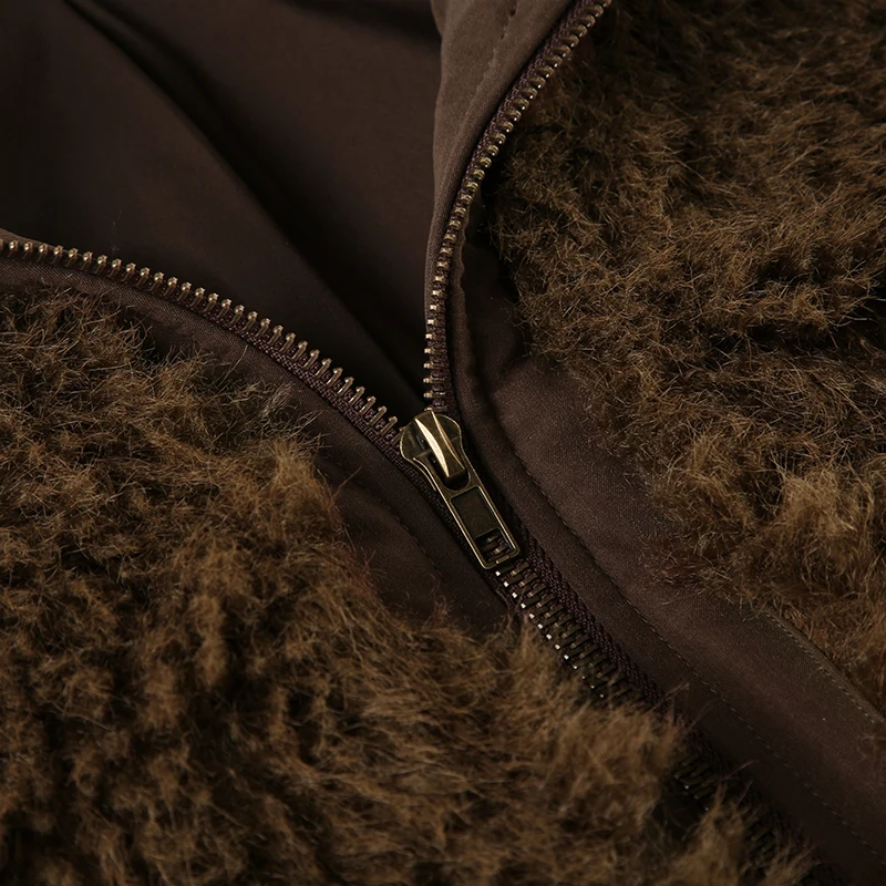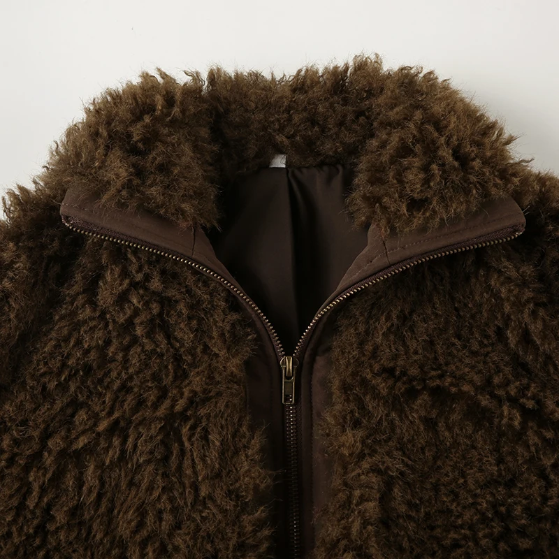Retro Brown Fur Coat Y2K Turtleneck Zipper Jacket Vintage Casual Winter Thick Outwear Streetwear Women Clothes New