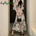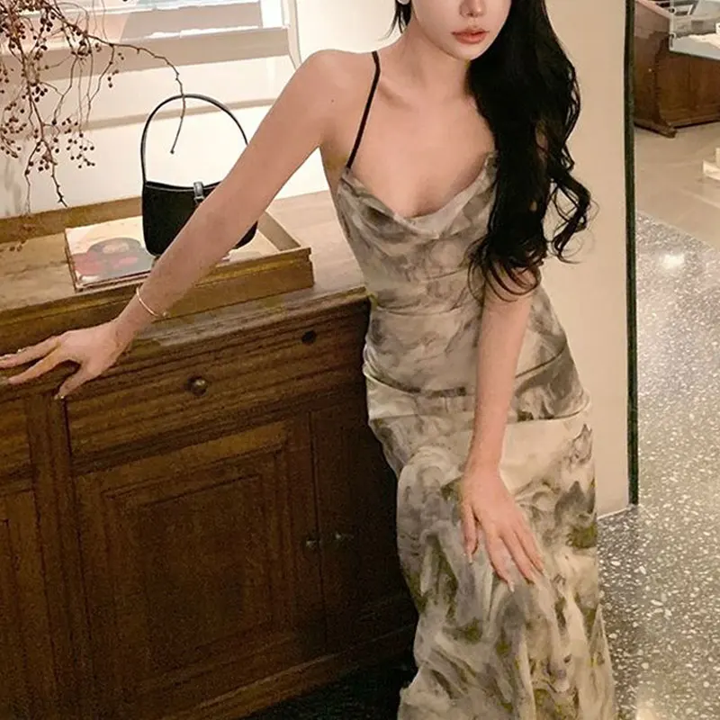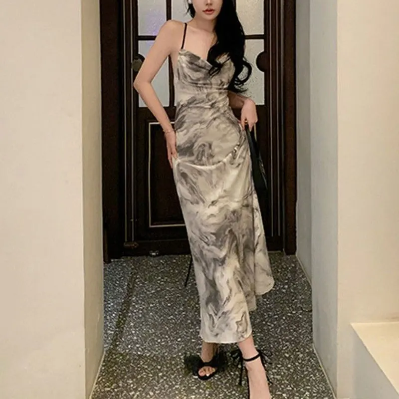 Sexy Backless Swinging Collar Dresses Summer New Stylish Female Clothing Ink Painting Elegant A-Line Waist Slim Long Slip Dress
