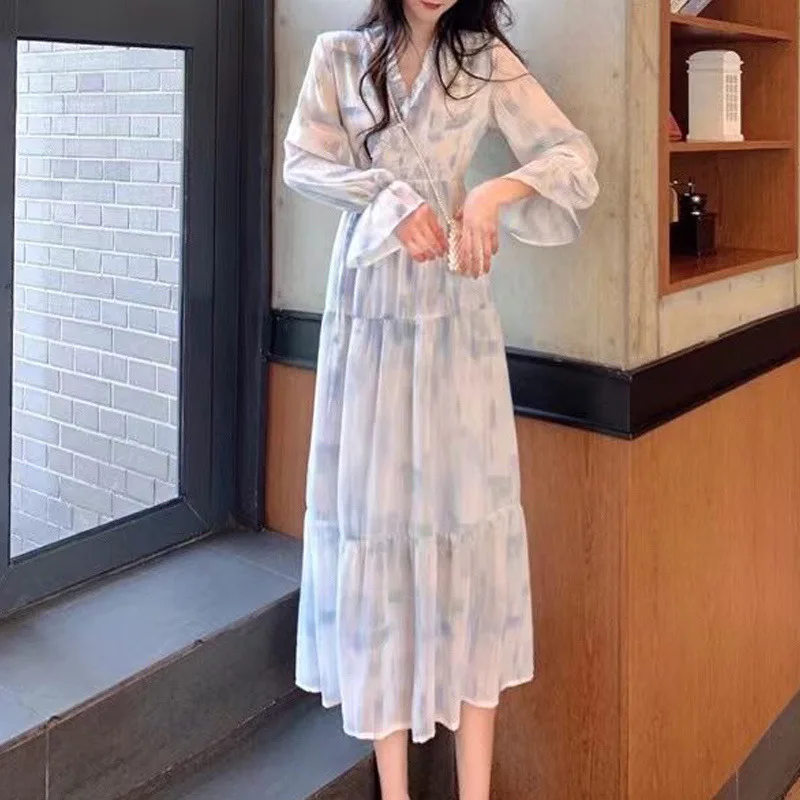 Women French Style Ruffle Lace Up Sweet Elegant Party Dresses Trendy V Neck Long Sleeve Chic Fairy Midi Dress