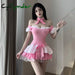 Summer New Women's Sexy Sweet Princess Uniform backless low-cut Flying sleeve Bow Lace Edge Pink White Contrast Dress