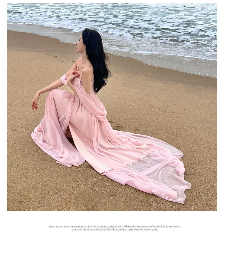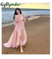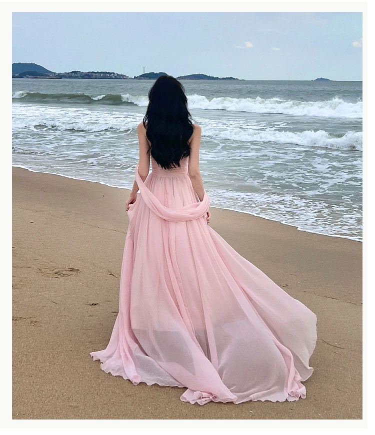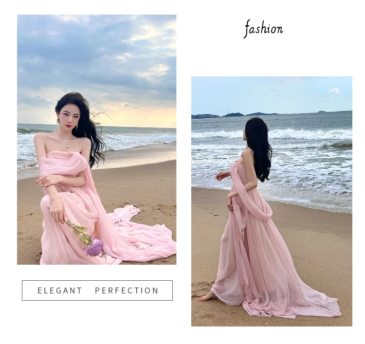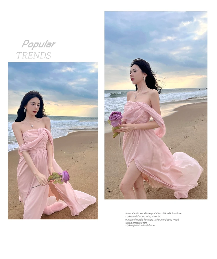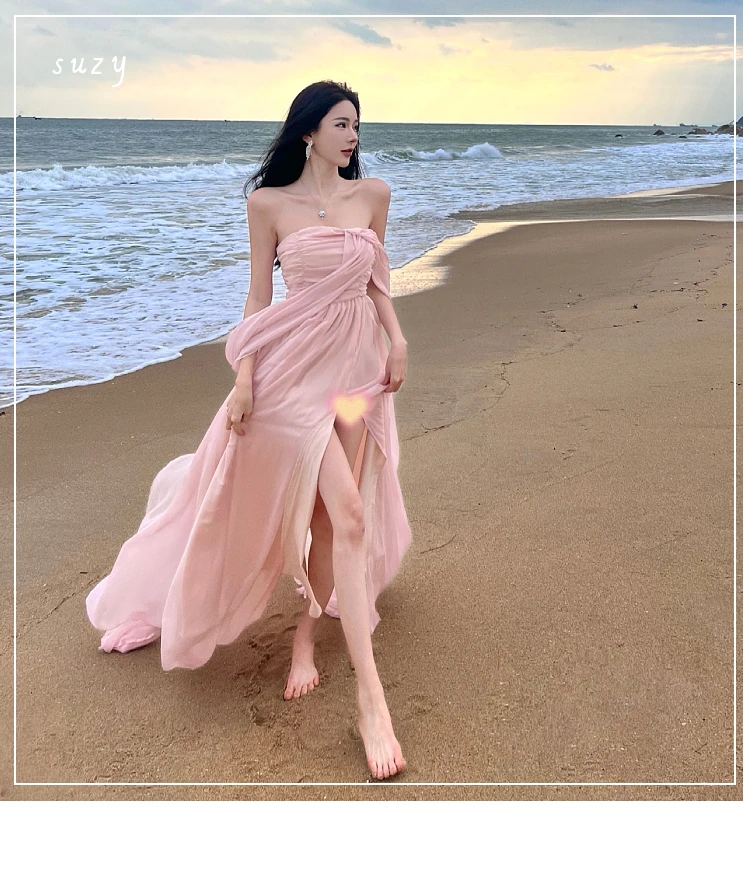 Summer Pink Elegant Pleated High Waist Split Long Dress Women Fashion Backless Halter Strapless Fairy Dress Female 2024 Vestido