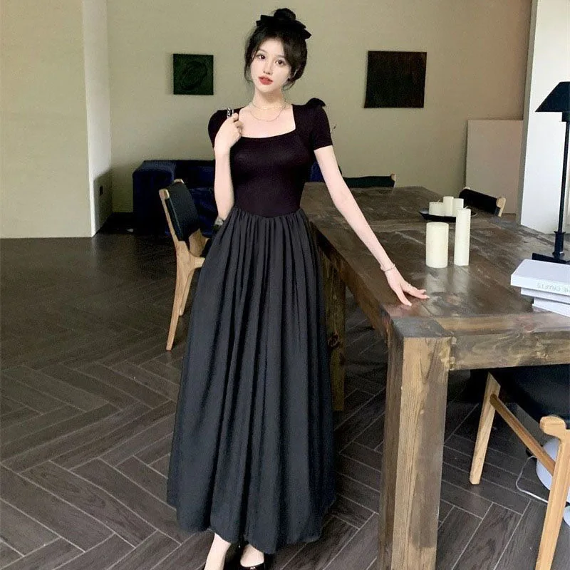 Summer Short Sleeve Black Dress Women Elegant Slim Patchwork Party Long Dresses Woman Fashion Square Collar Maxi Dress #back to school outfit#
