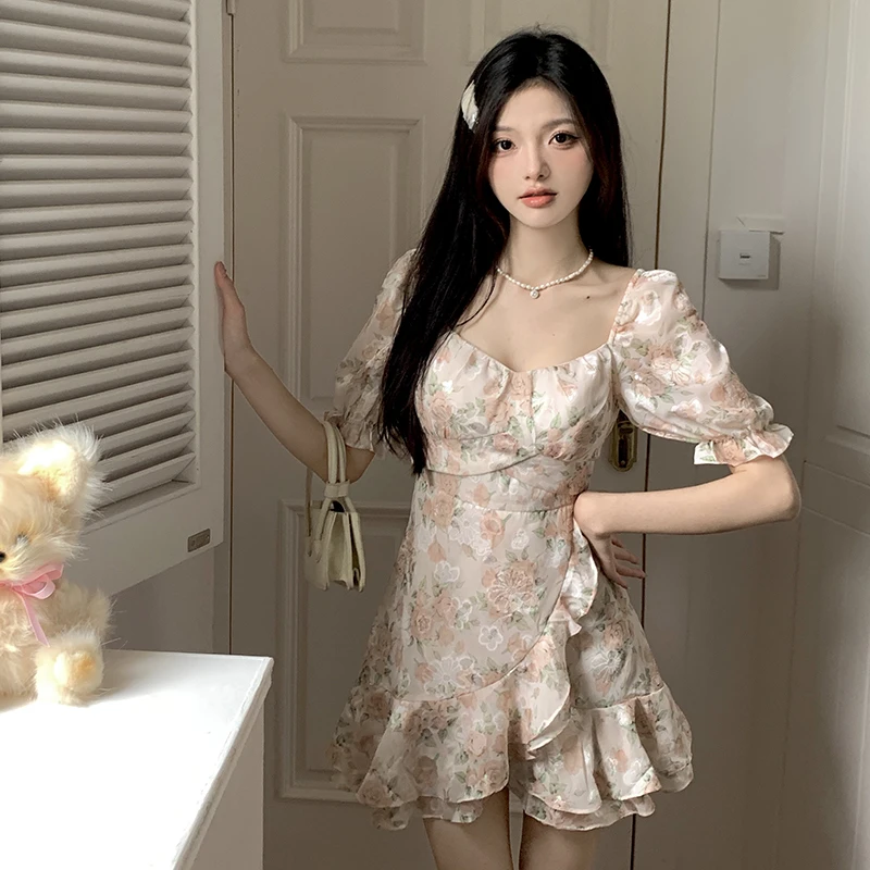 Sweet Floral Chiffon Dress Women Summer Elegant Princess Sleeves Ruffles Party Mini Dresses Female Korean Chic Slim Vestidos