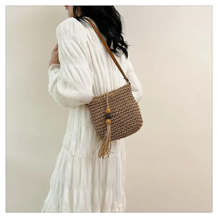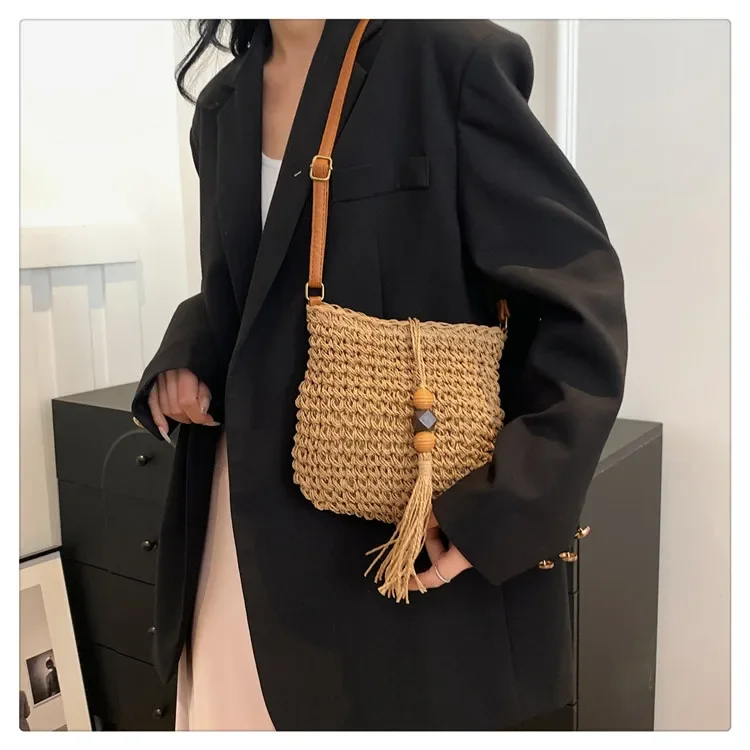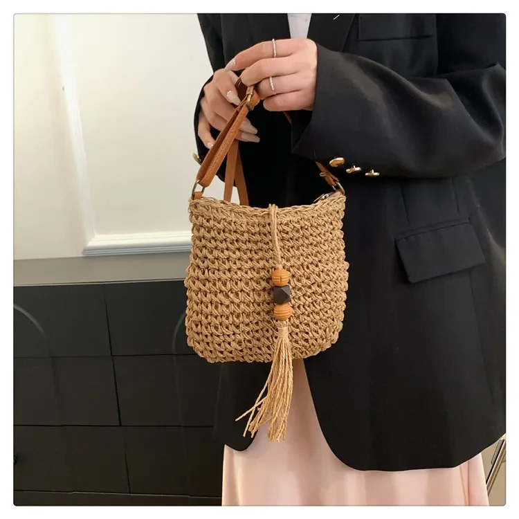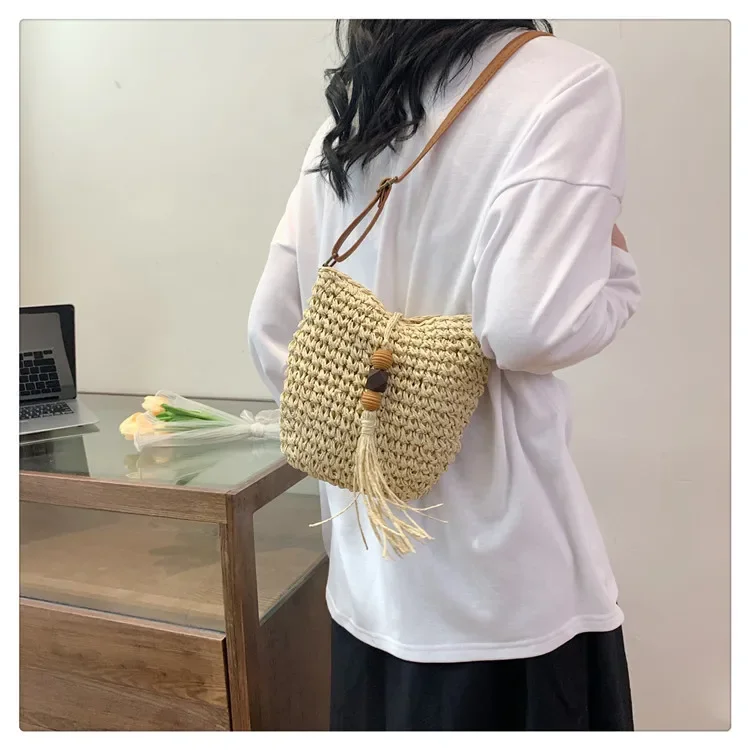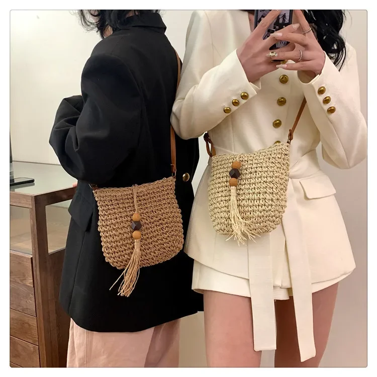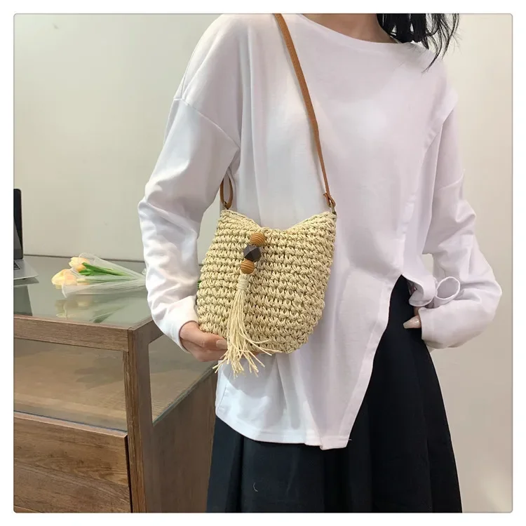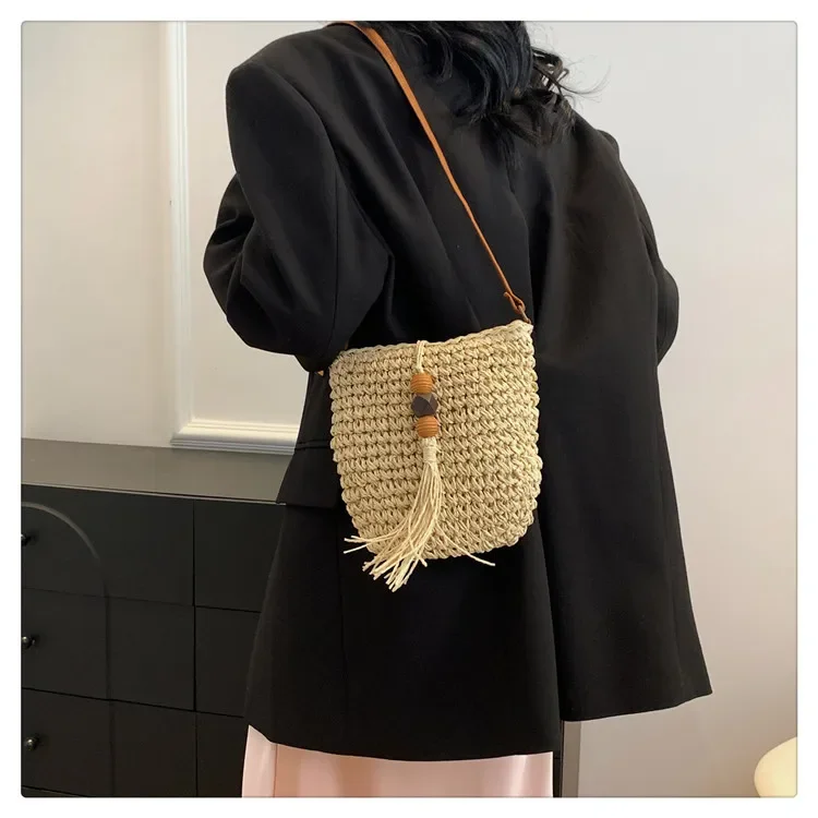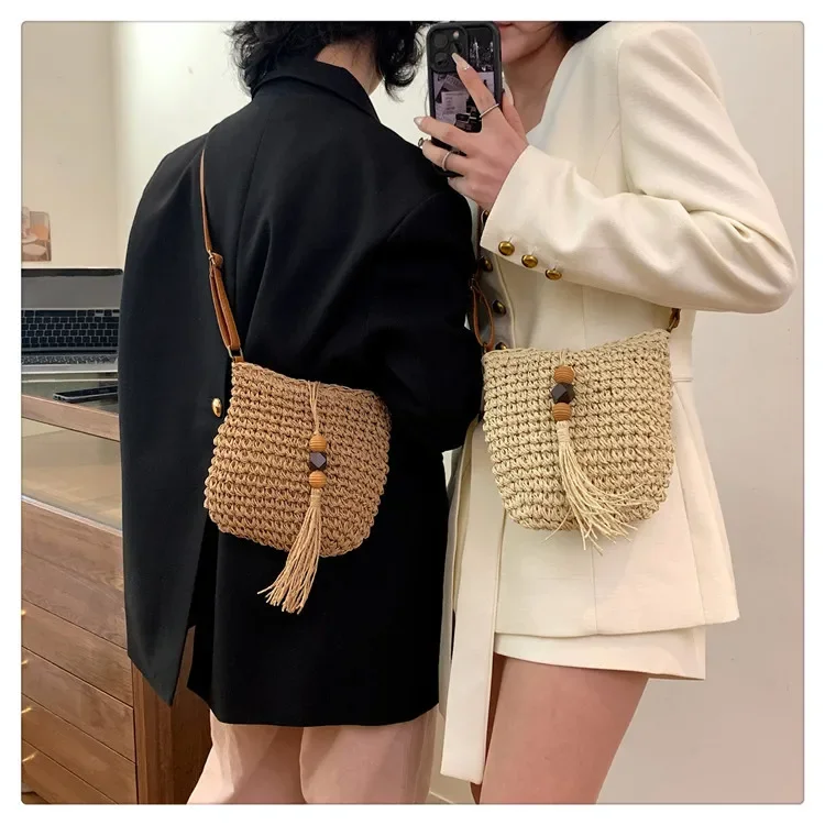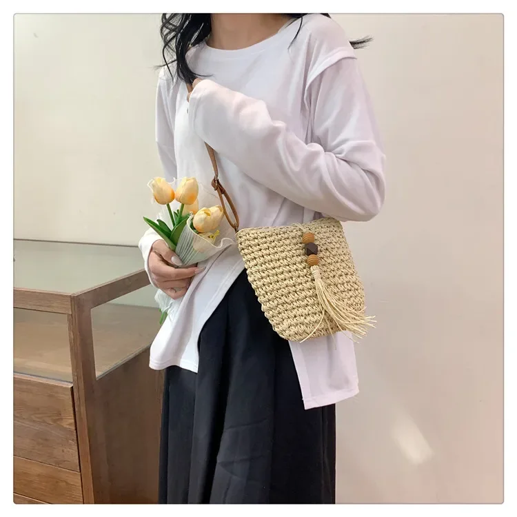 Women Handmade Straw Woven Small Bucket Bag Fashion Crossbody Shoulder Bag Ladies Simple Design Handbag Summer Travel Beach Bag
