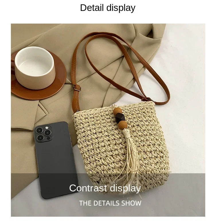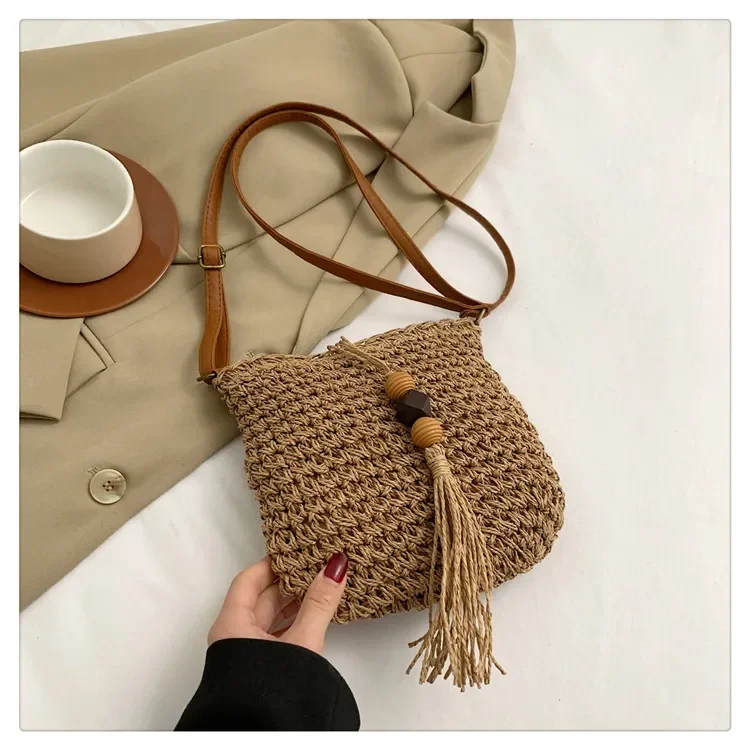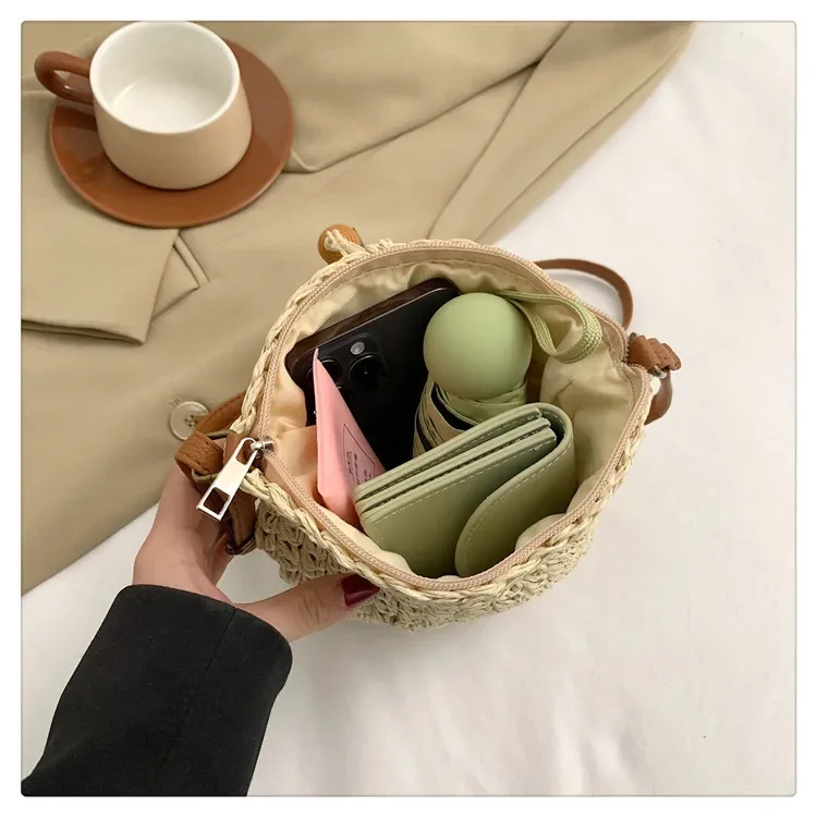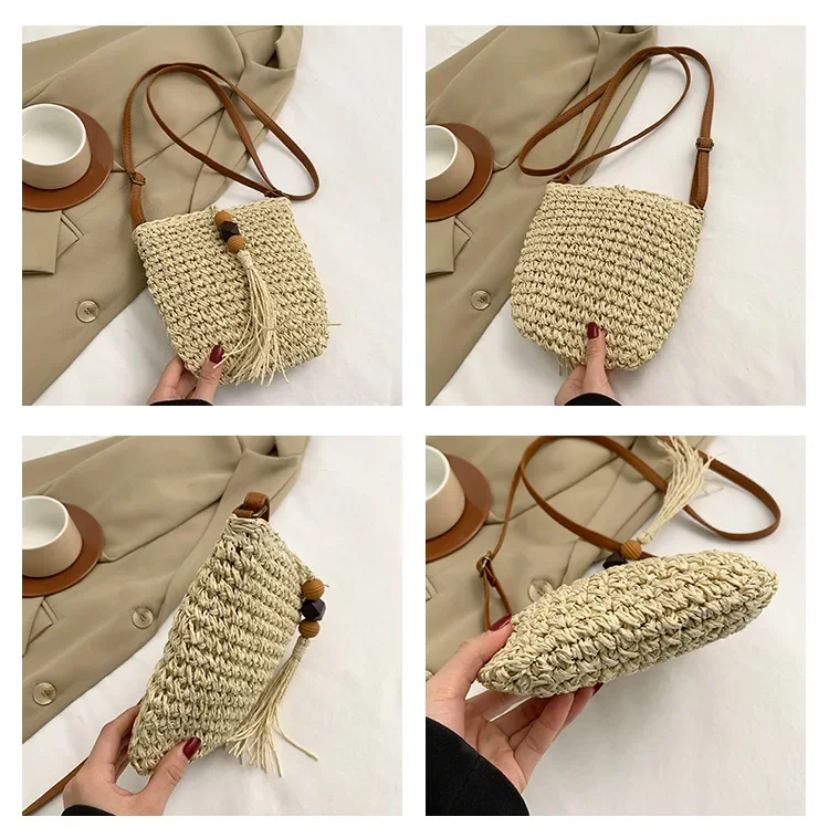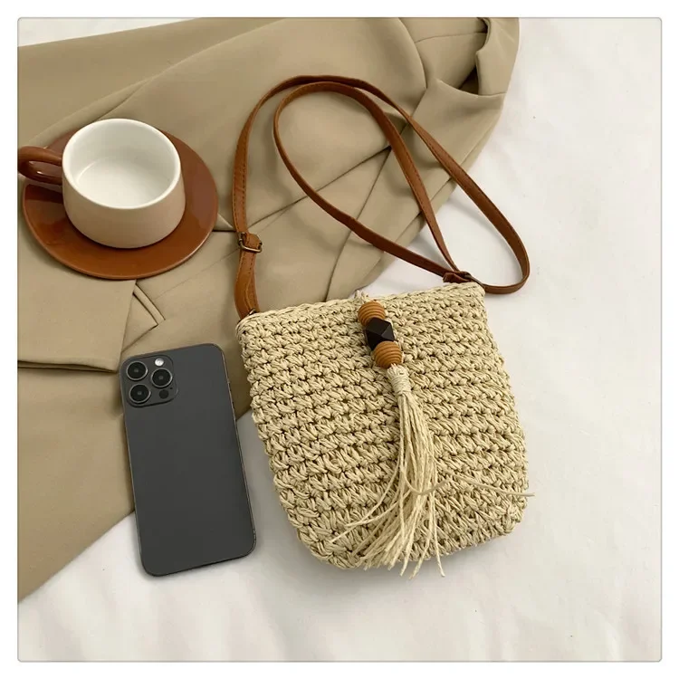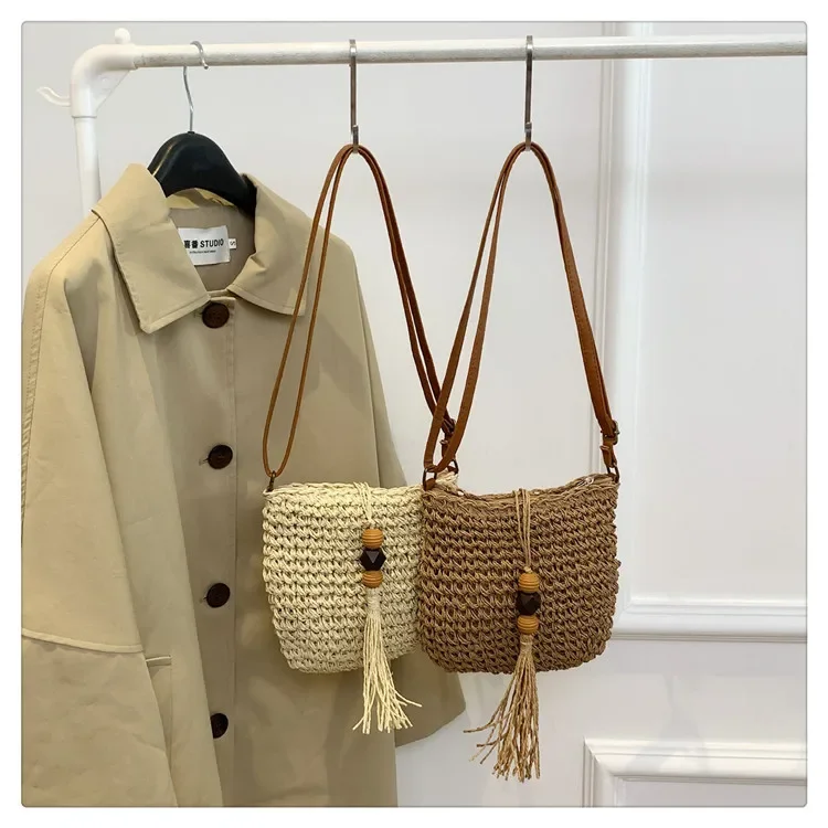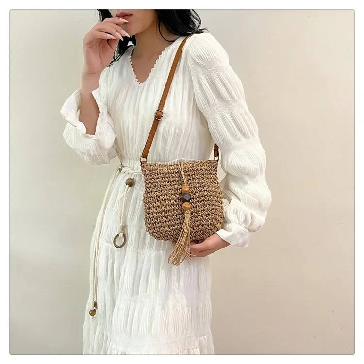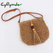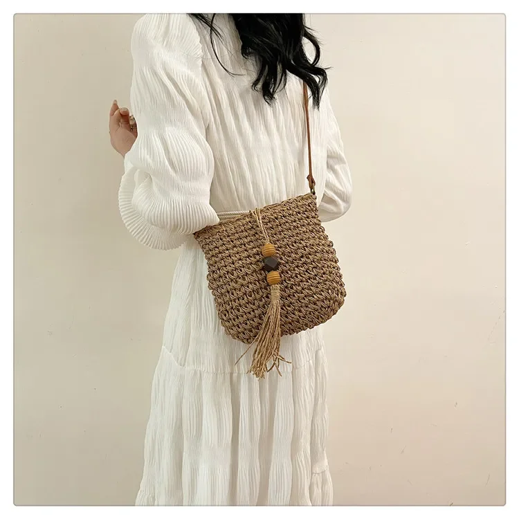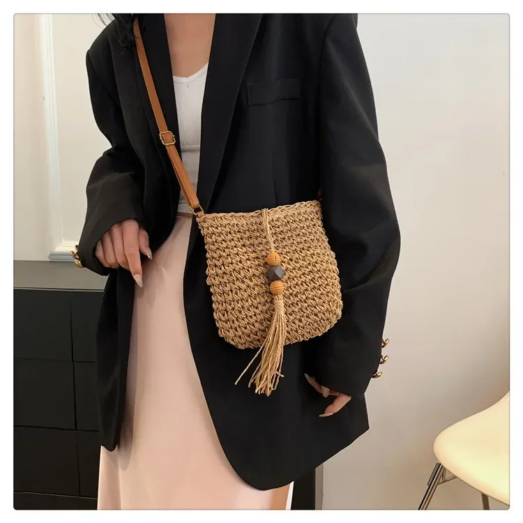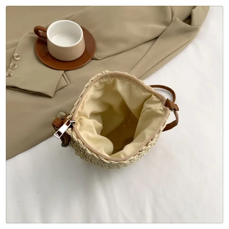 Women Handmade Straw Woven Small Bucket Bag Fashion Crossbody Shoulder Bag Ladies Simple Design Handbag Summer Travel Beach Bag