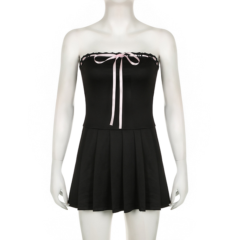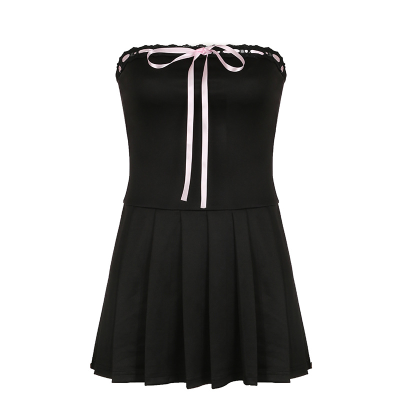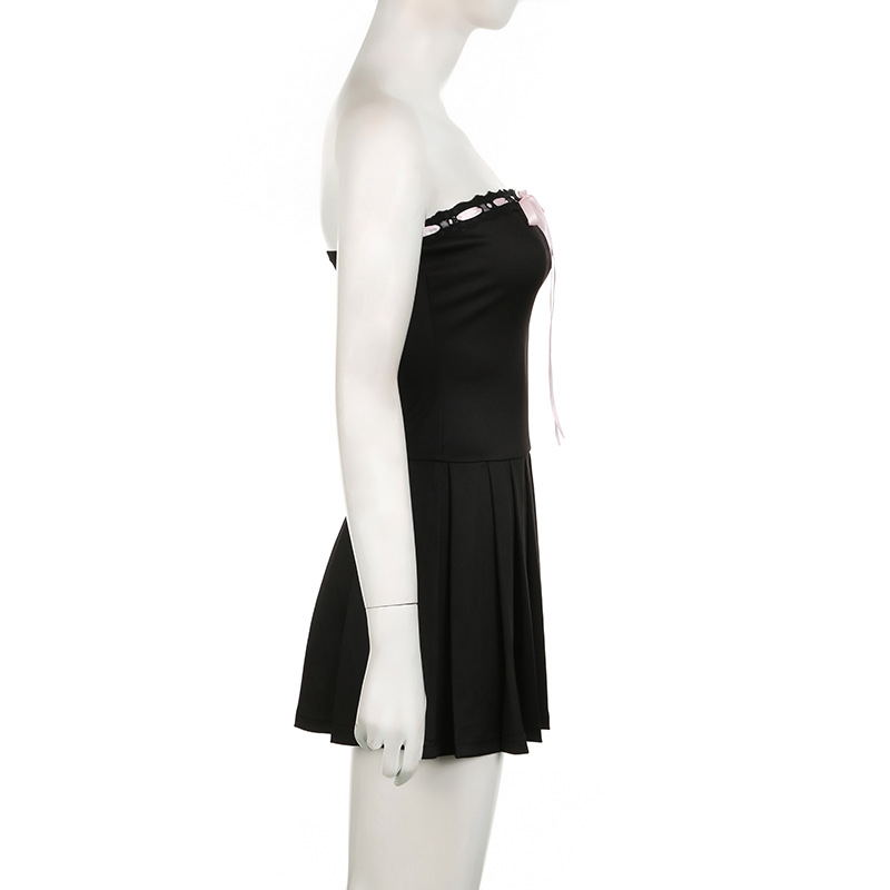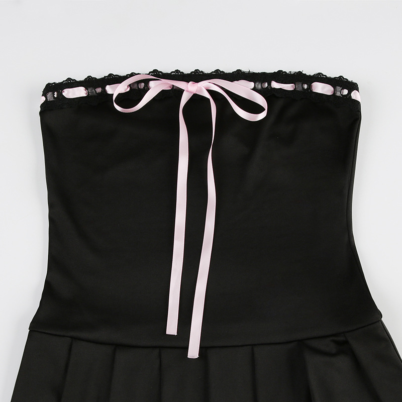 Women Sweet Lace Trim Bow Pleated Dress Mini Coquette Korean Fashion Square Neck Autumn Dress Clothes Kawaii Lolita