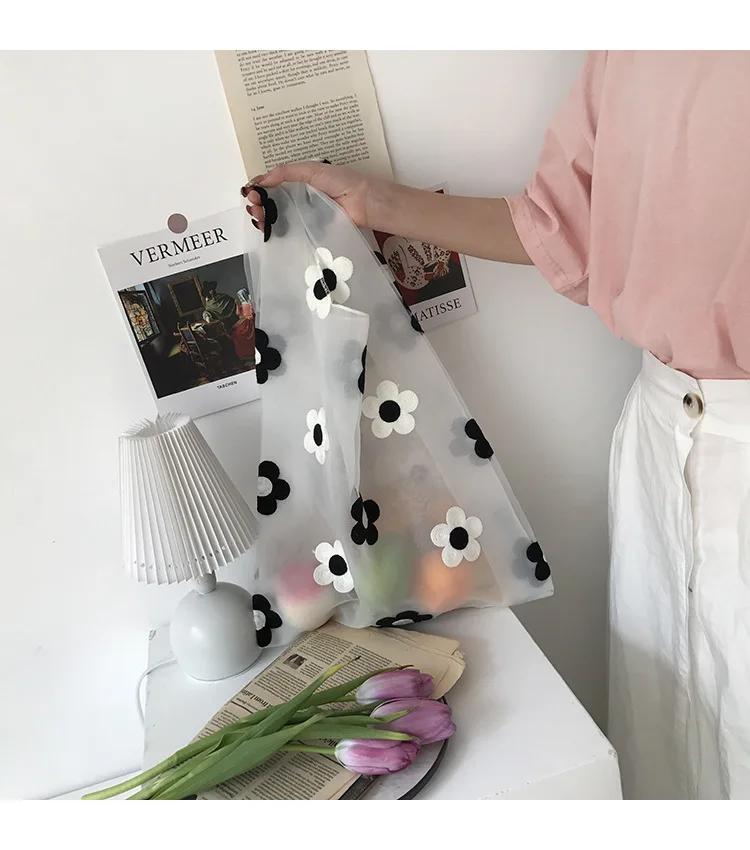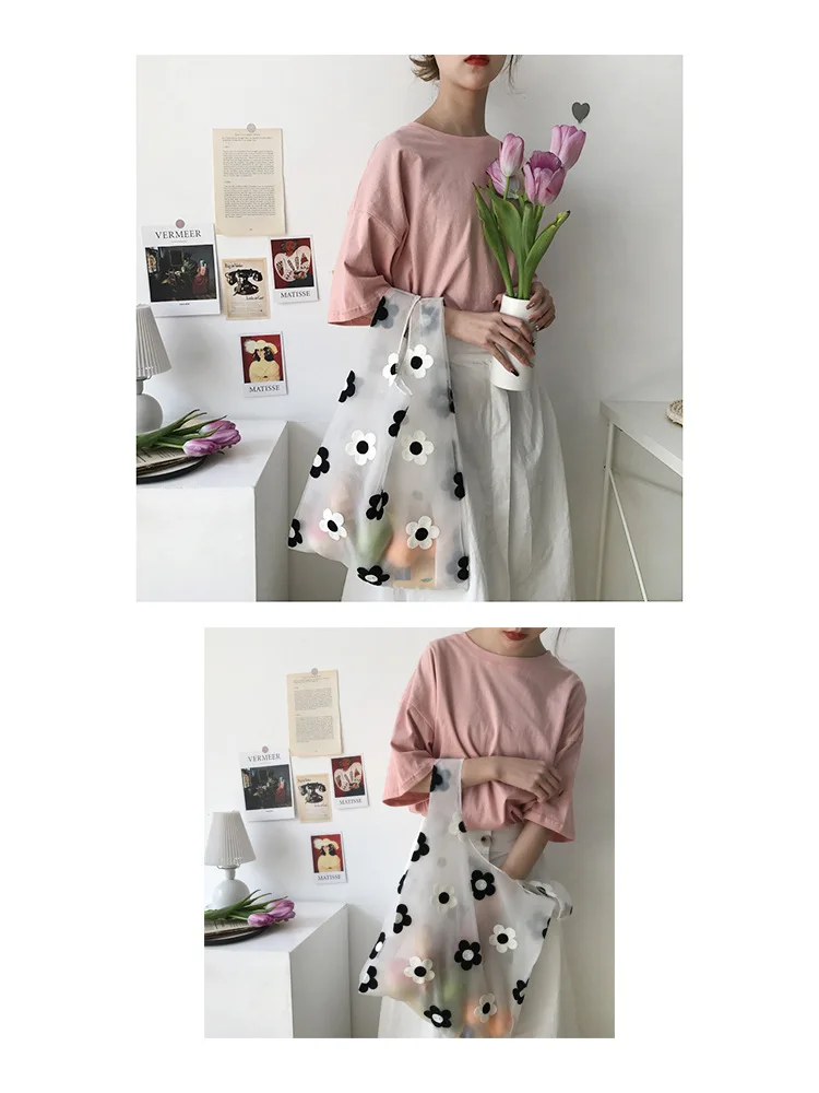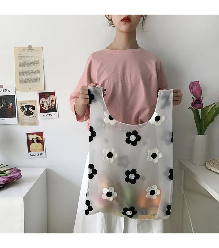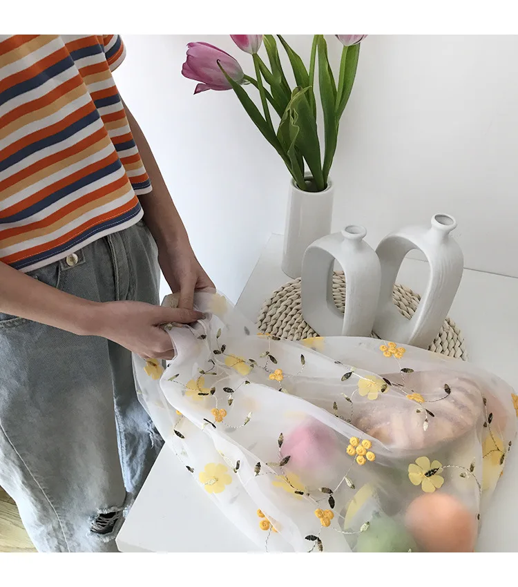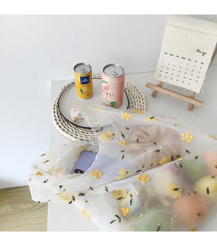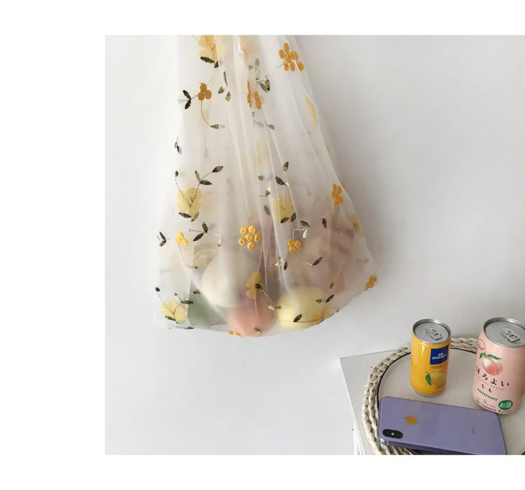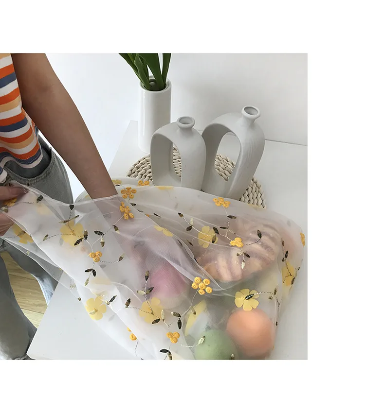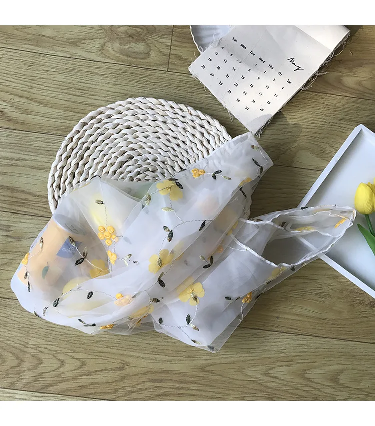 Women Transparent Tote Double Organza Yarn Cloth Bags Embroidery Flowers Handbag High Quality Eco Shopping Bag Purses For Girls