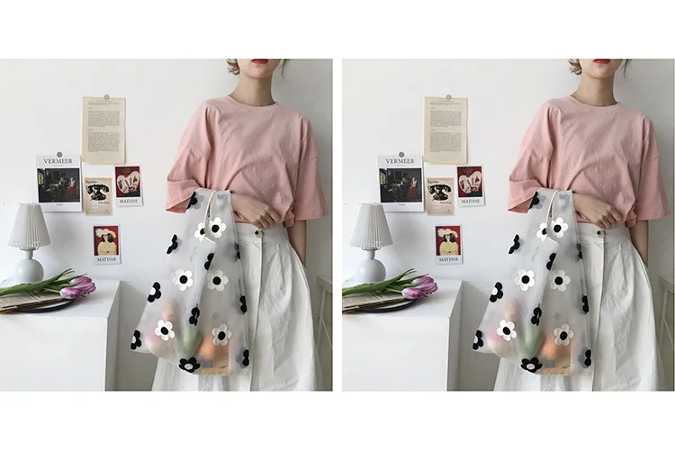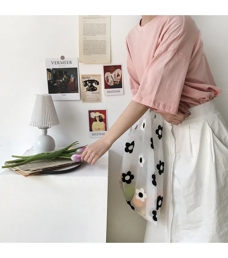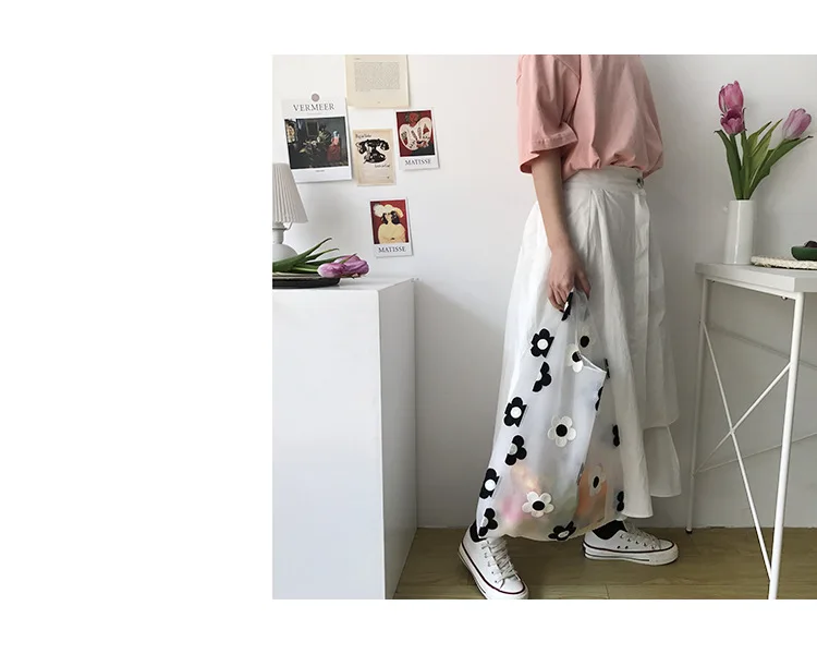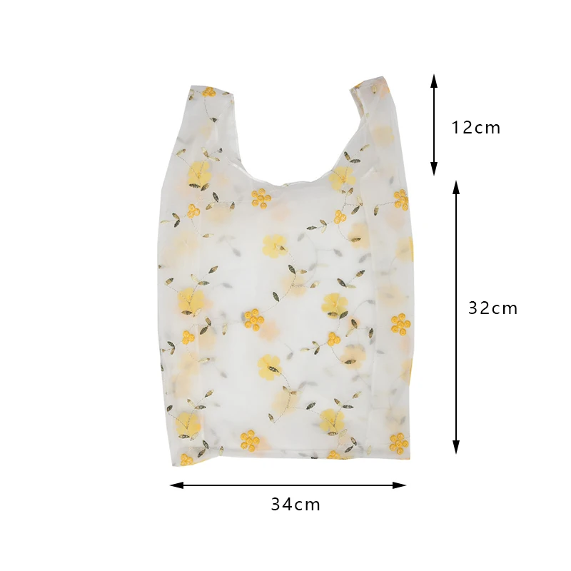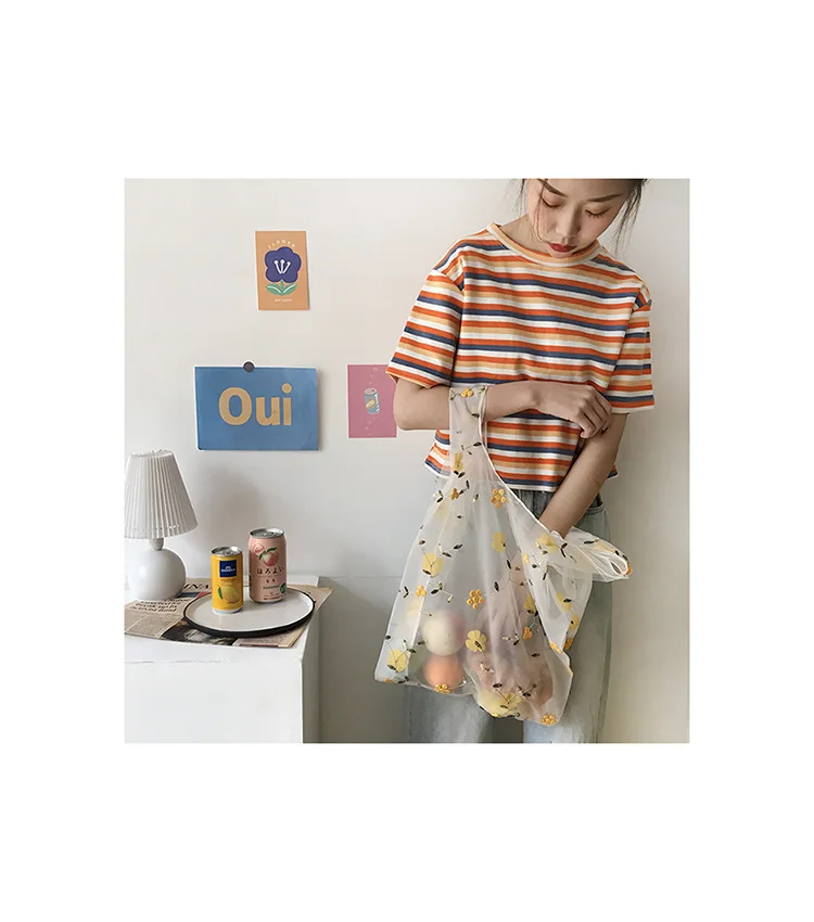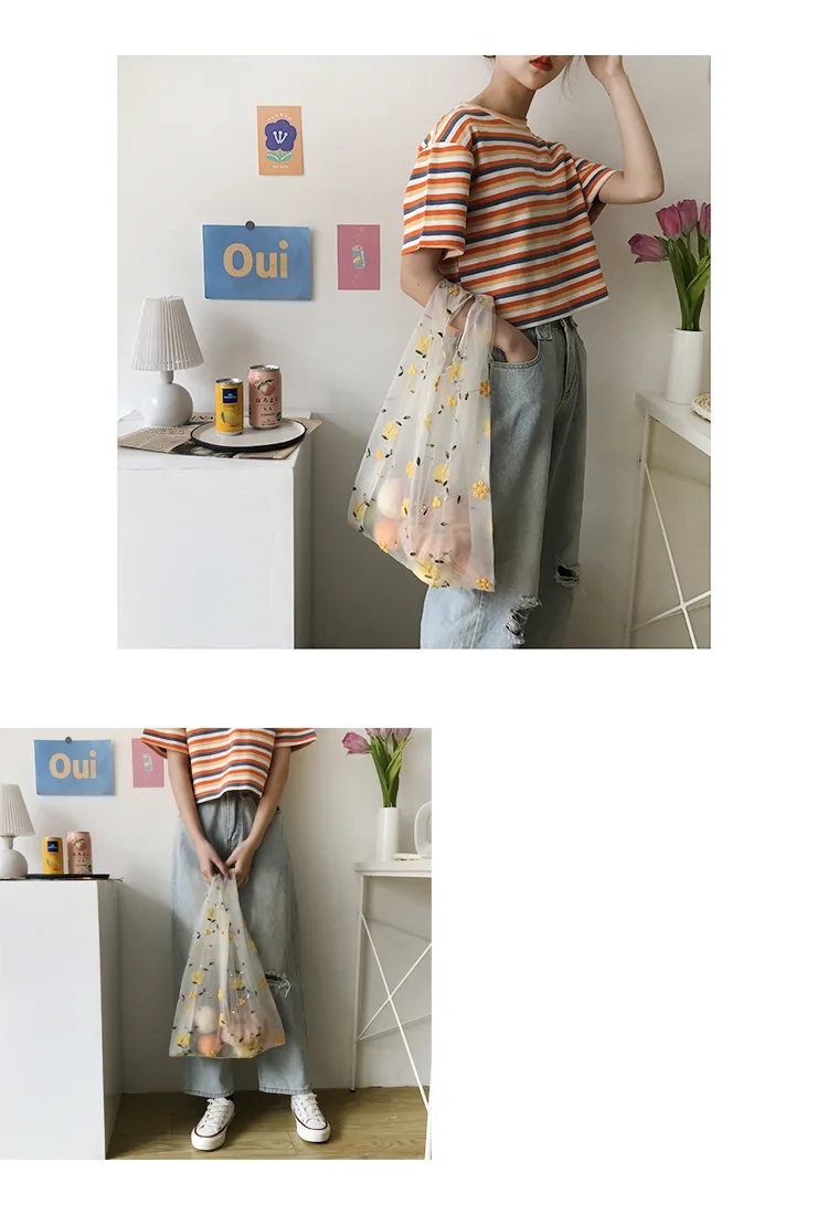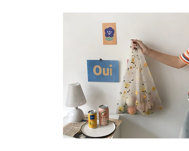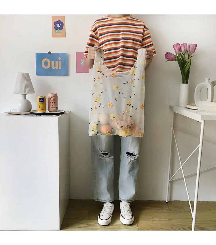 Women Transparent Tote Double Organza Yarn Cloth Bags Embroidery Flowers Handbag High Quality Eco Shopping Bag Purses For Girls