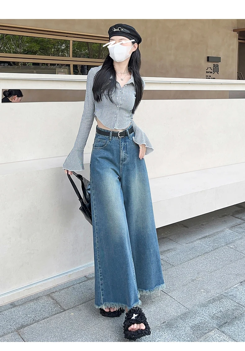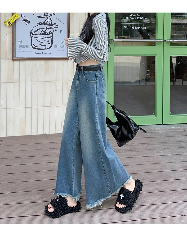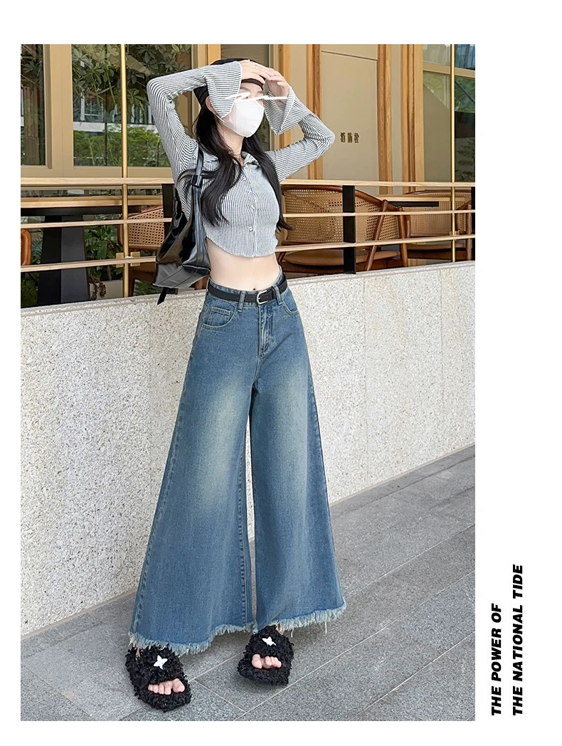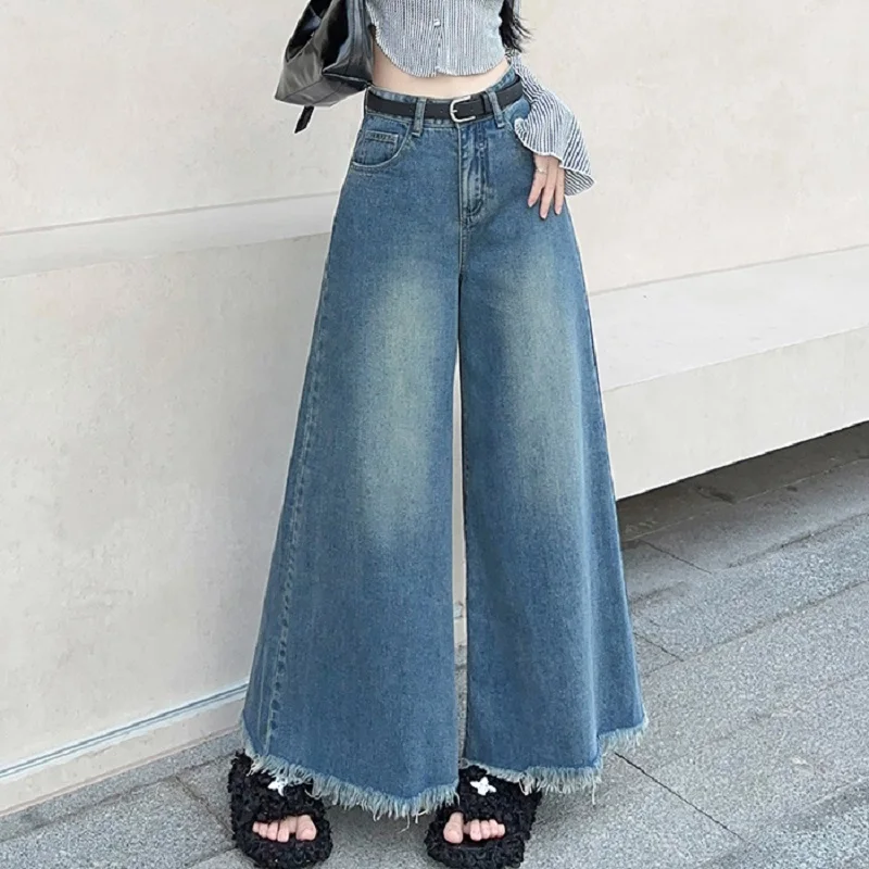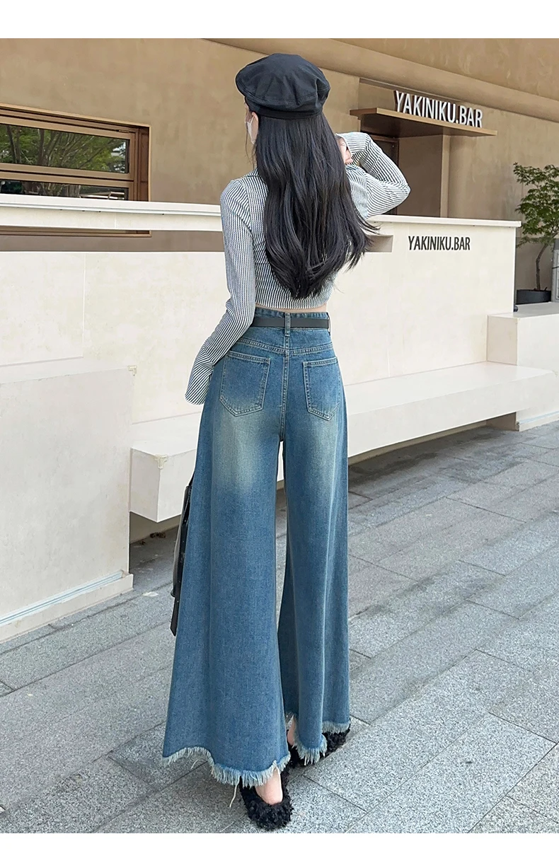 Women's American Vintage Washed Wide Leg Jeans Street Casual Blue Denim Trousers Female High Waist Straight Pants