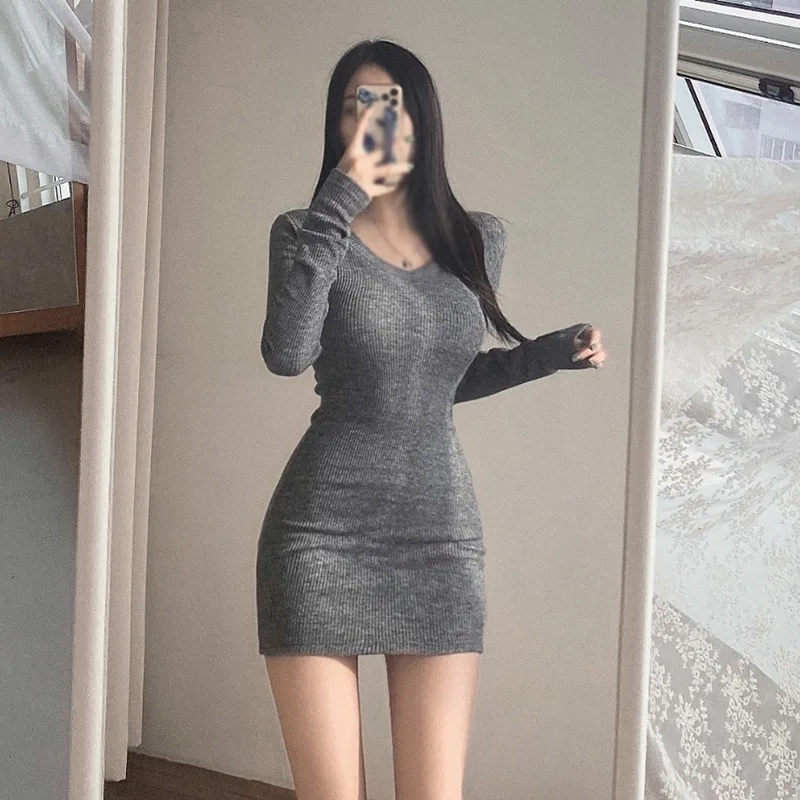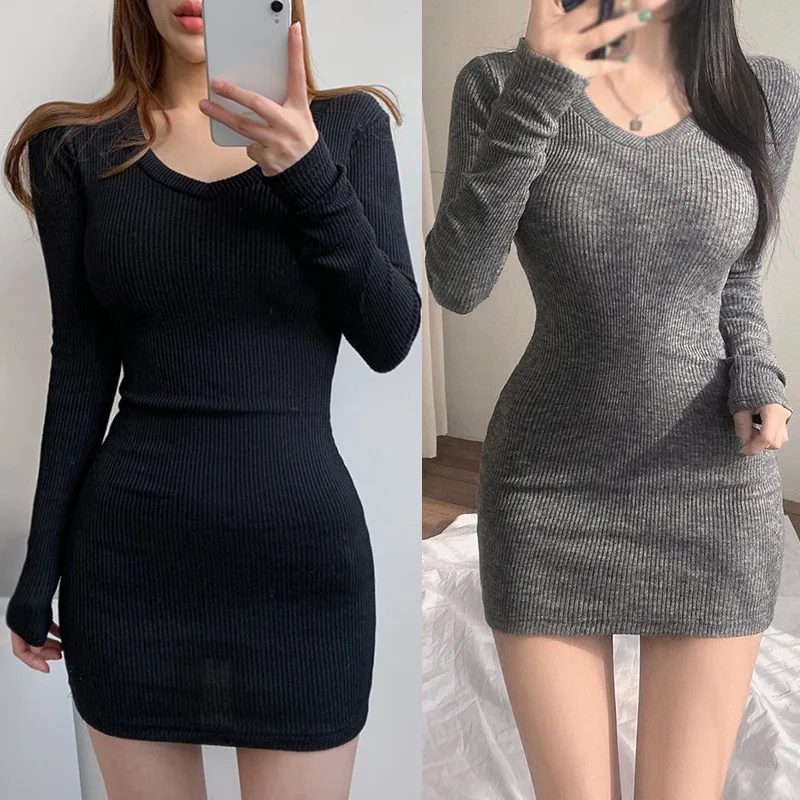 Women's Long Sleeves Dress V Neck Slim Sexy Solid Color Pullover Bodycon Elastic Dress Hip Wrap All-Match Hotgirl Stree Wear