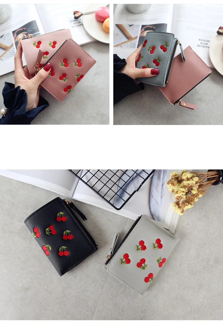 ?Women's Vertical Buckle Cherry Embroidered Short Trend Small Wallet New Student Simple Fashion Wallet Women's Purse